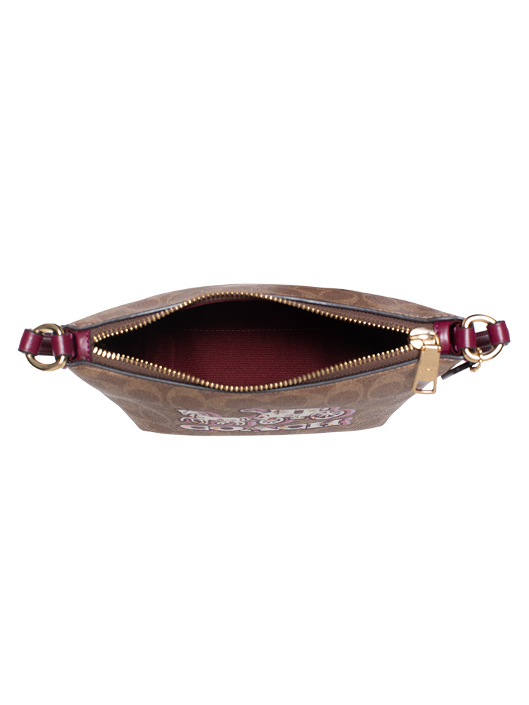 Signature coated canvas with fabric lining. The bag features an zip closure, gold tone hardware, one slip pocket and single handle, adjustable and removable strap.