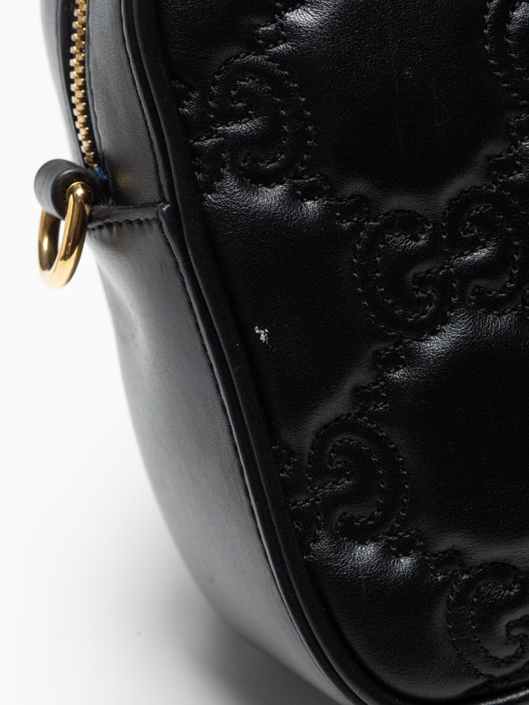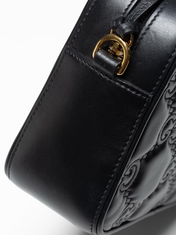 This bag is crafted of calfskin leather material with GG embossed. This bag features a leather shoulder strap, fabric strap, and a double GG logo at the front. The top zipper opens to a fabric interior with a pocket.