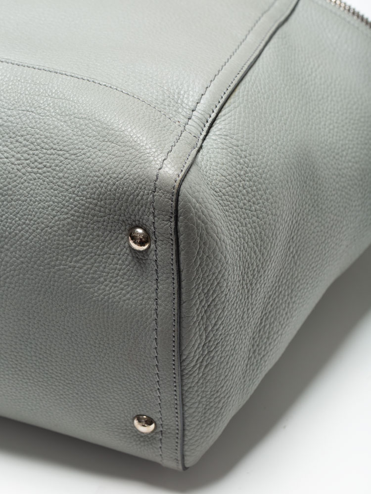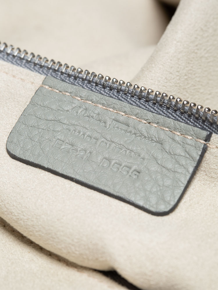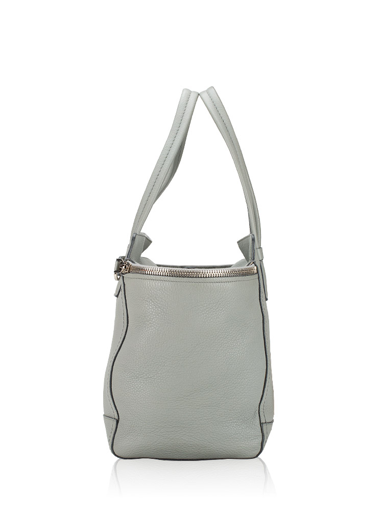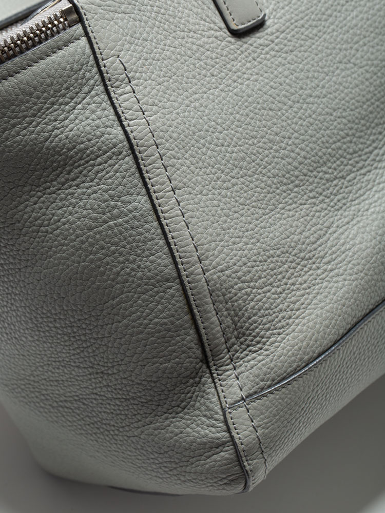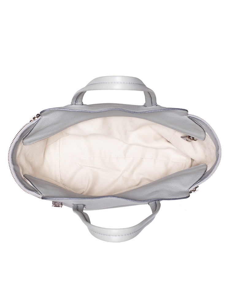 Crafted of calfskin leather with silver hardware. The bag zips opens to a microfiber interior with zipper and patch pockets.