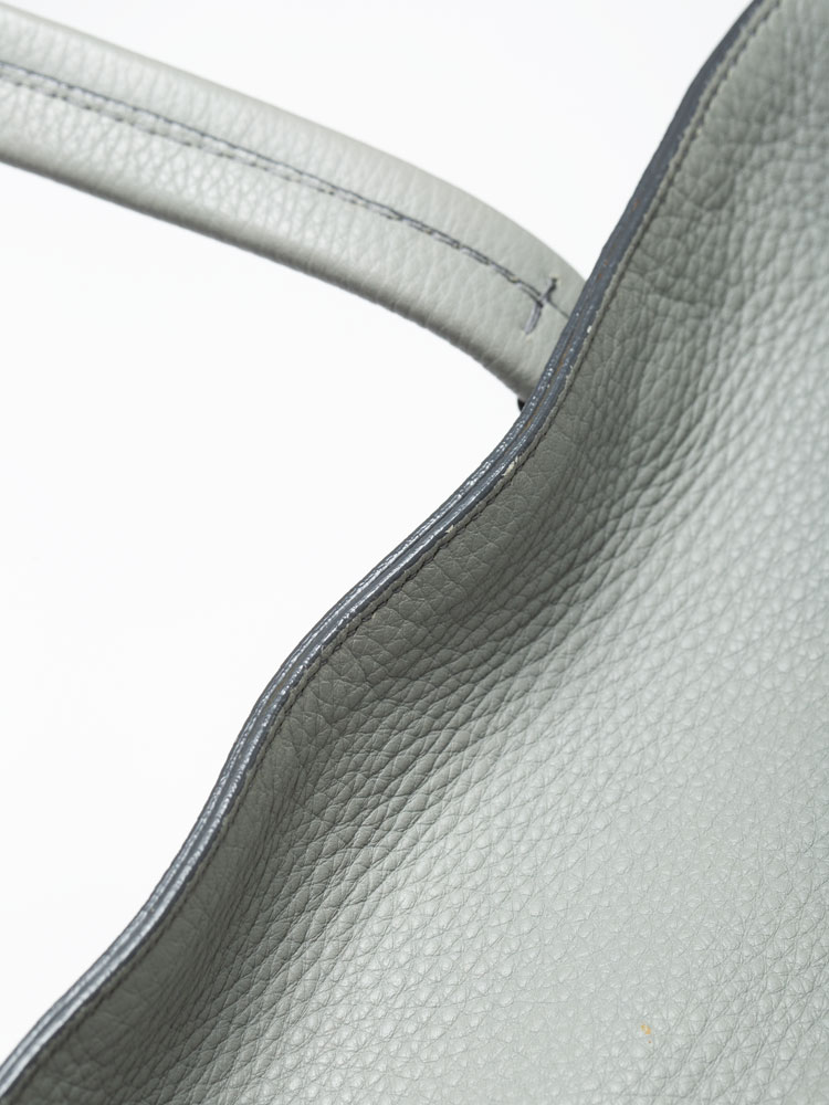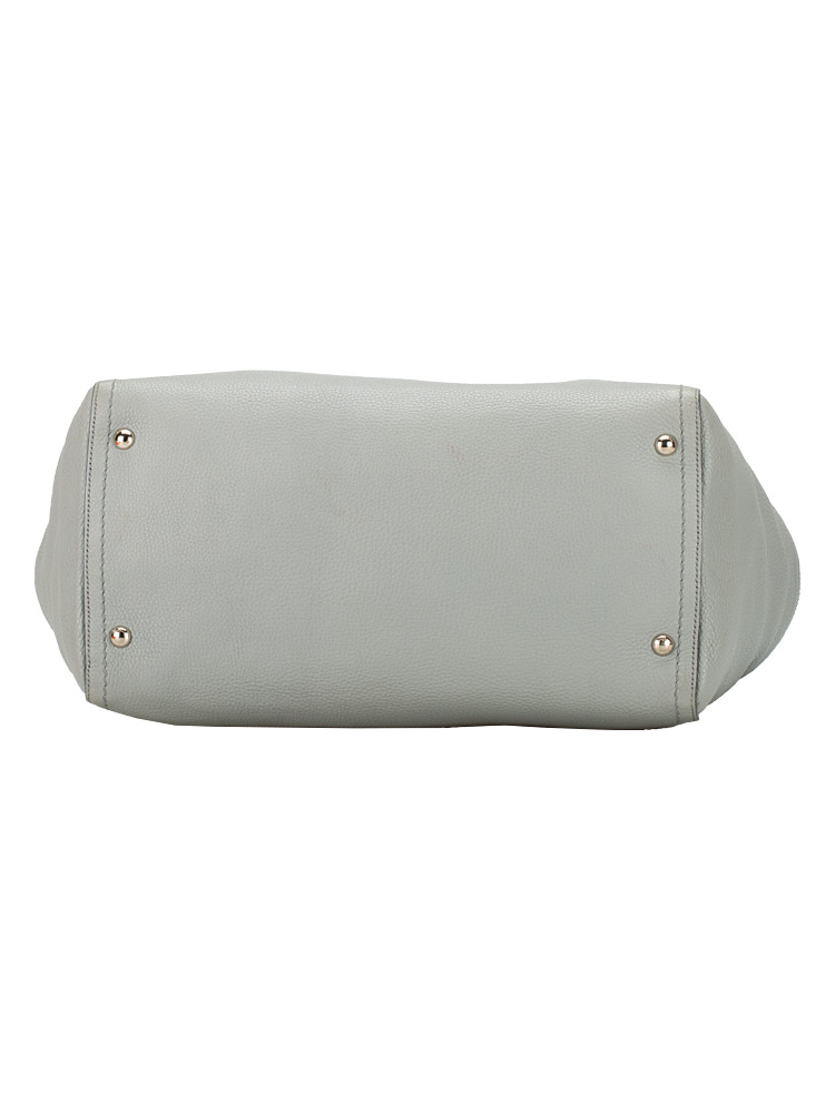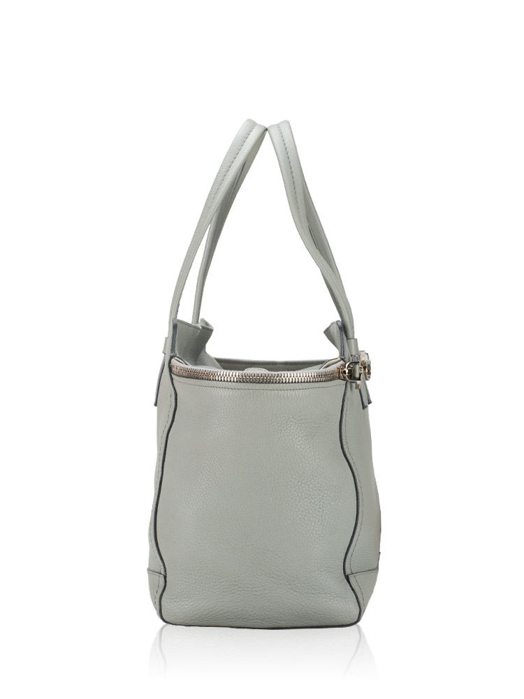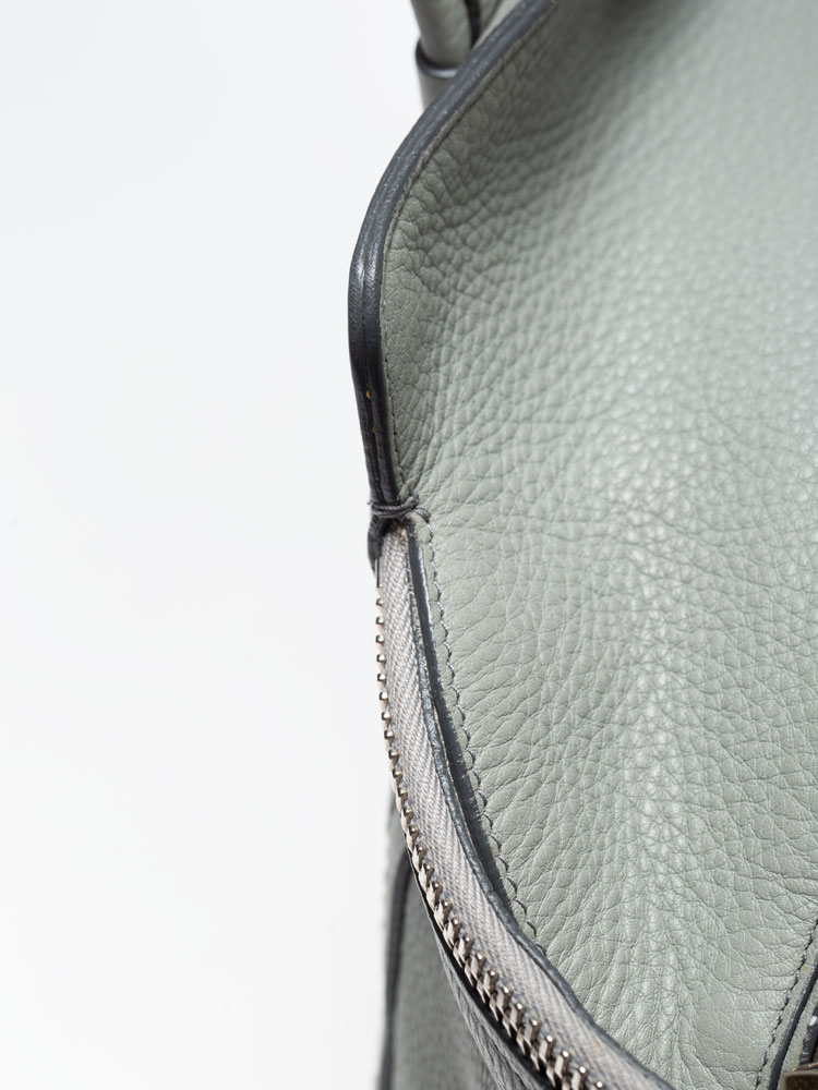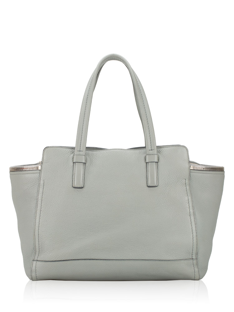 Crafted of calfskin leather with silver hardware. The bag zips opens to a microfiber interior with zipper and patch pockets.