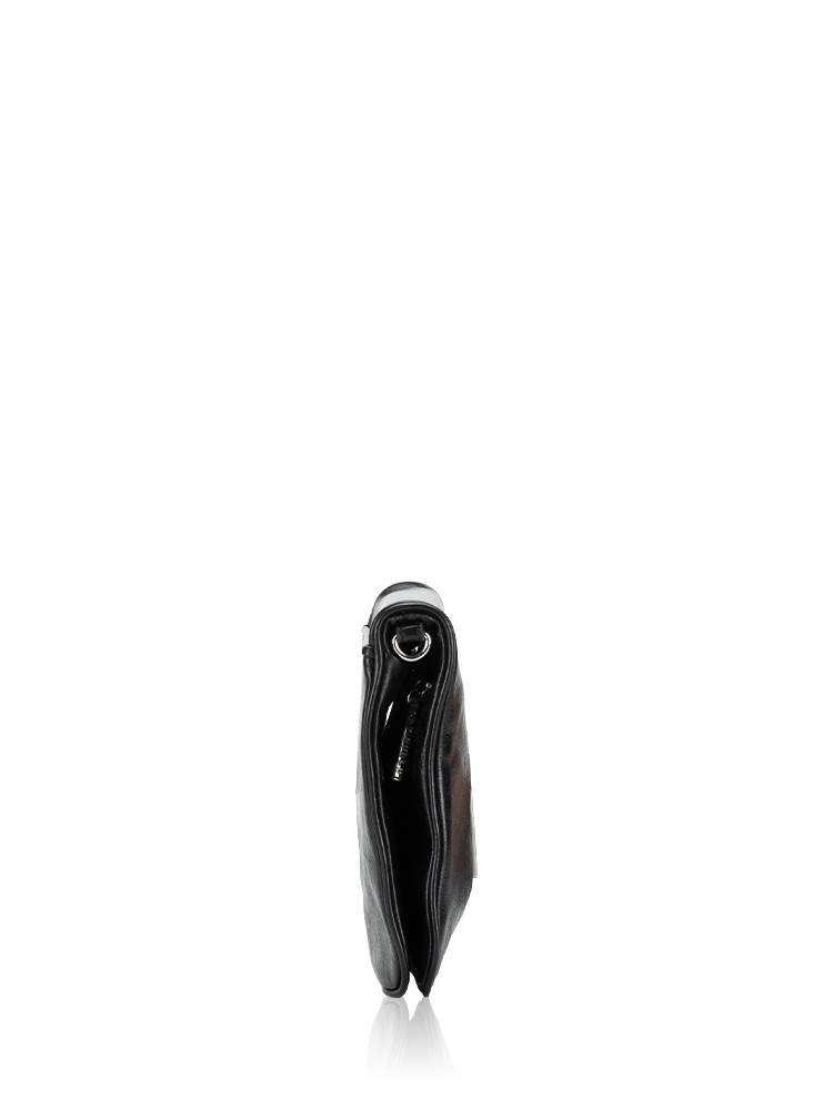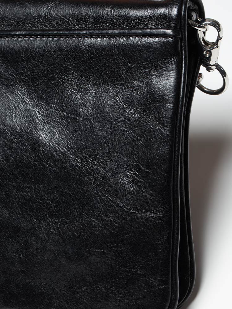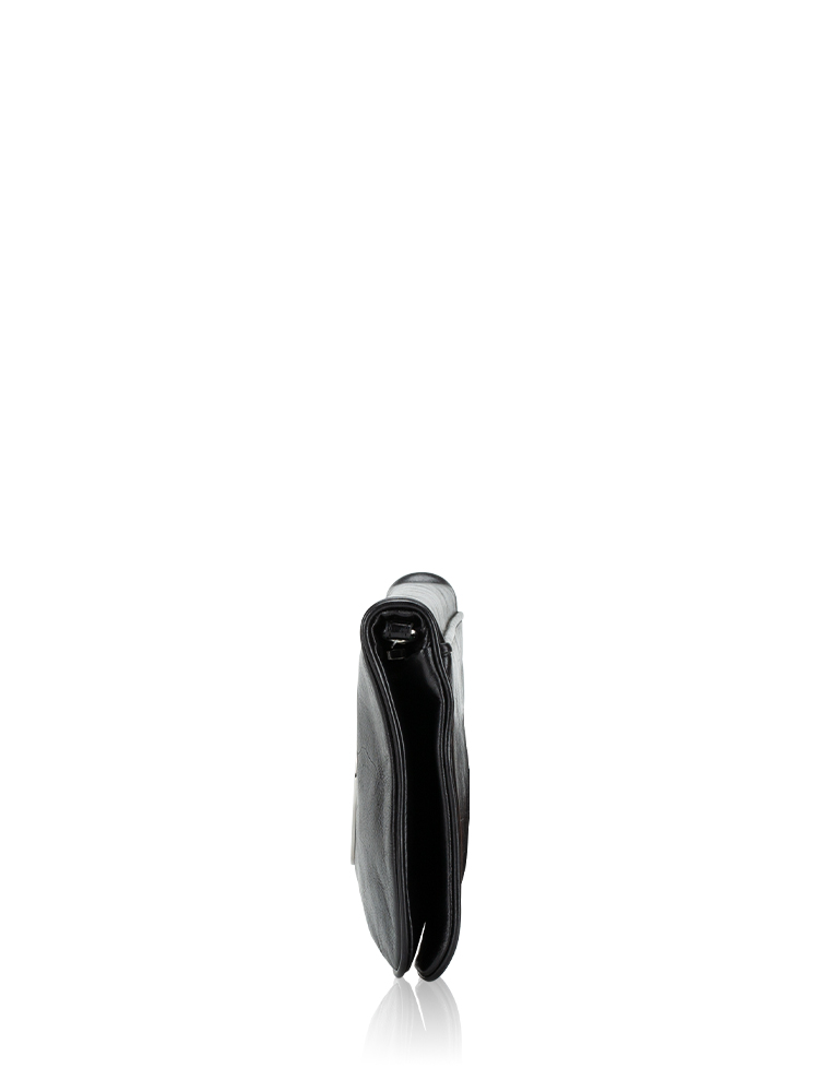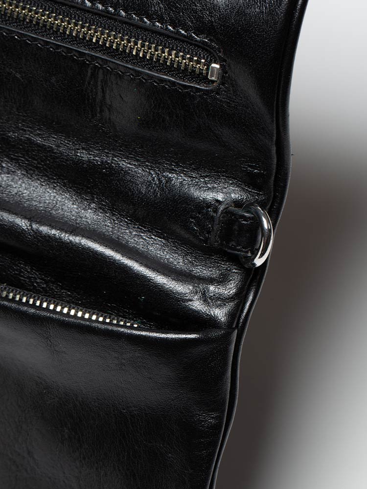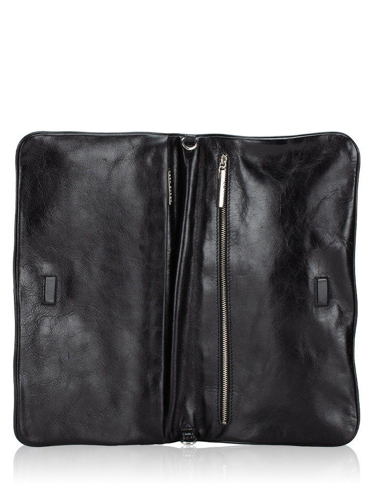 Made of leather material. The bag features a magnetic closure that opens to fabric lining with two zip compartments.