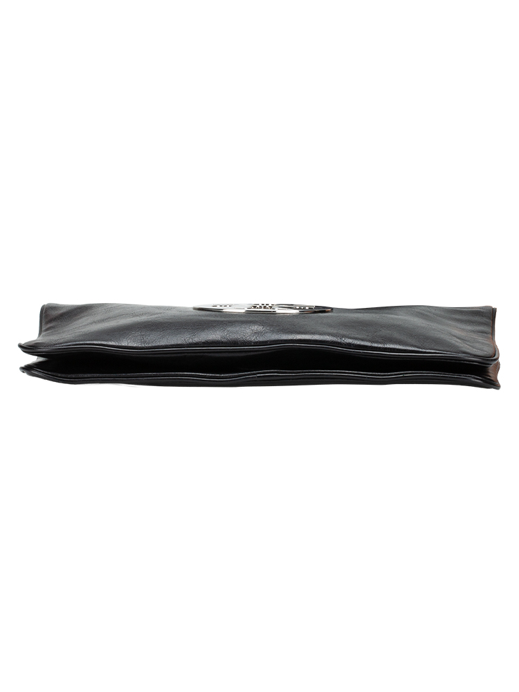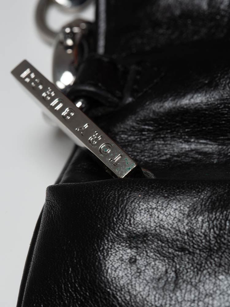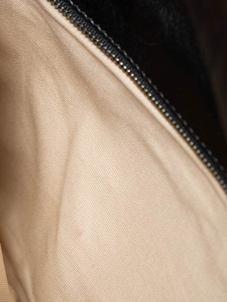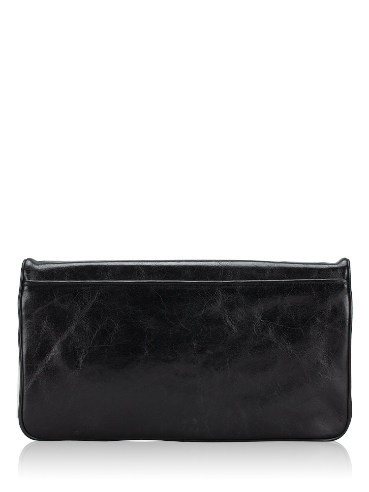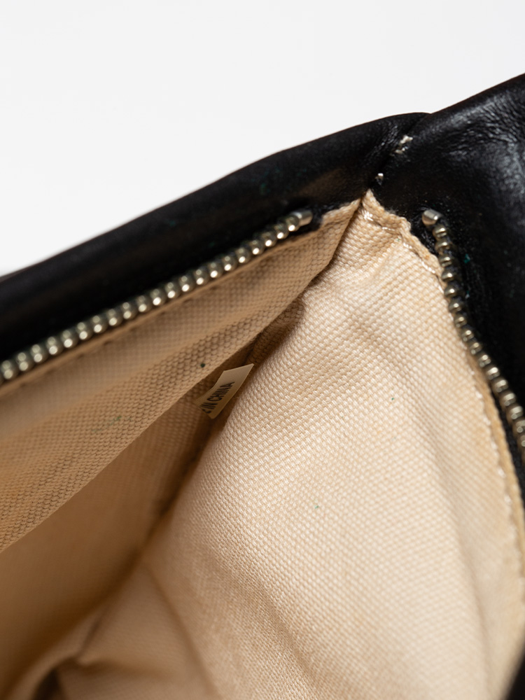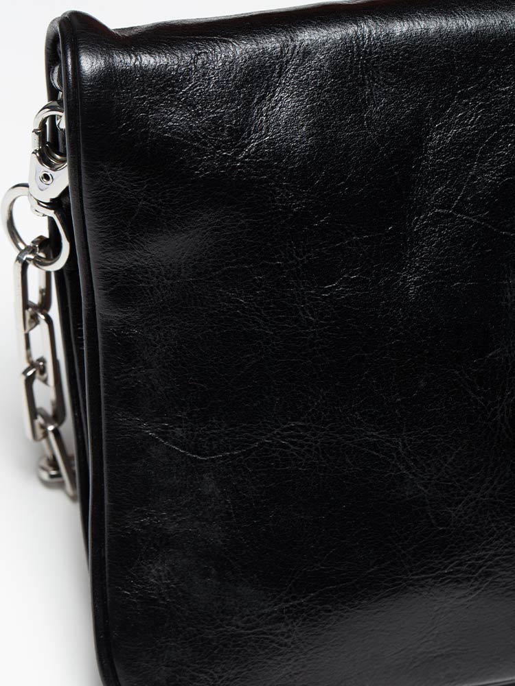 Made of leather material. The bag features a magnetic closure that opens to fabric lining with two zip compartments.