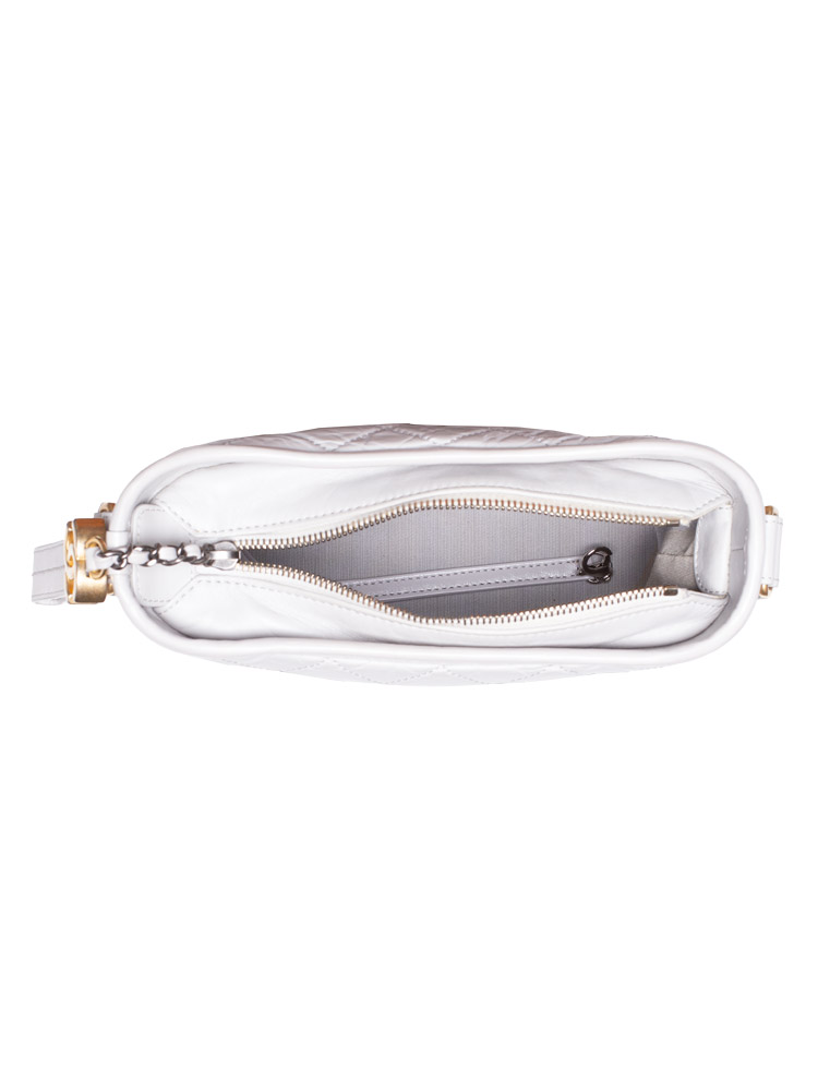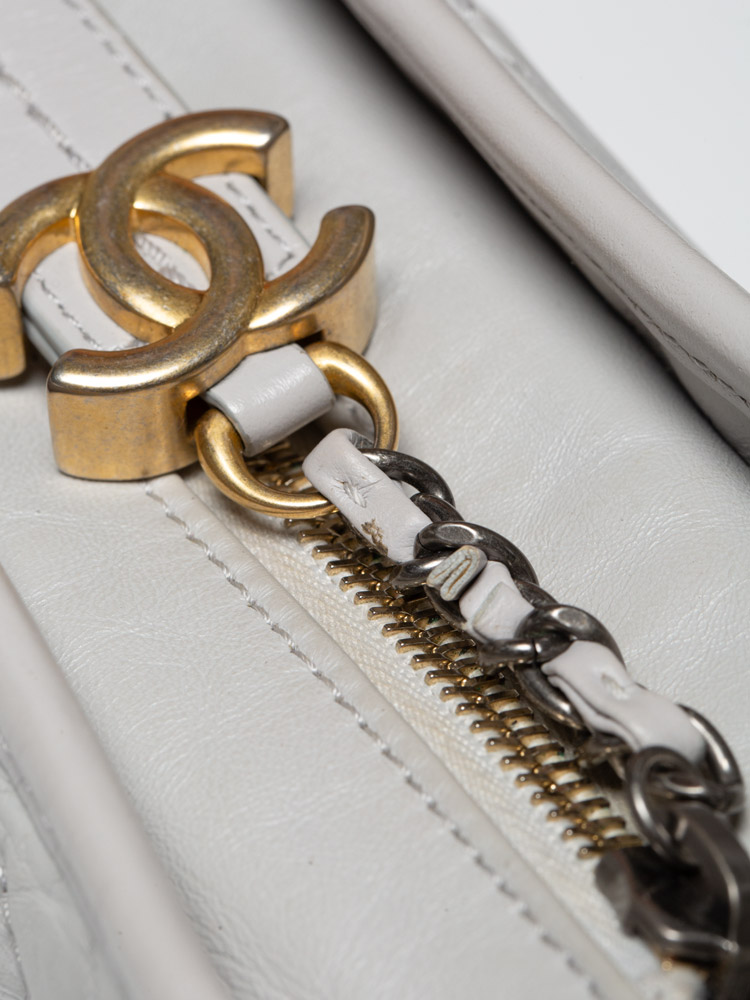 Crafted of calfskin leather, with a leather base. It features an adjustable leather-threaded gradient aged ruthenium to polished gold chain link shoulder strap. The top zipper opens to a fabric interior with zipper and patch pockets.