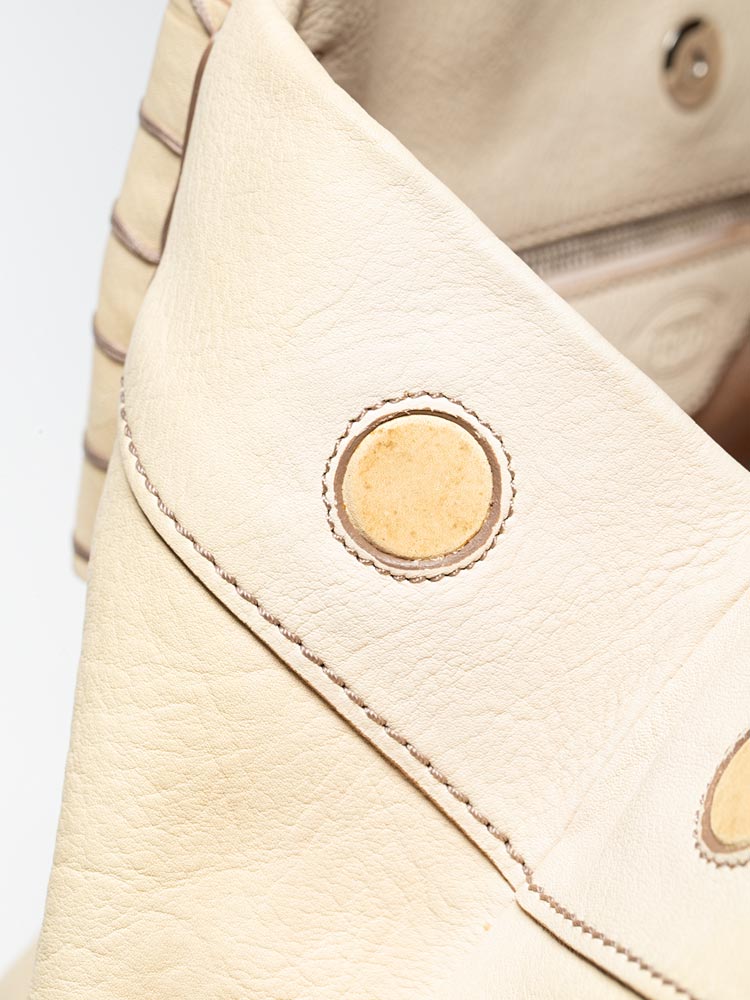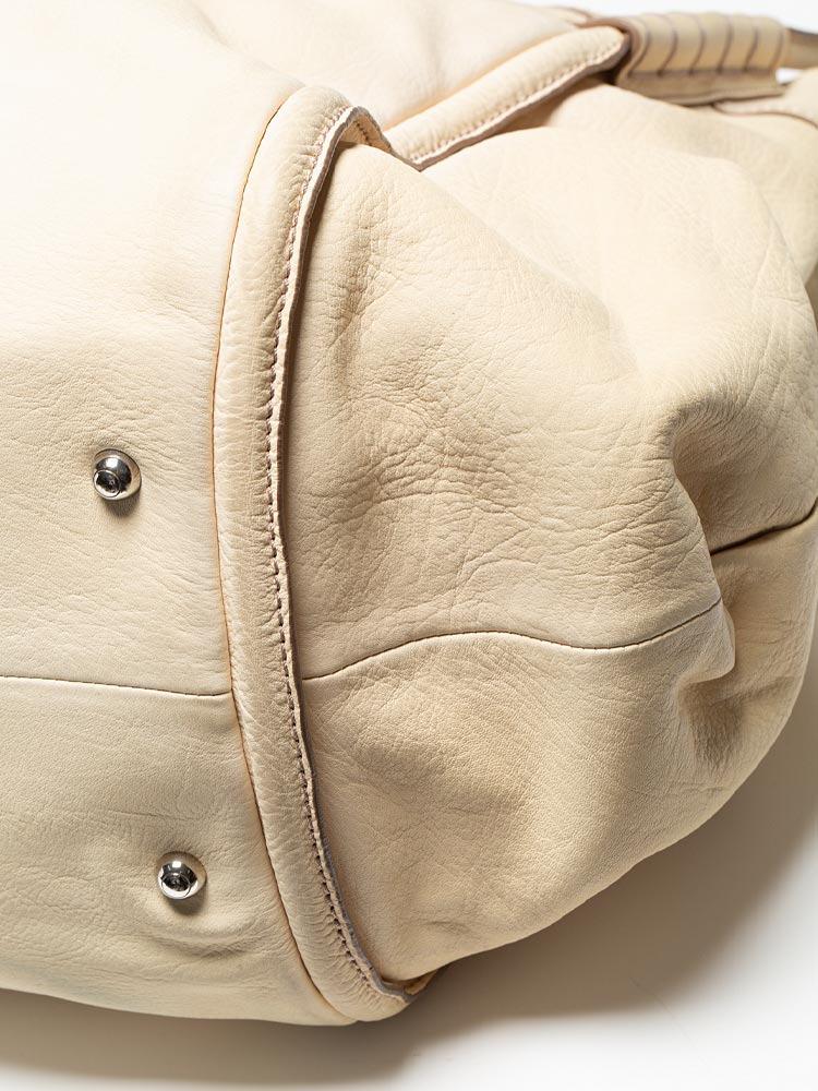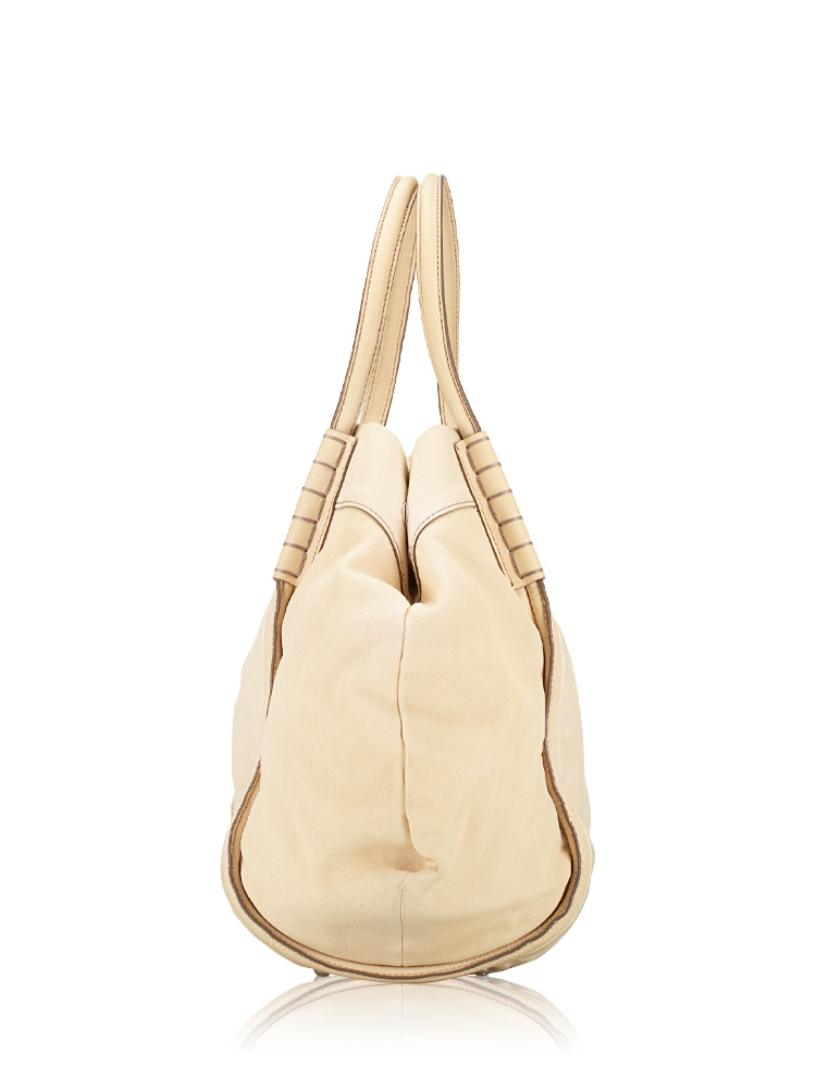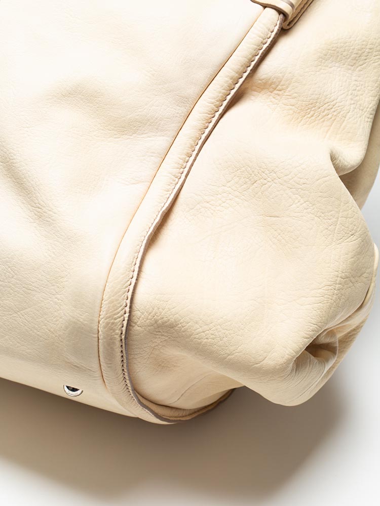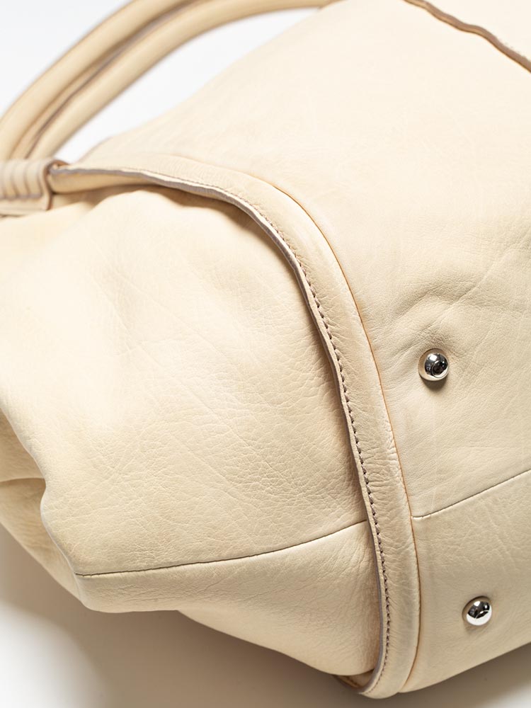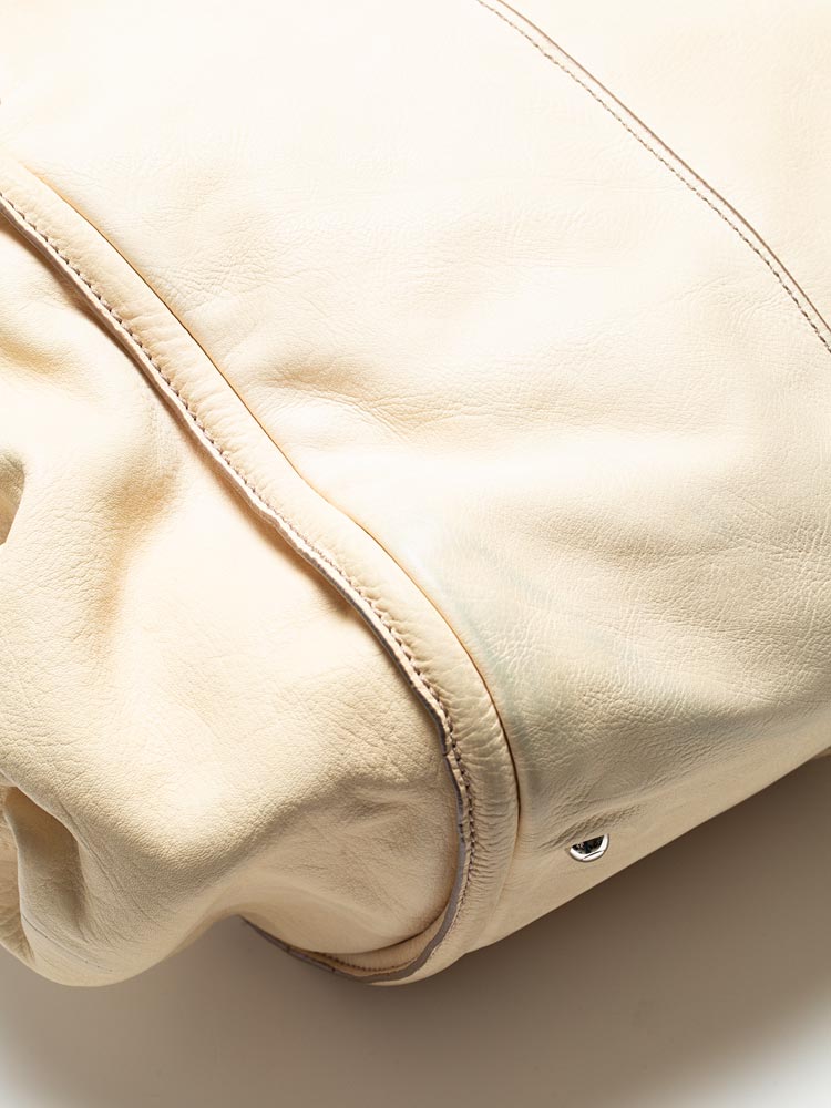 Crafted of structured calfskin leather with thread trim and monogrammed logo on the front. Magnetic snap buttons on the corners to expand and give shape to the bag. The snap button closure opens to jacquard lining with zip pocket.