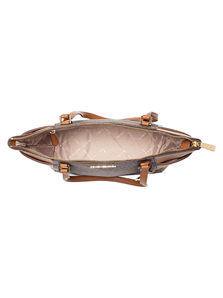 Made of coated canvas and leather. The bag features a zip closure that opens to polyester lining with one zip pocket, exterior two side pockets, double handles strap drop 34 cm.