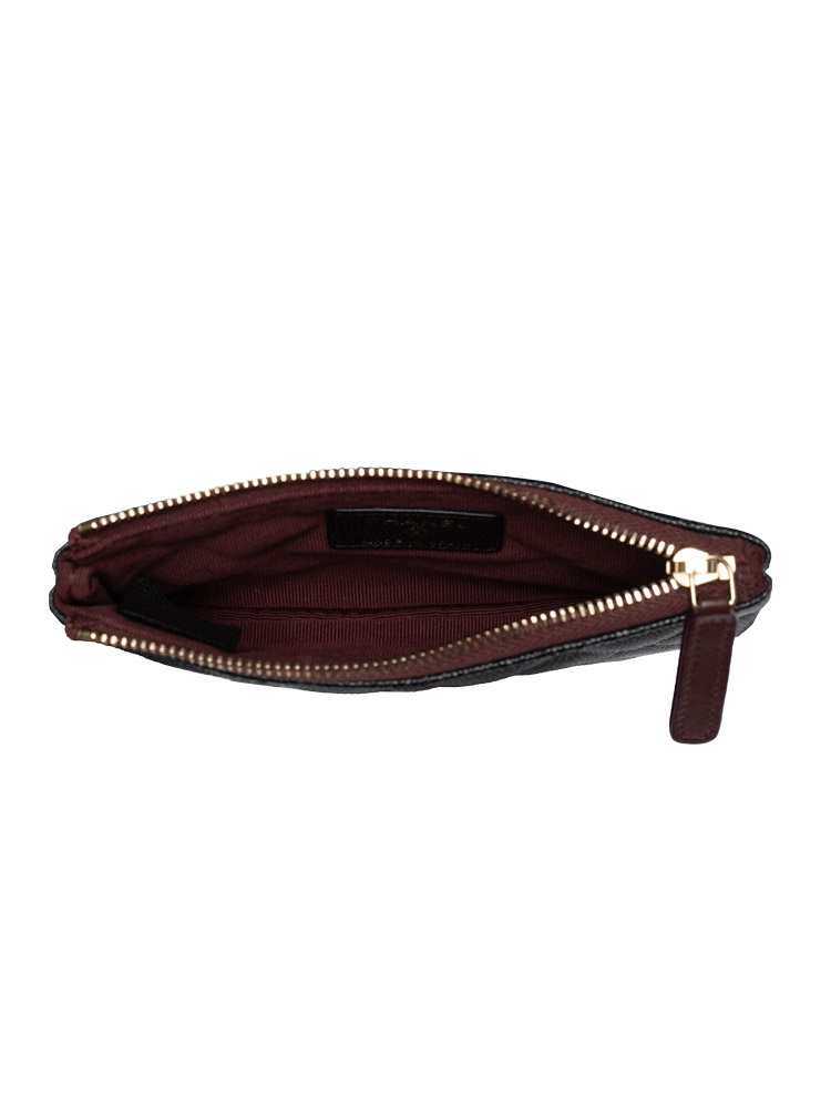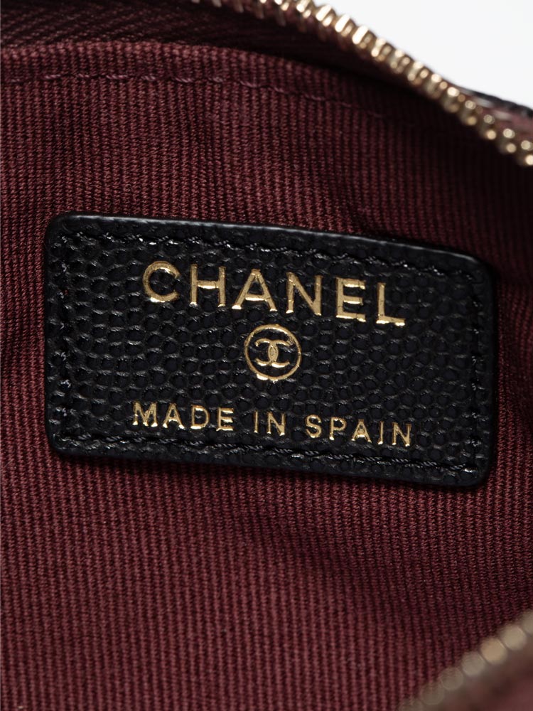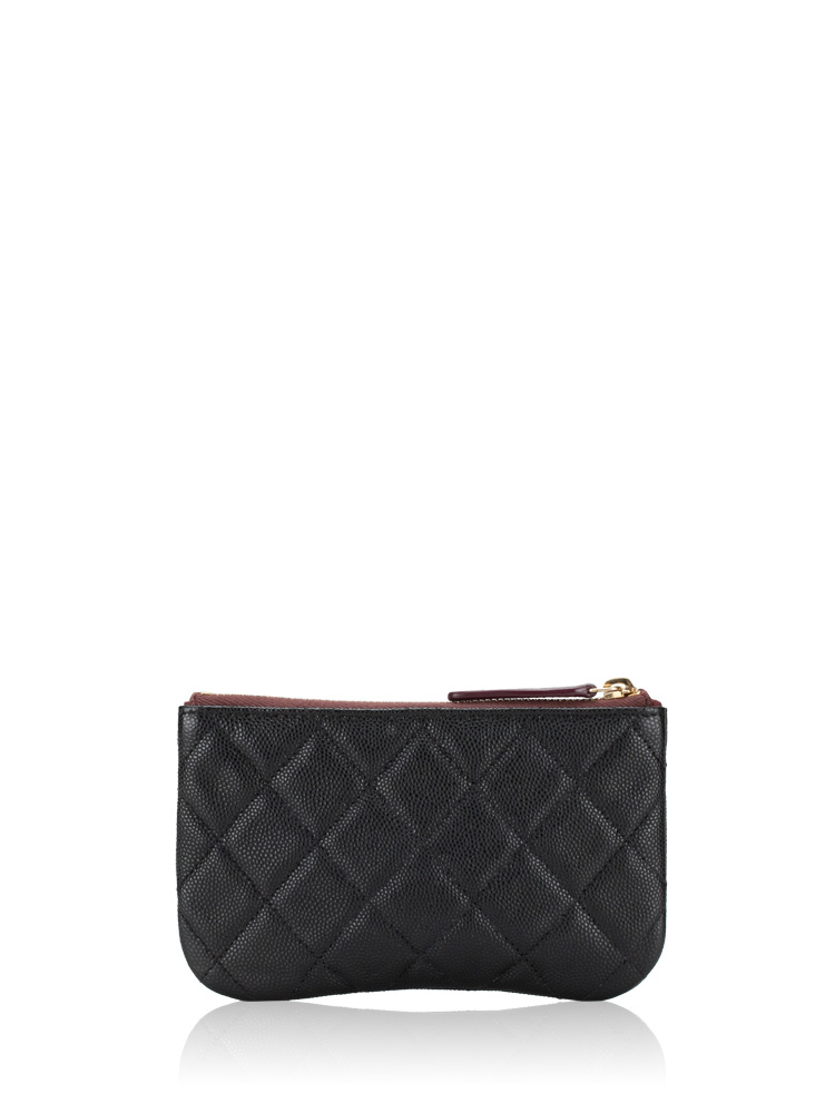 This pouch is crafted of diamond quilted caviar leather with a small polished light gold Chanel CC logo on the front. The burgundy leather top zipper opens to a matching burgundy fabric interior.