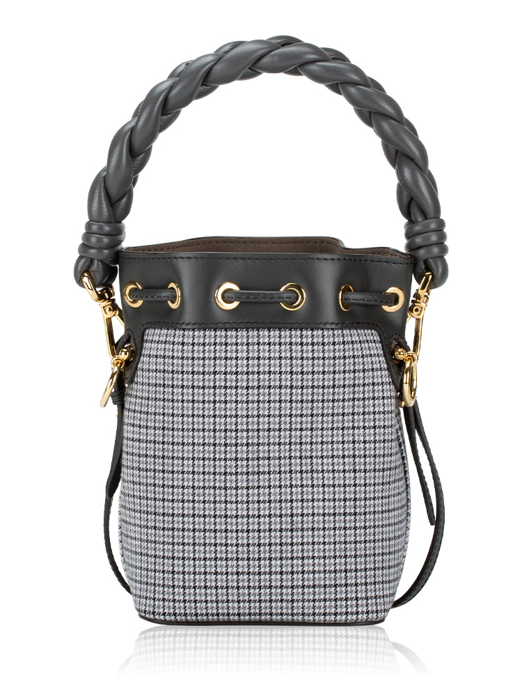 Crafted of wool material with houndstooth detail . It features leather trim, a leather shoulder strap, polished gold-tone hardware, and a braided leather handle. The open top leads to a suede interior.