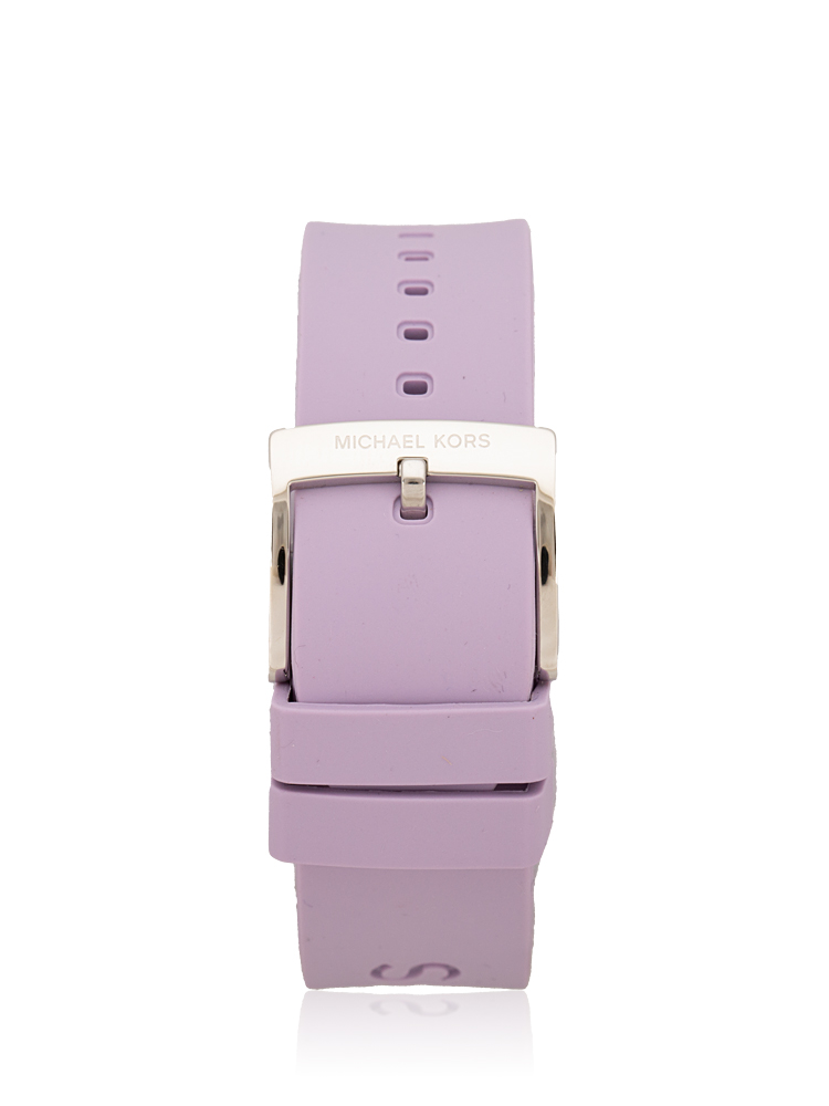 Crafted from silicon strap material with stainless steel case material. It features an open double prong strap buckle closure, and silver tone hardware.
