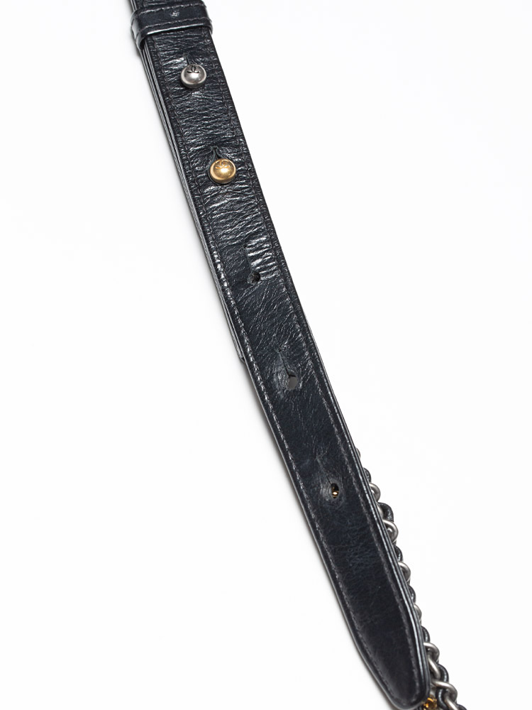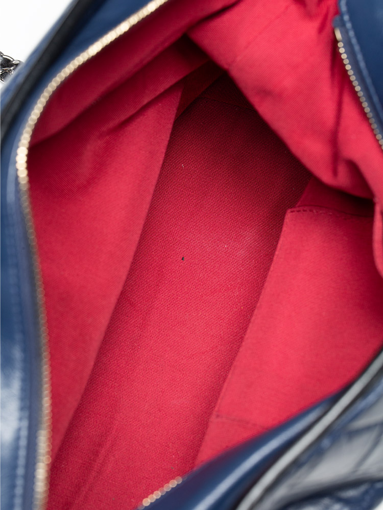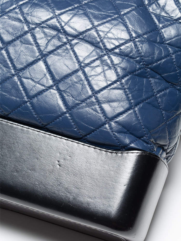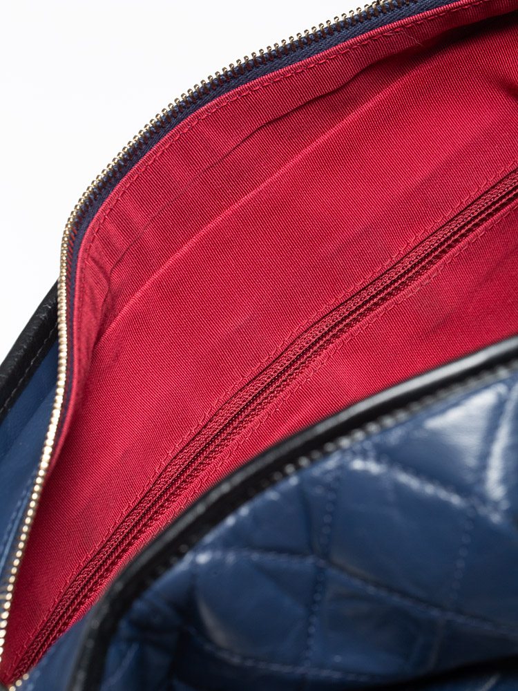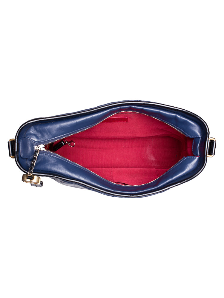 This hobo is crafted of textured aged and smooth calfskin diamond stitched leather in navy blue. Features a smooth leather base in black, gradient gold, ruthenium and silver chain threaded leather shoulder strap,