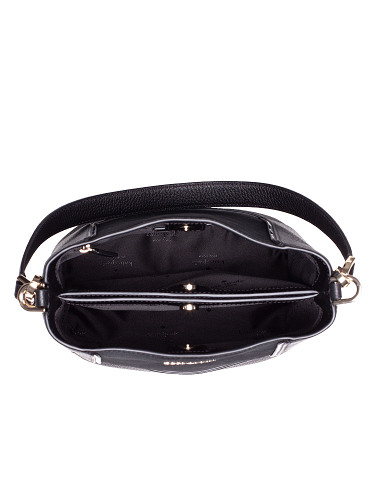 Made of pebble leather with suede and polyester lining. The bag features an open button magnetic snap closure, gold tone hardware, one zip pocket, two compartments, one middle slip pocket with hidden magnetic closure.