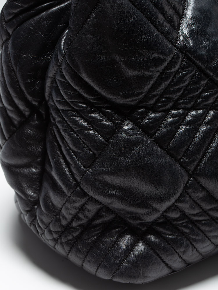 Crafted of diamond quilted lambskin leather. It features a leather shoulder strap and front flap pocket with gold CC logo. The top is open to a fabric interior with a zipper pocket.