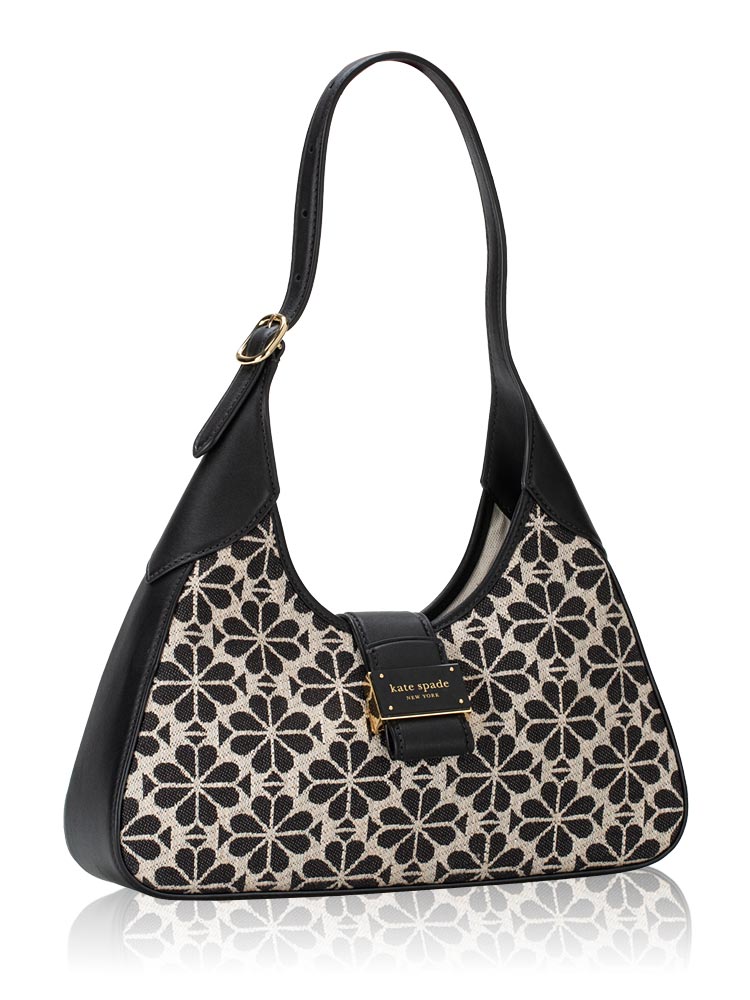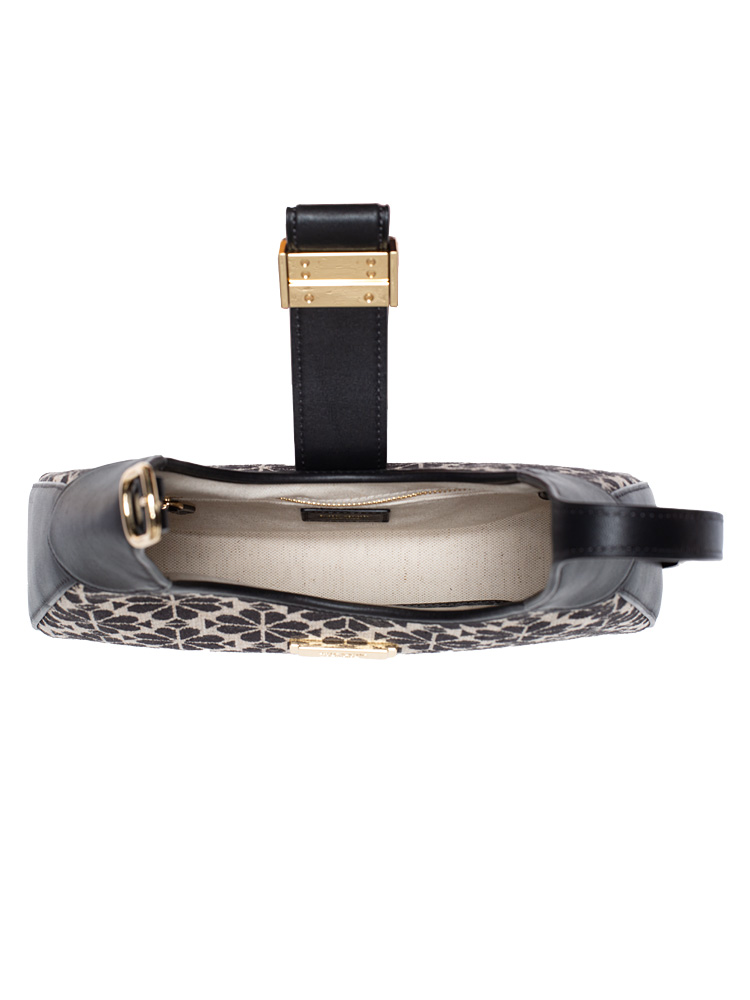 Made of jacquard with canvas lining interior. The bag features an open magnetic snap closure, gold tone hardware, one zip pocket, one slip pocket and adjustable shoulder wear