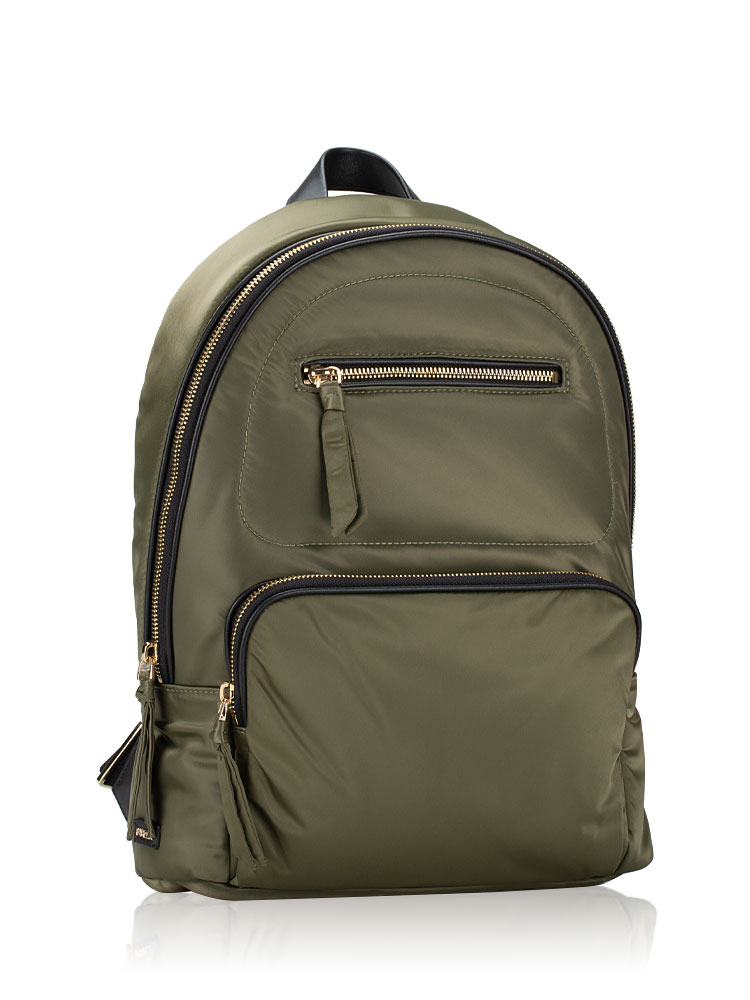 Made of nylon material with nylon lining material. The bag features an open zip closure, gold tone hardware, one zip pocket, one slip laptop, four card slots and two eksterior fron zip pockets.