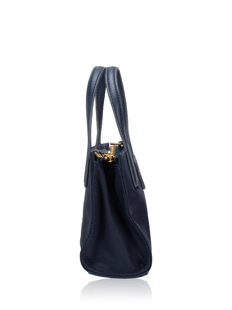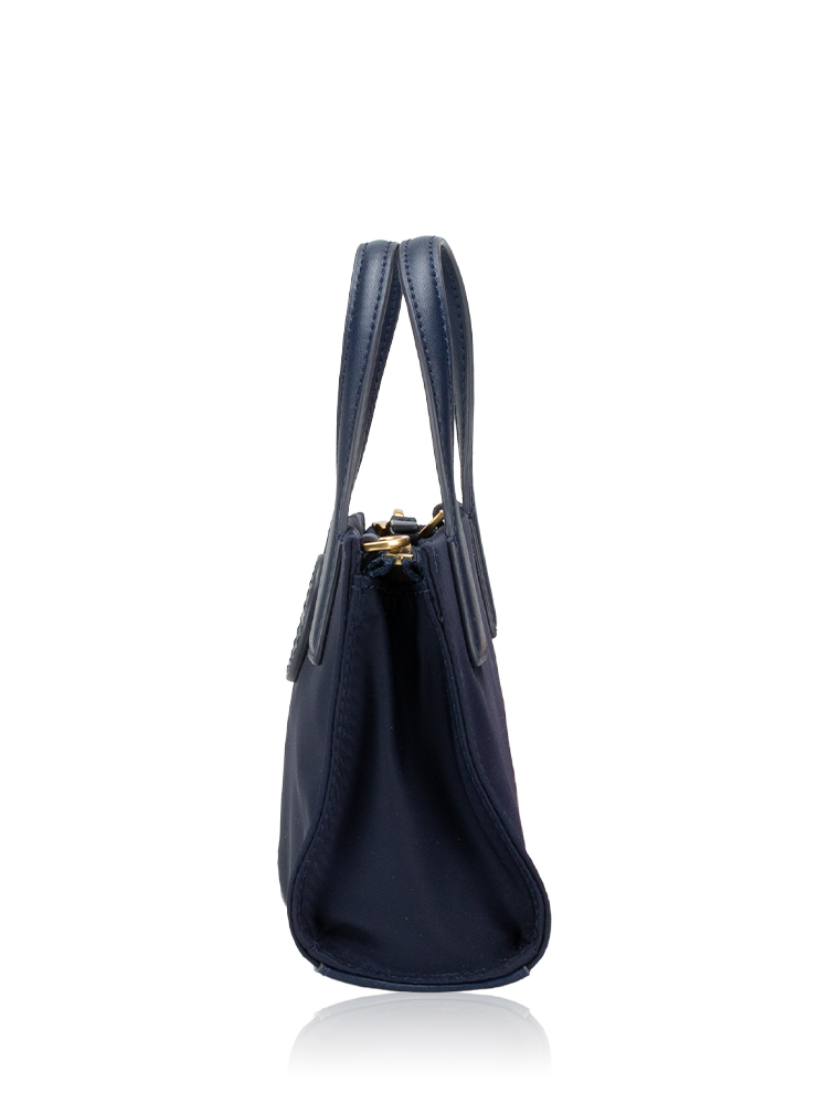 Made of nylon. The bag features a zip closure that opens to fabric lining with one card slot, double handles drop 7 cm, adjustable and removable long strap.