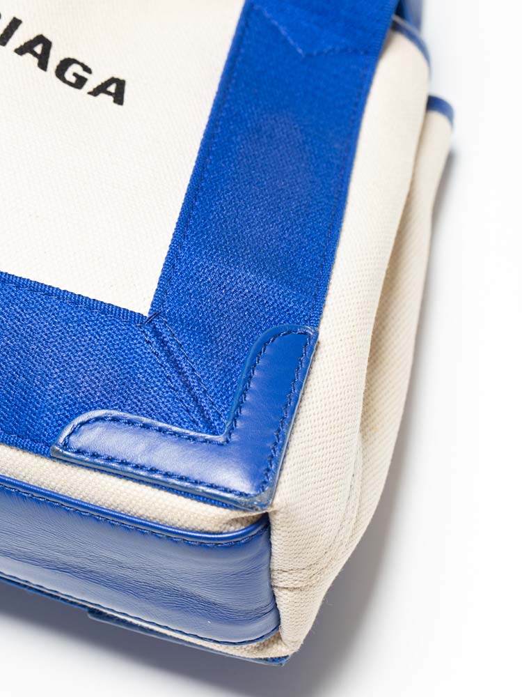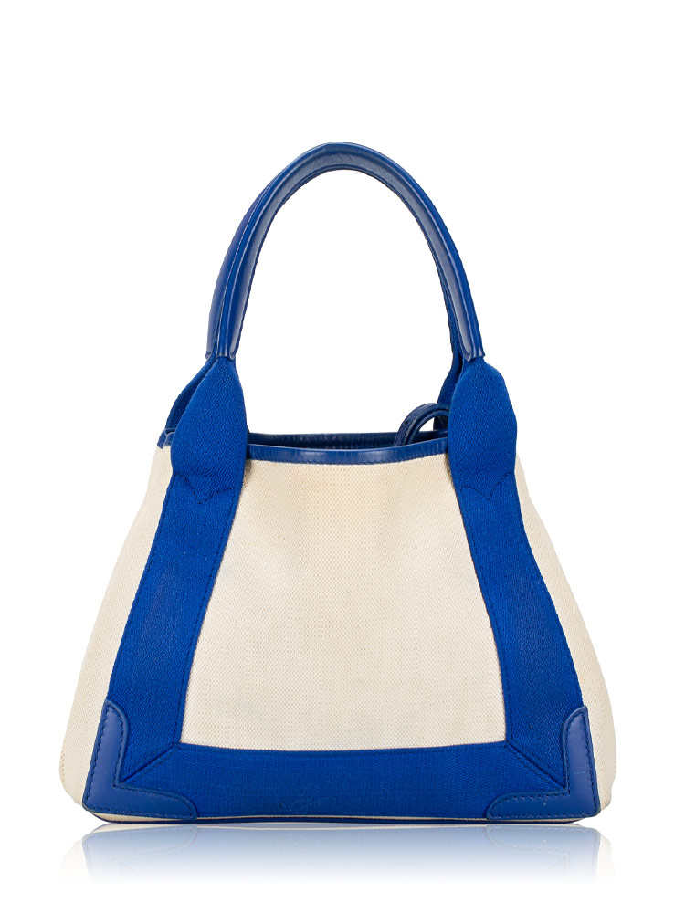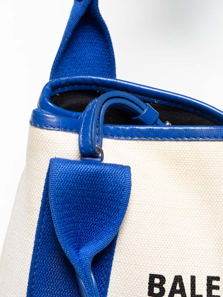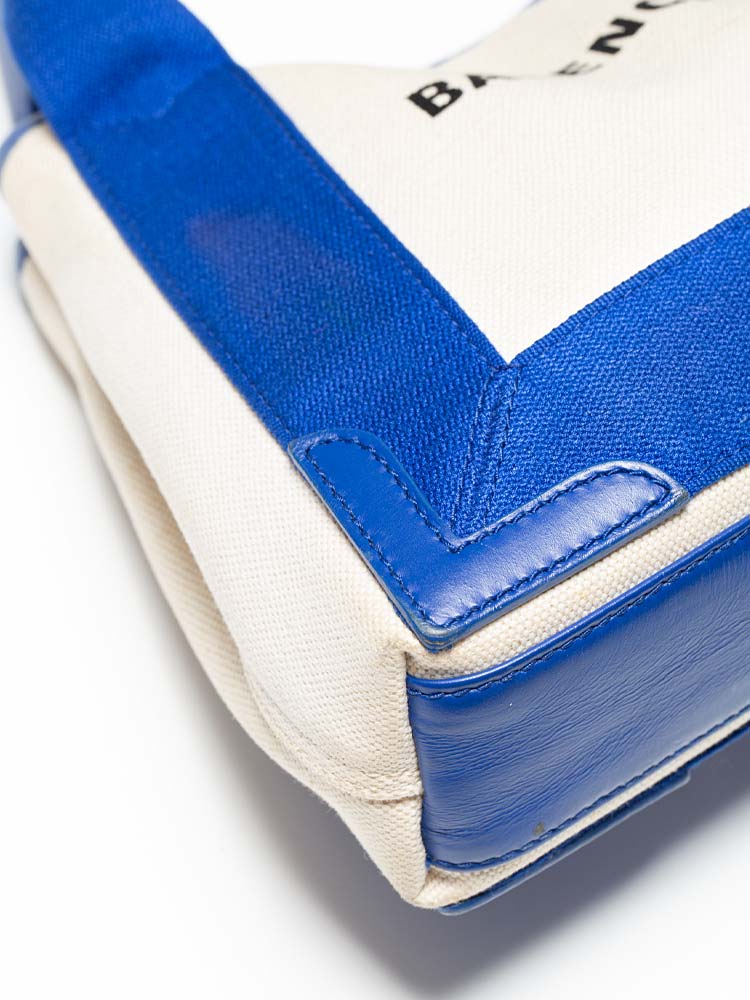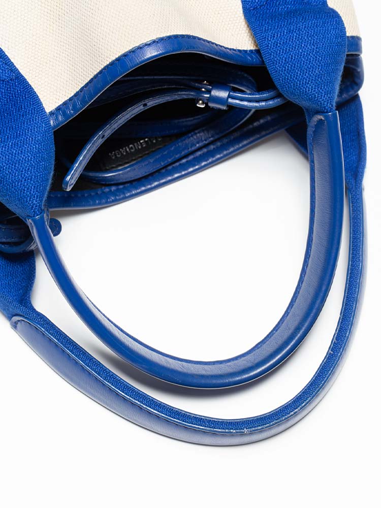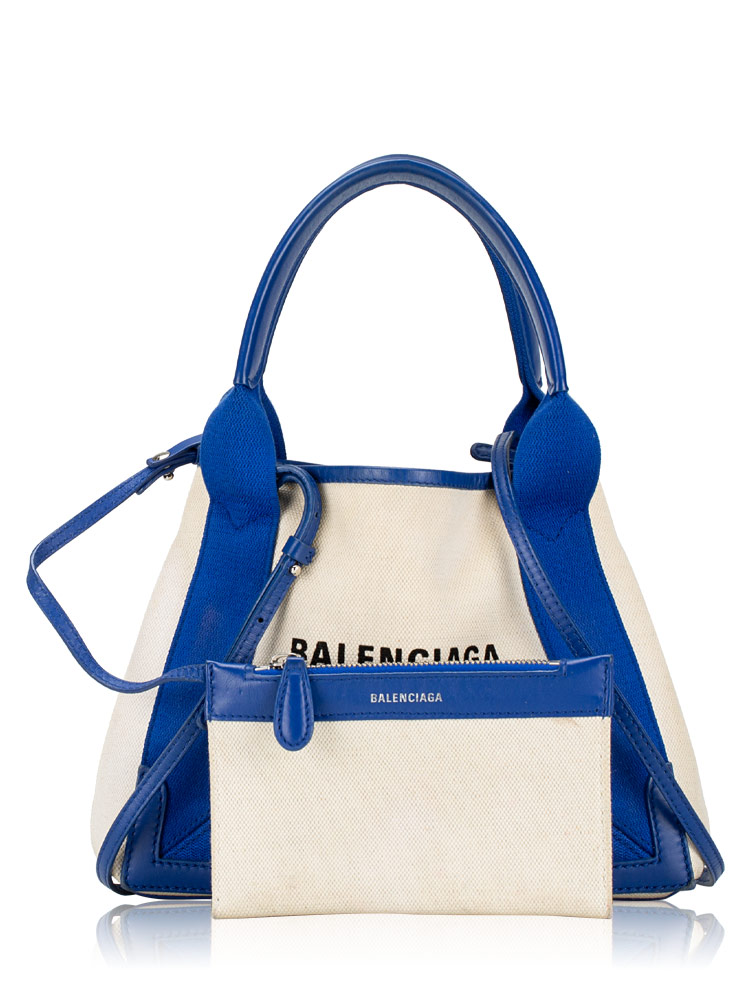 Crafted of a canvas and leather trim. This handbag features nylon accents that extend into top handles with leather grips and the BALENCIAGA logo. The top opens to a fabric interior with a matching companion pouch.