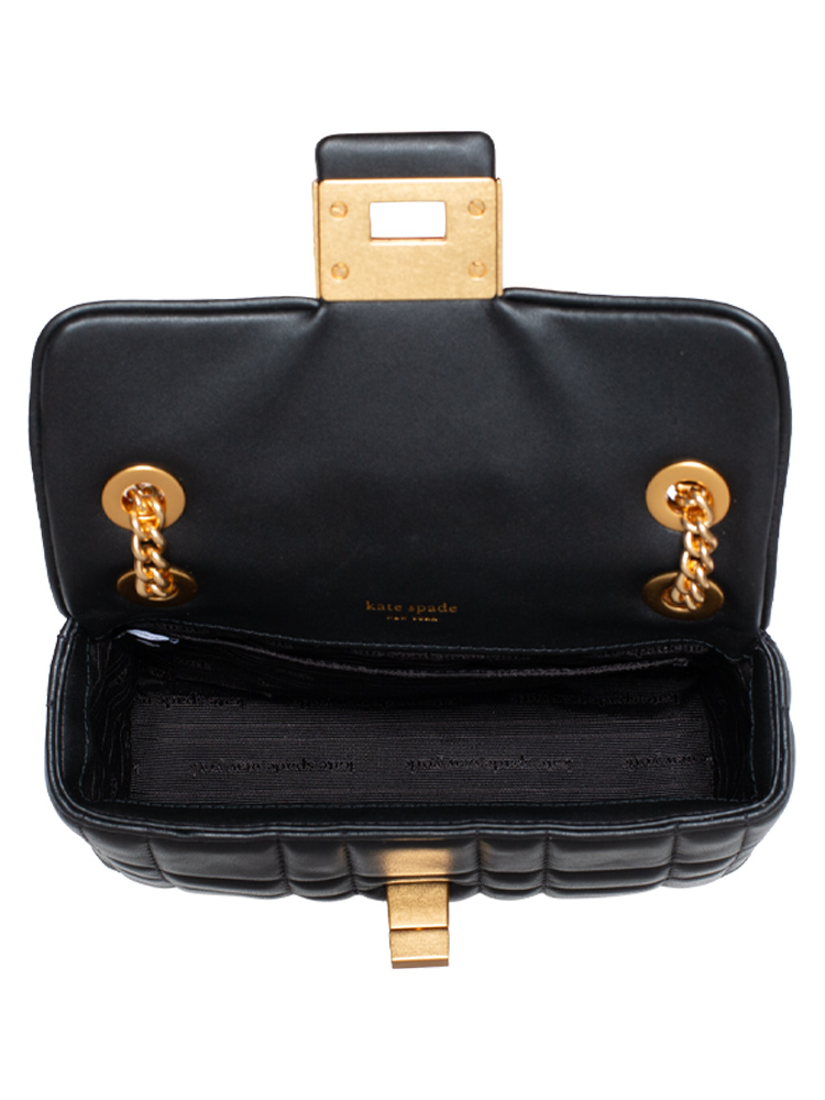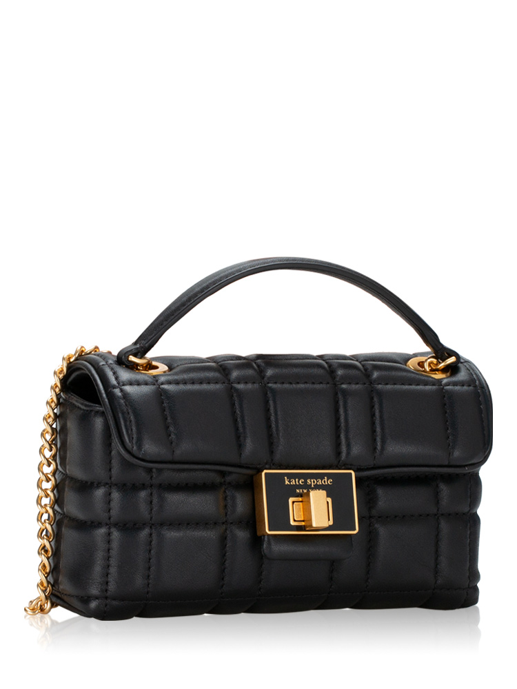 Made of quilted smooth leather. Plaque logo. Convertible chain shoulder crossbody bag with twis-tlock closure and one slip pocket.