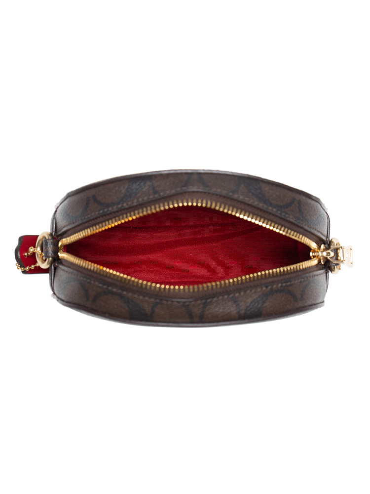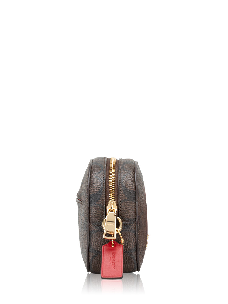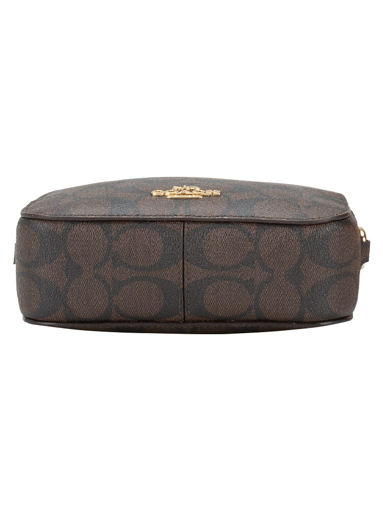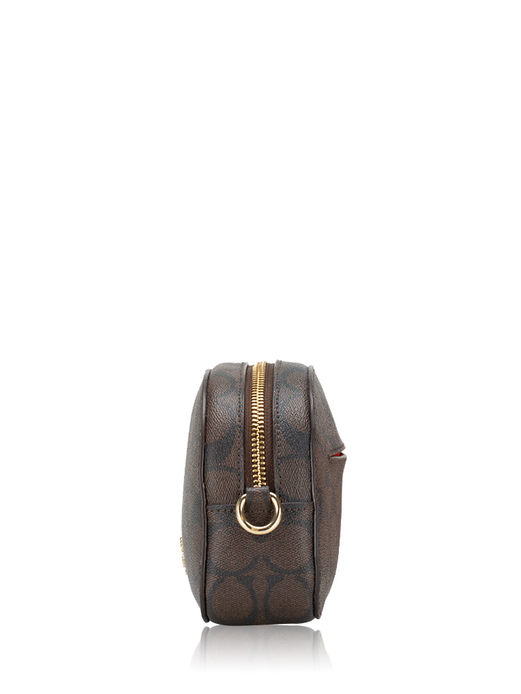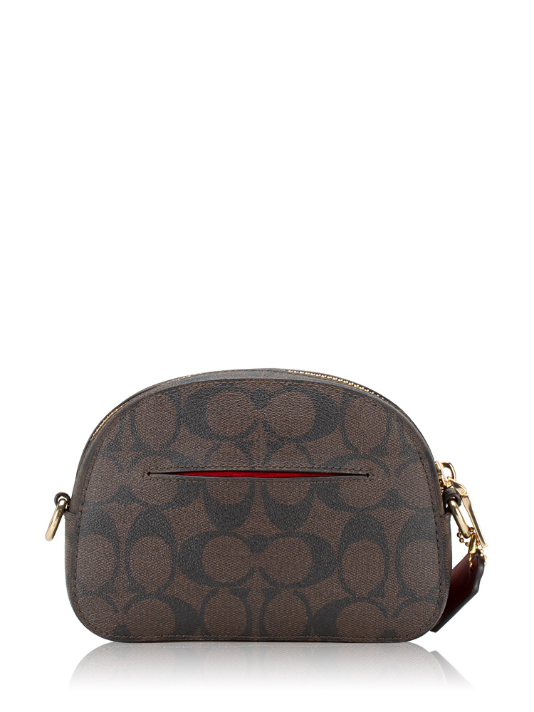 This signature canvas and smooth leather mini Serena crossbody bag is a top-zip design with a detachable crossbody strap. It features a zip compartment with matching fabric lining and card slots, also a back slip pocket.
