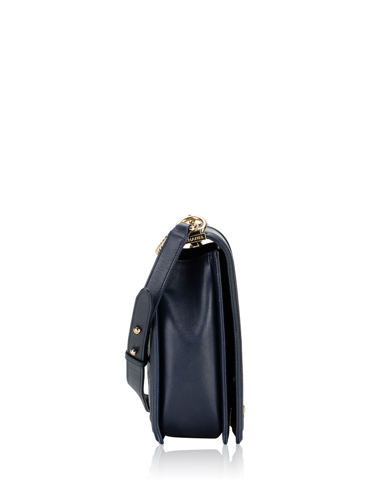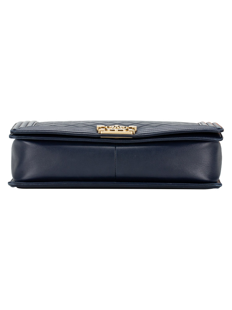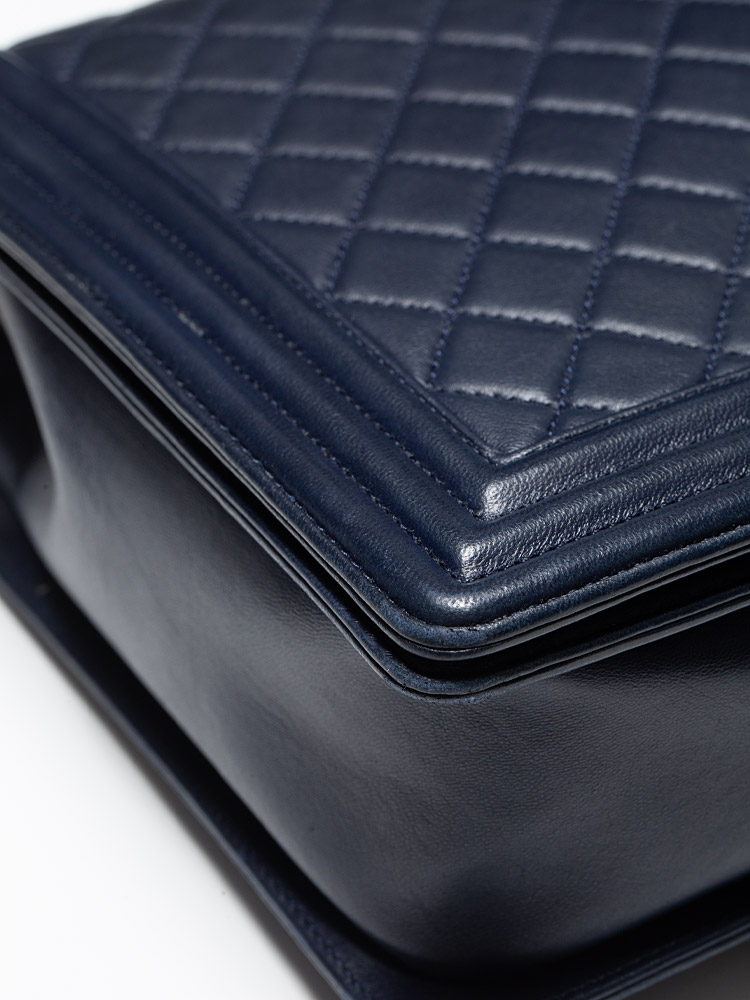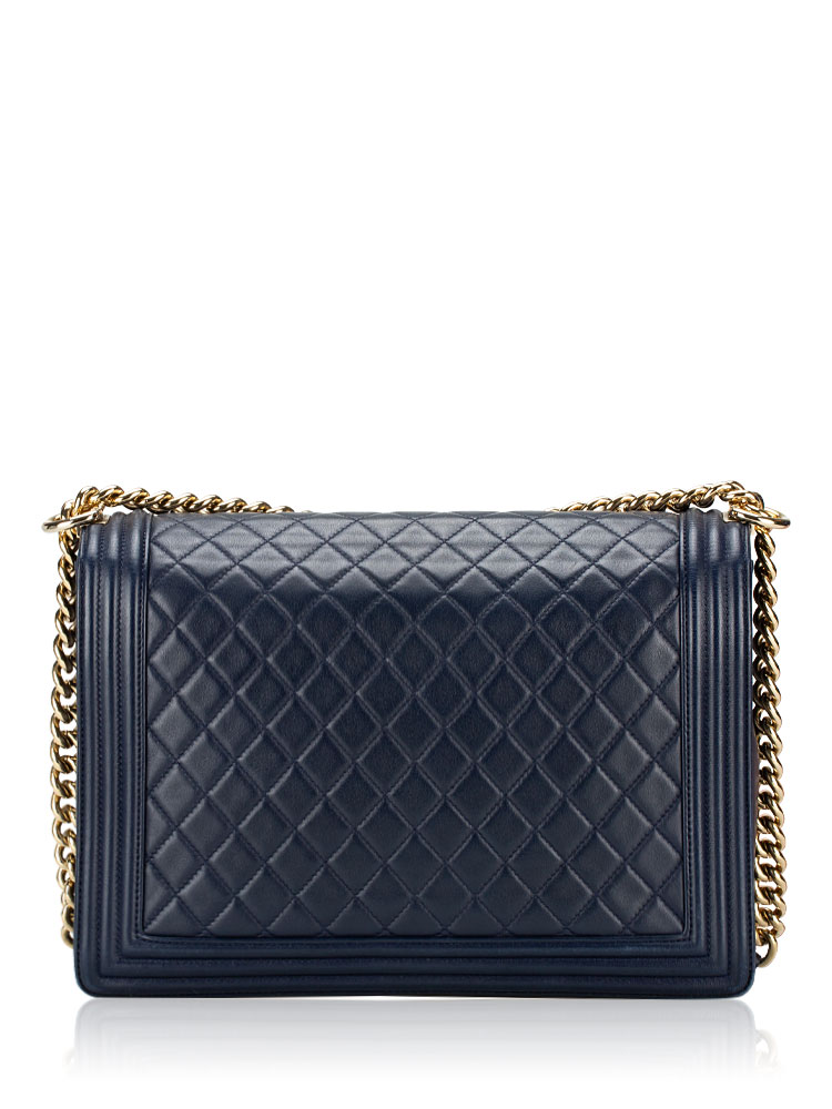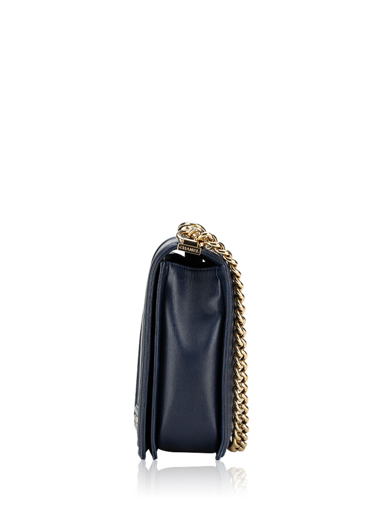 This bag is crafted of lambskin leather. Features with quilted stitch, Chanel Boy push lock, chain strap with leather pad. The flap opens to fabric lining with slip and zipper pockets.