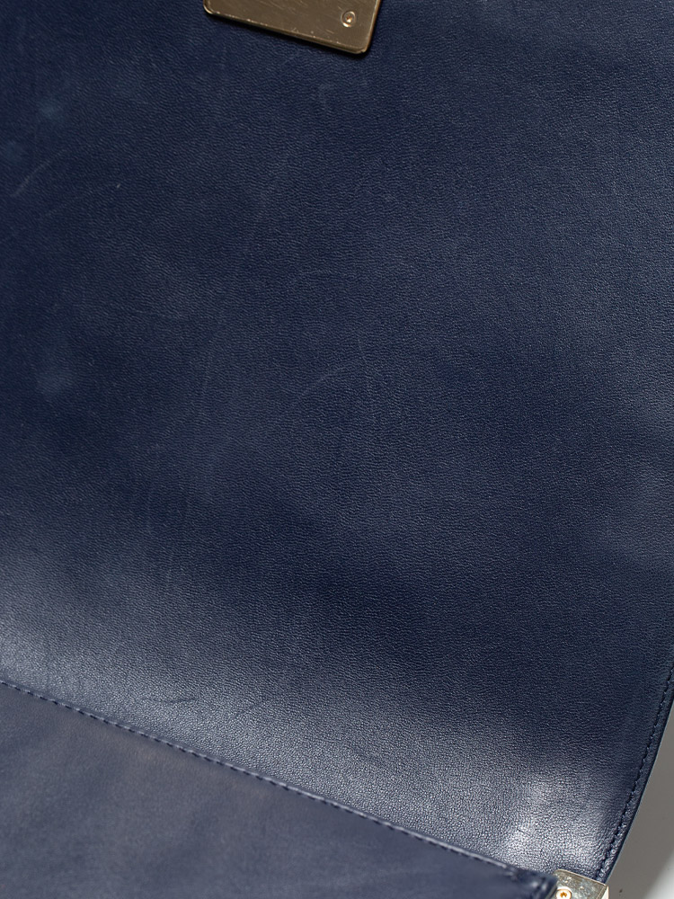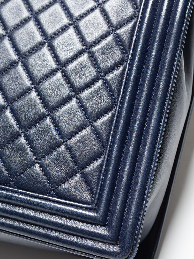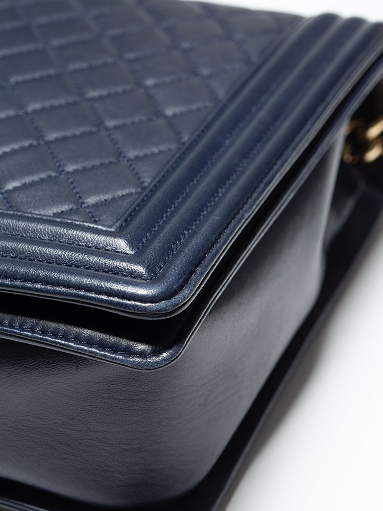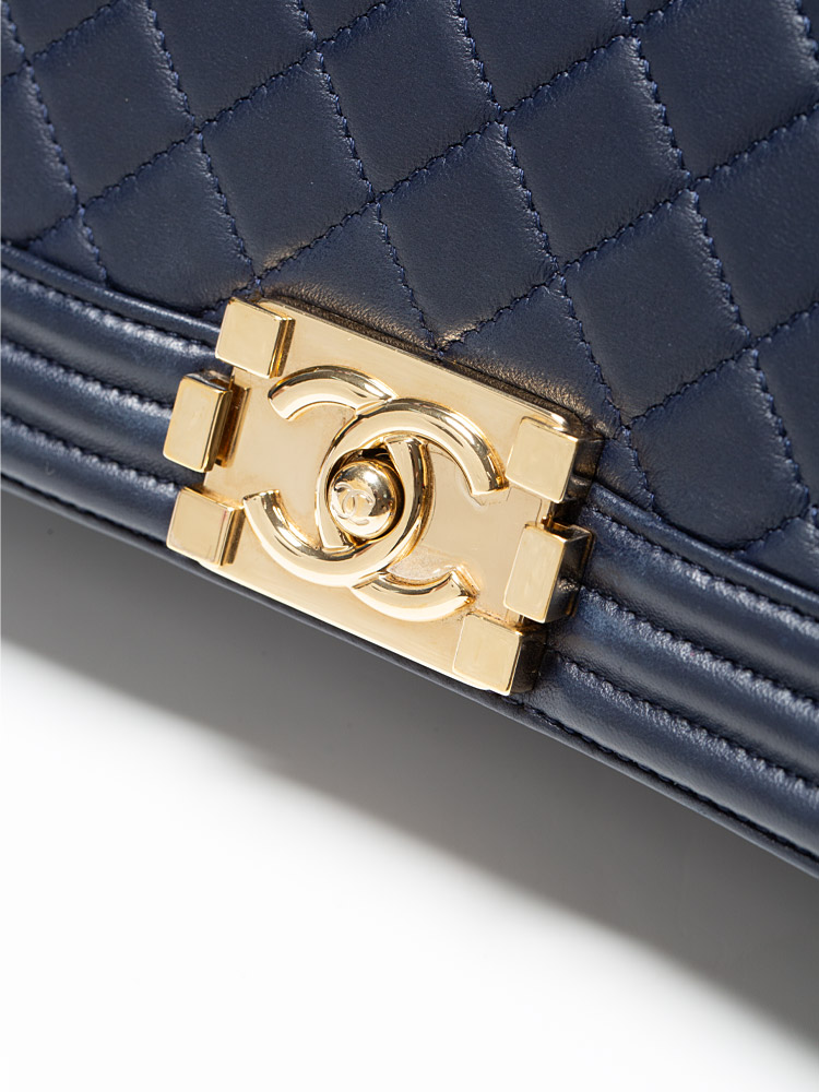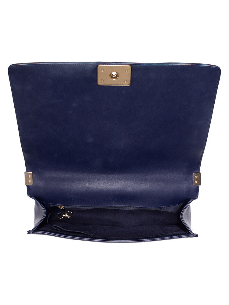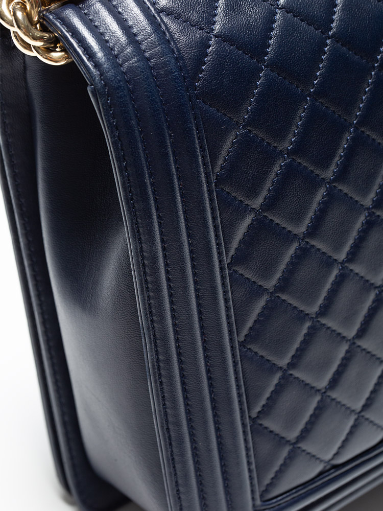 This bag is crafted of lambskin leather. Features with quilted stitch, Chanel Boy push lock, chain strap with leather pad. The flap opens to fabric lining with slip and zipper pockets.