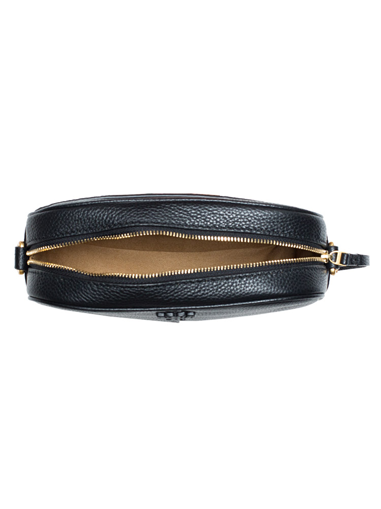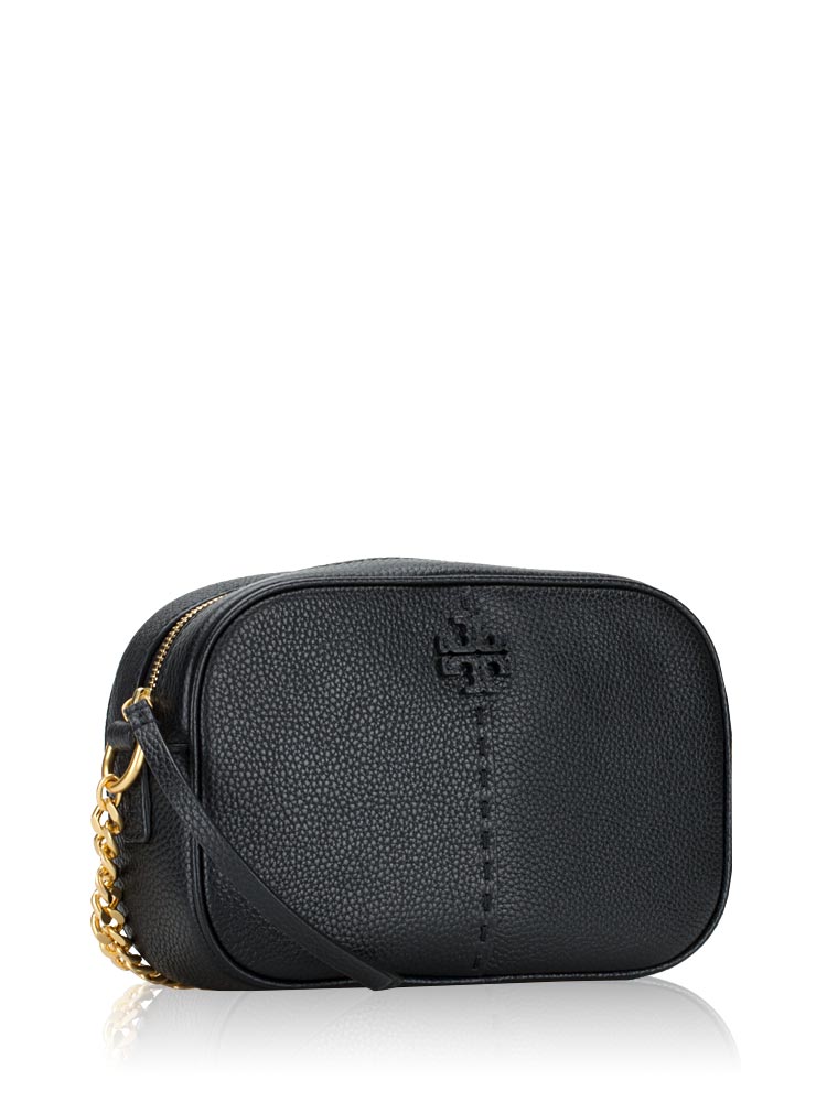 Crafted of pebble leather, the bag features a top zip closure that opens to fabric lining with a slip wall pocket. Attached chain-leather crossbody strap can be adjusted to fit your body height.