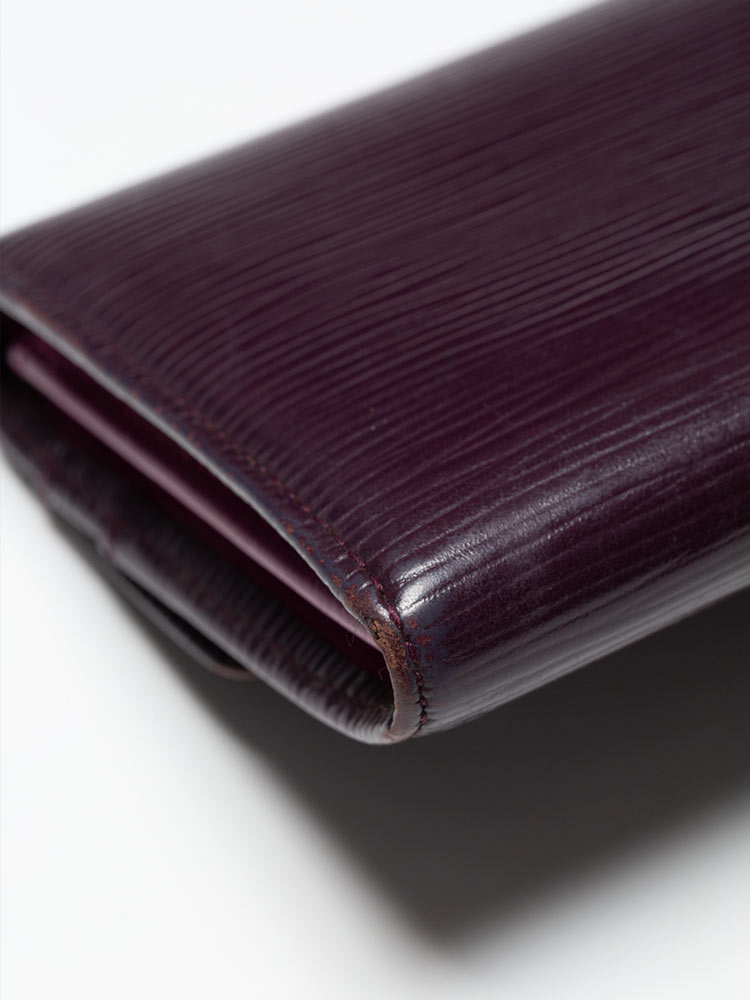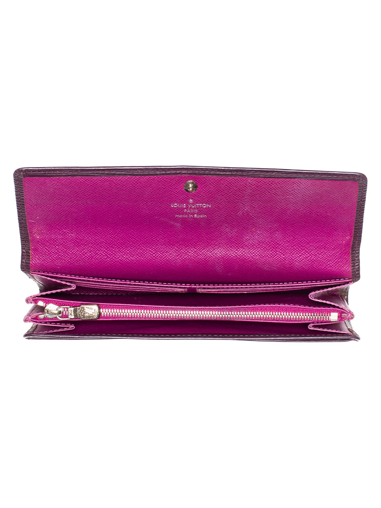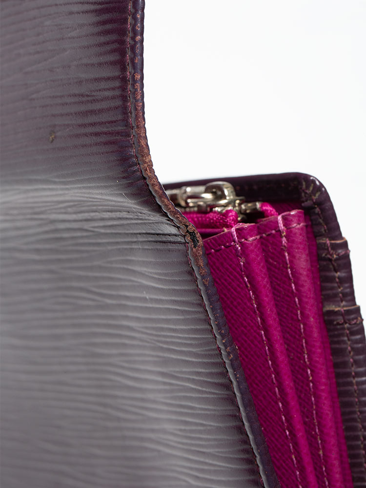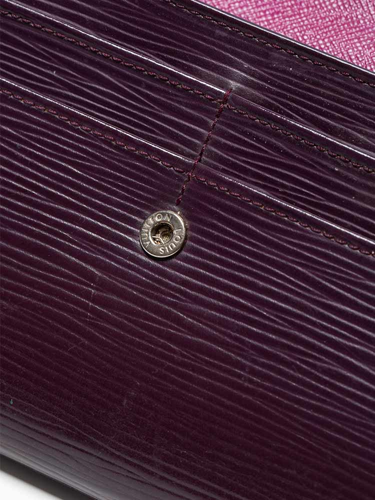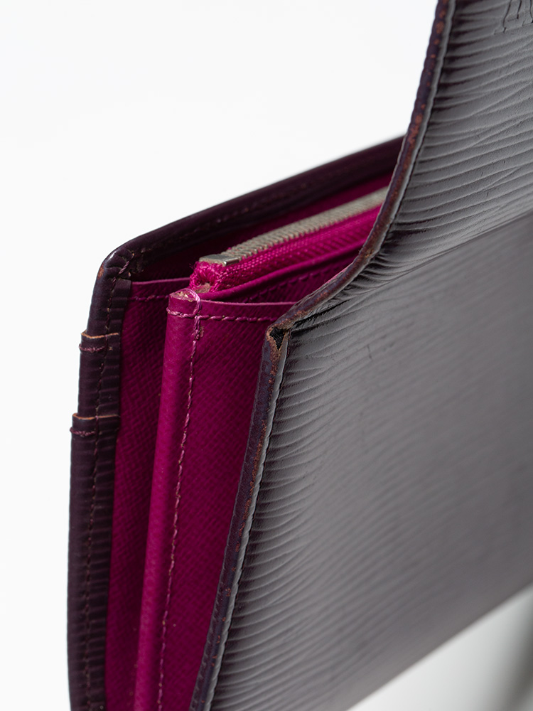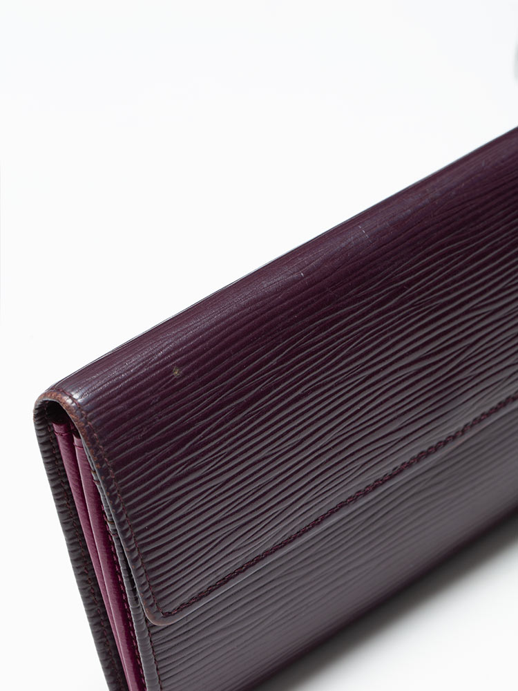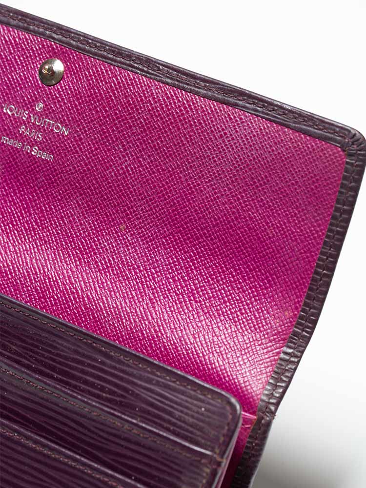 This wallet is crafted of Louis Vuitton signature textured epi leather in purple. The wallet has a front flap that opens to a partitioned cross-grain leather interior of bill compartments and a zippered pocket.