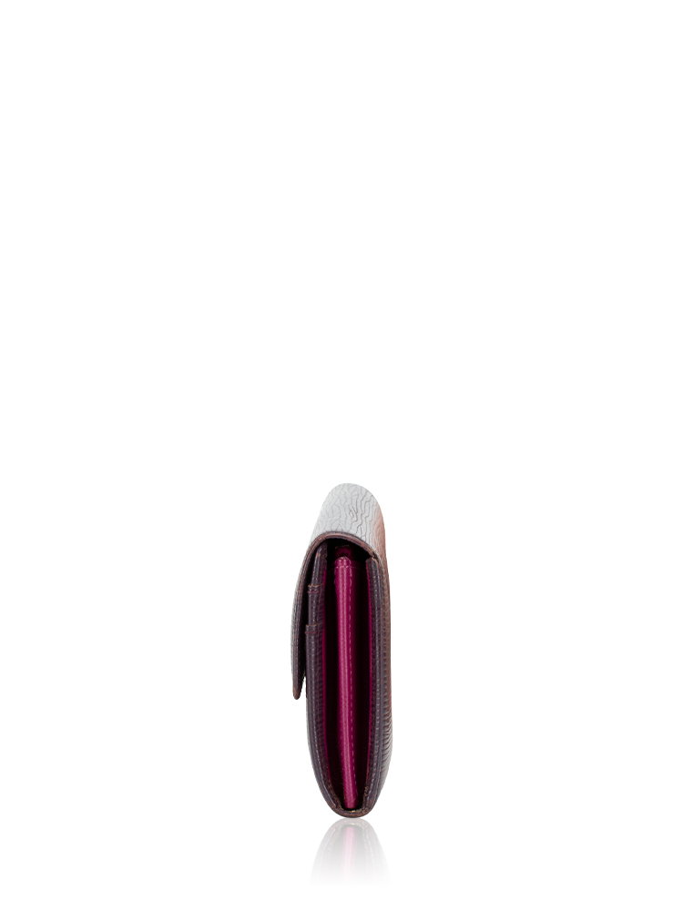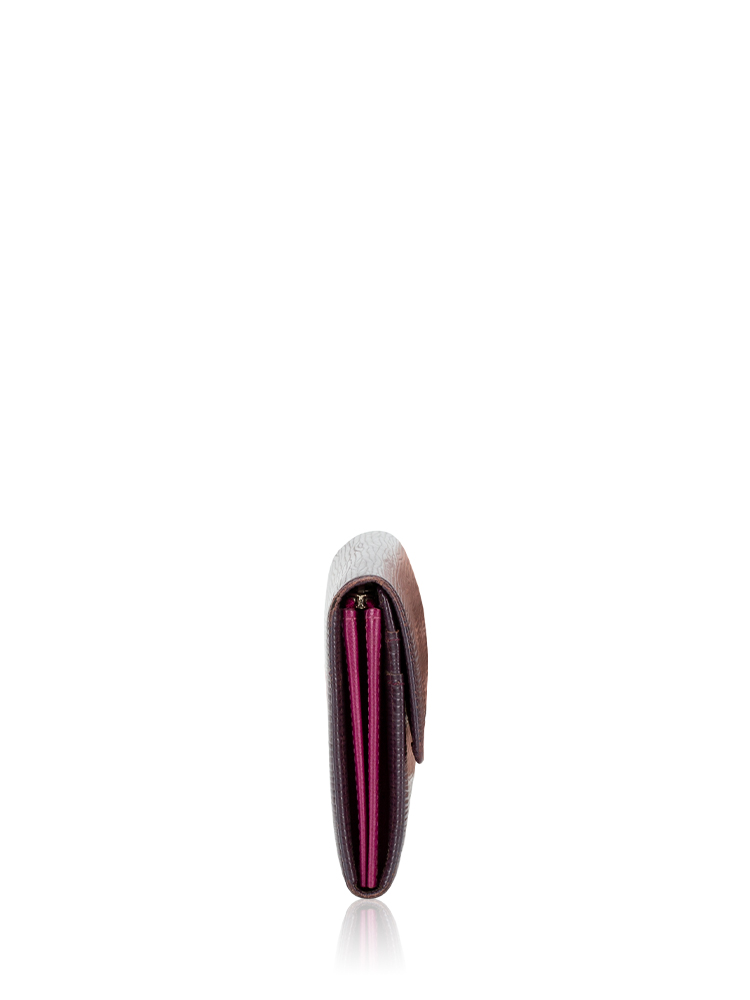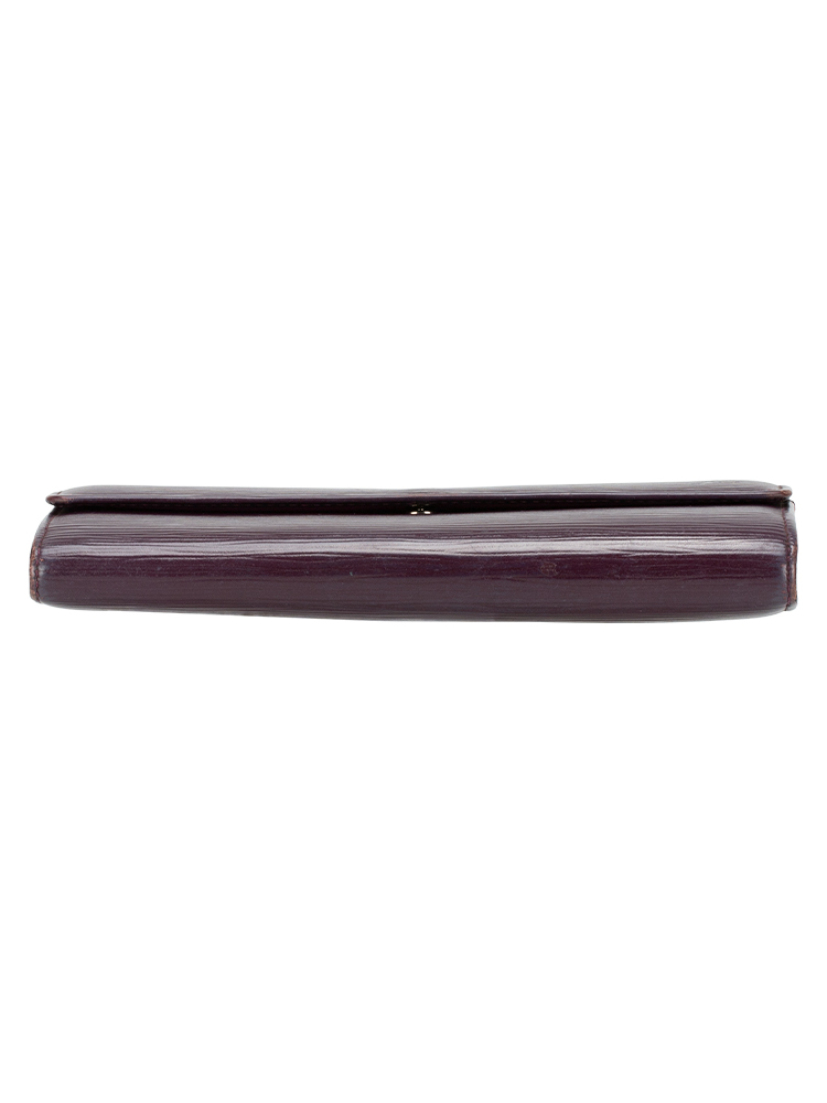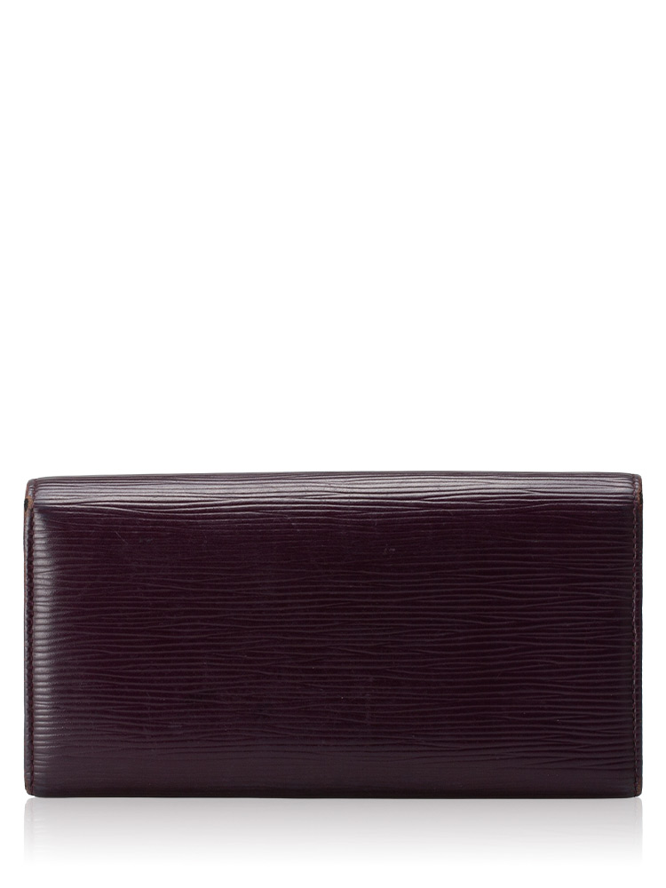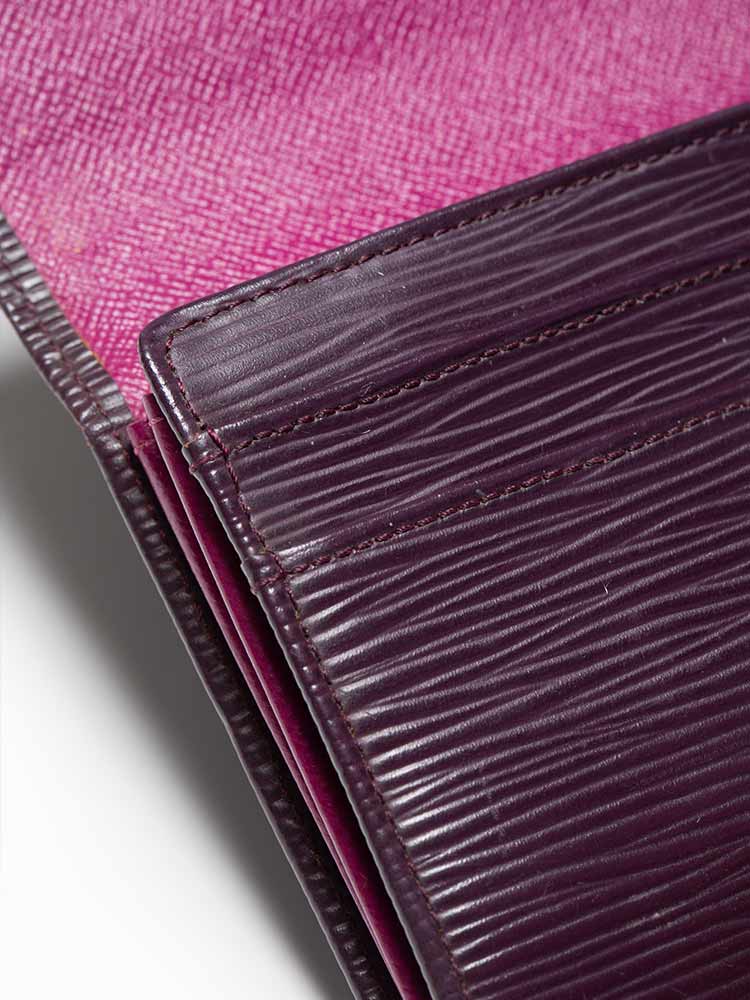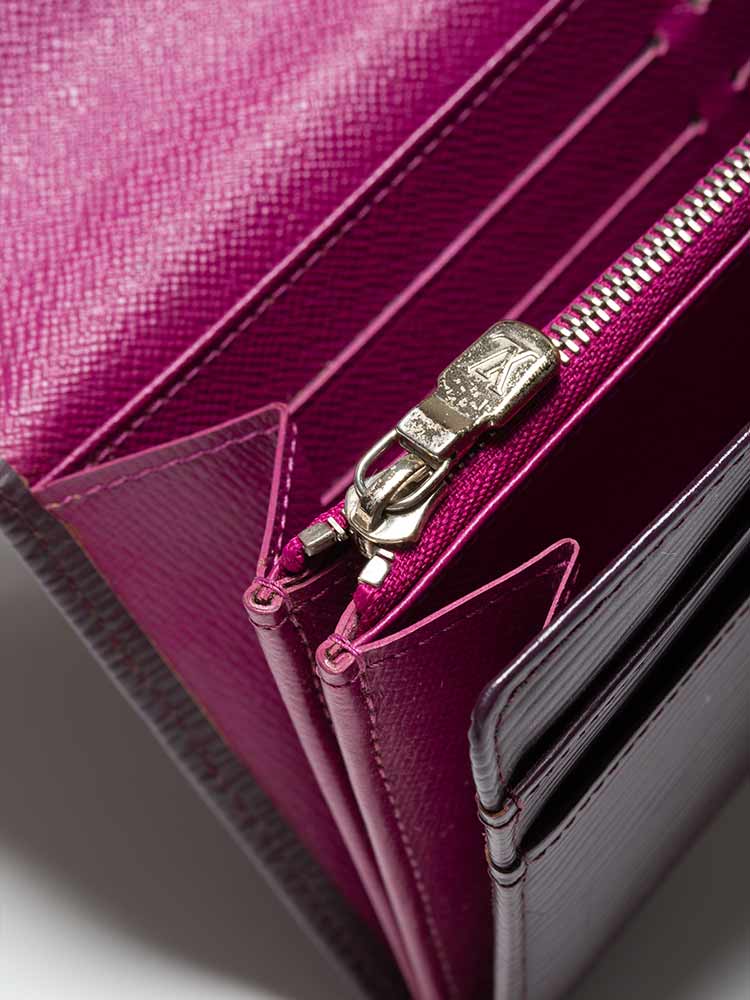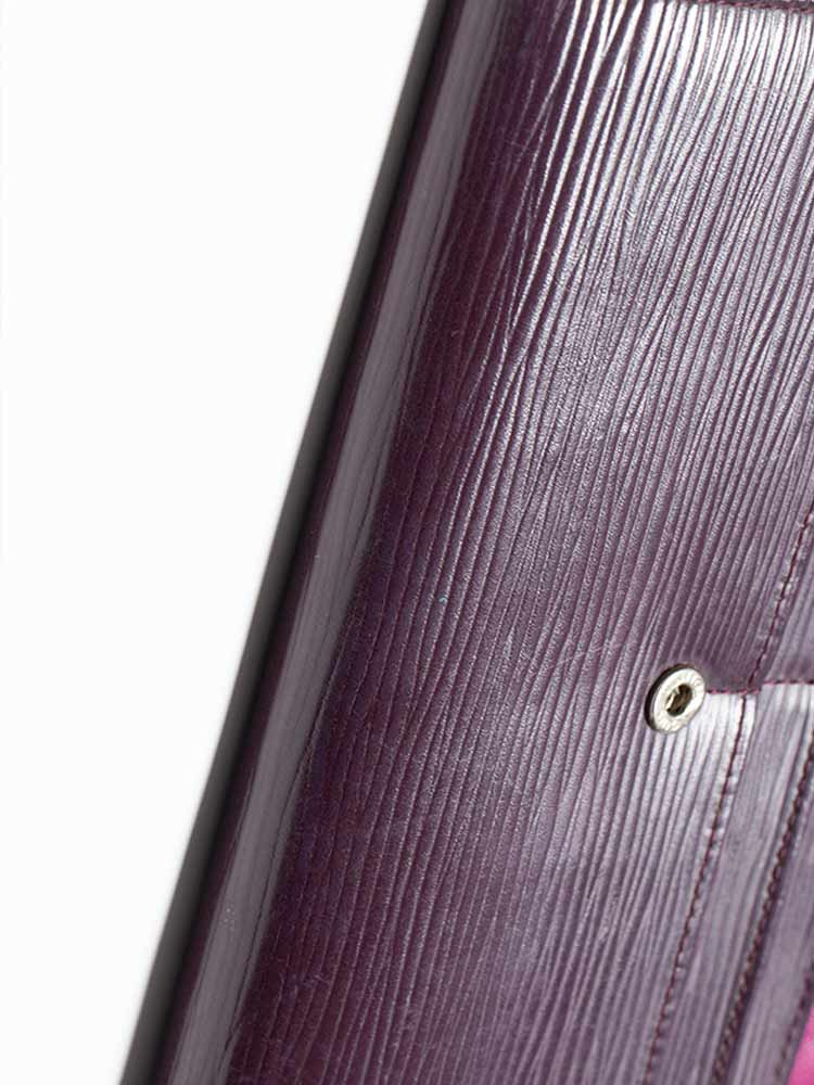 This wallet is crafted of Louis Vuitton signature textured epi leather in purple. The wallet has a front flap that opens to a partitioned cross-grain leather interior of bill compartments and a zippered pocket.