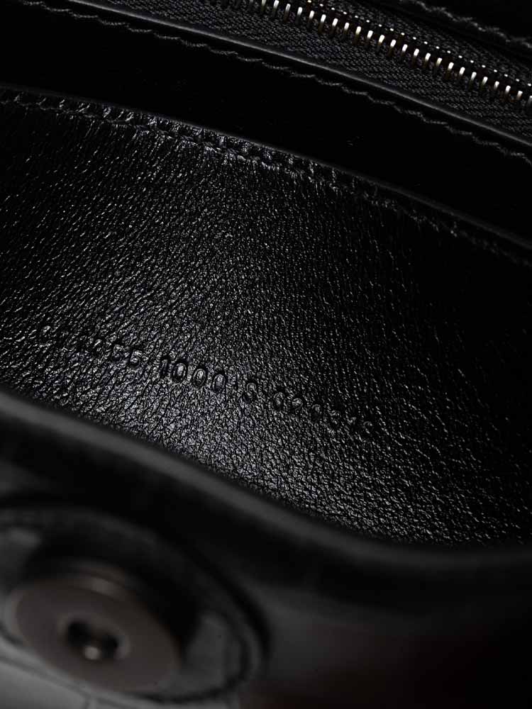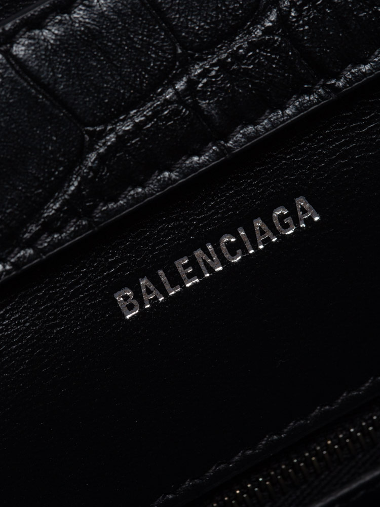 Crafted of crocodile stamped glazed calfskin. It features a matching optional shoulder strap. This bag also features the signature Balenciaga B charm. The front flap opens to a matching leather interior with a zipper and patch pocket.