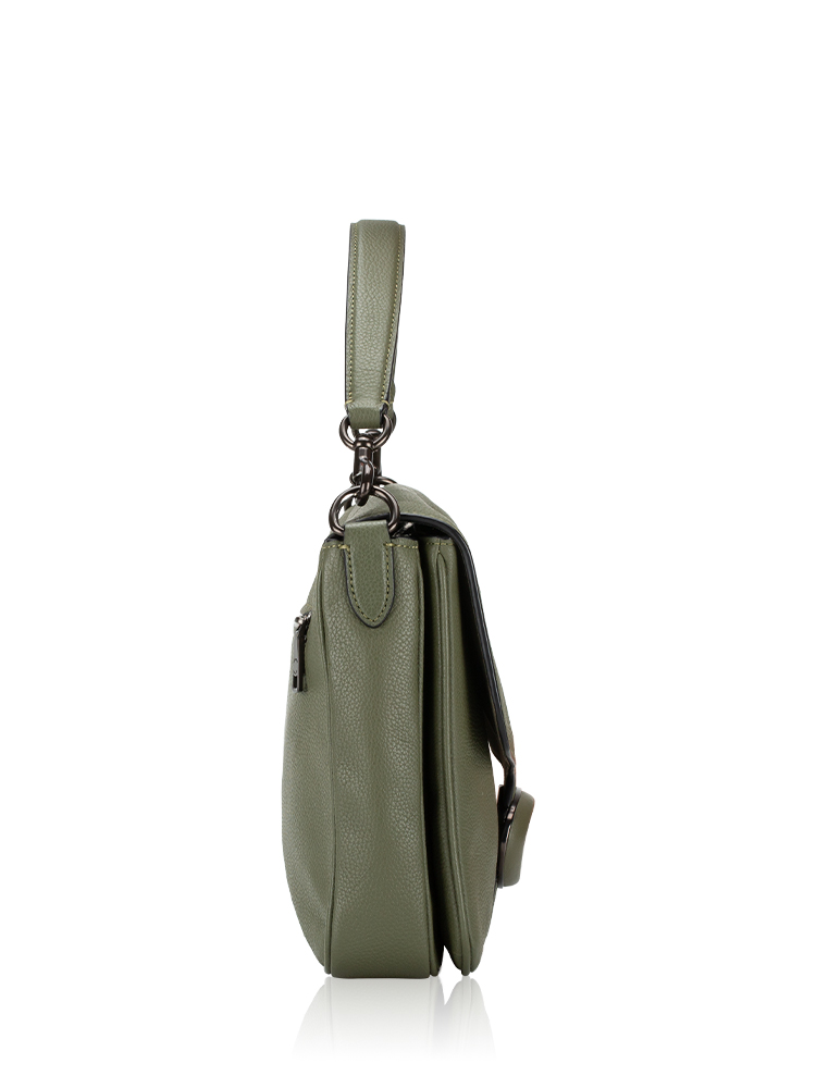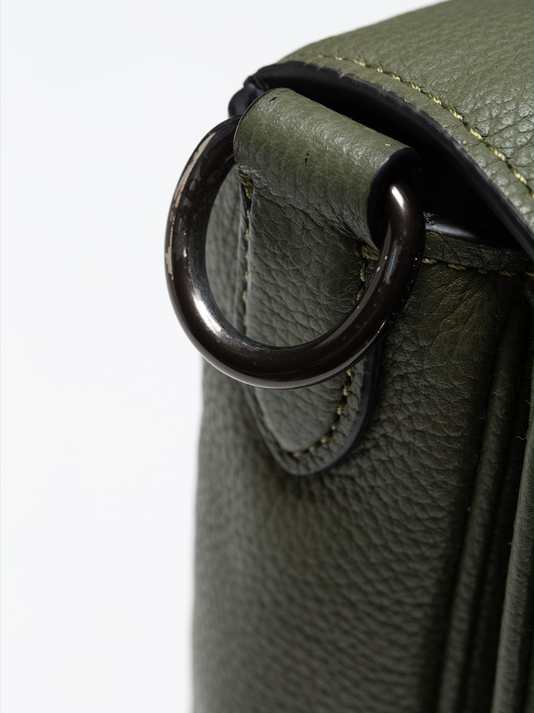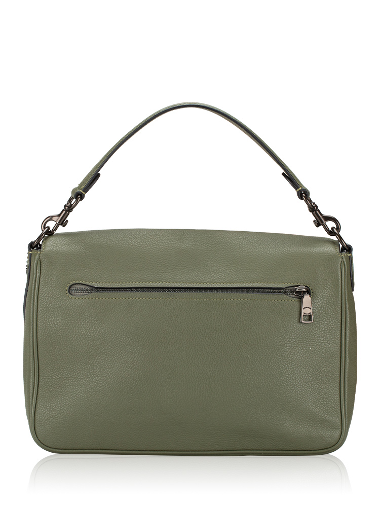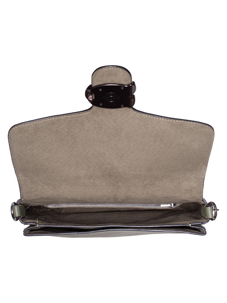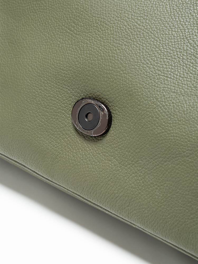 Made of polished pebble leather. The bag features a magnetic snap closure that opens to fabric lining with interior one zip pocket, one slip pocket at front and exterior one zip pocket at back.