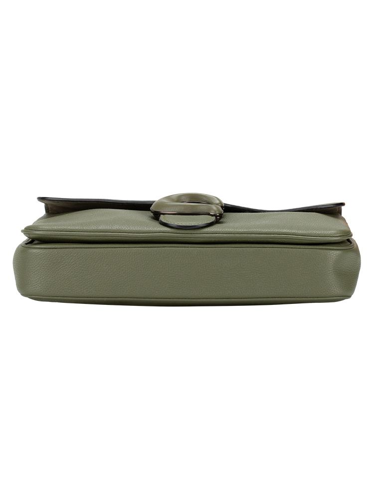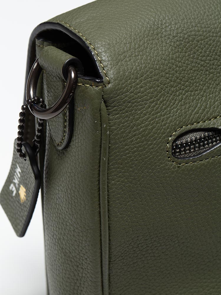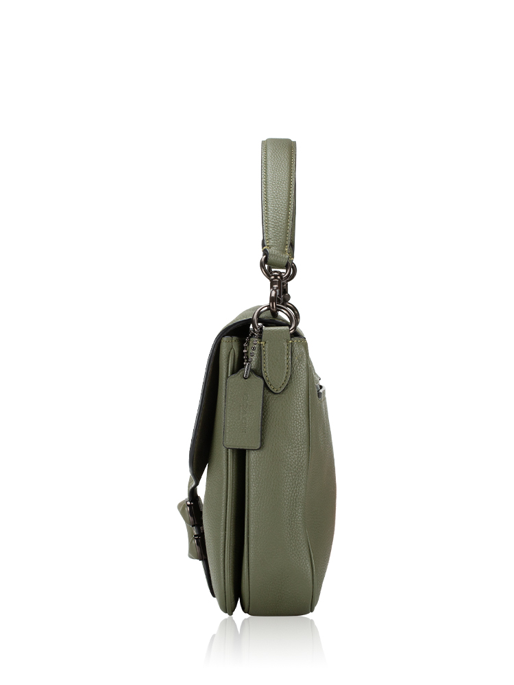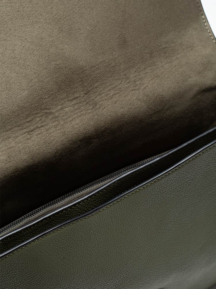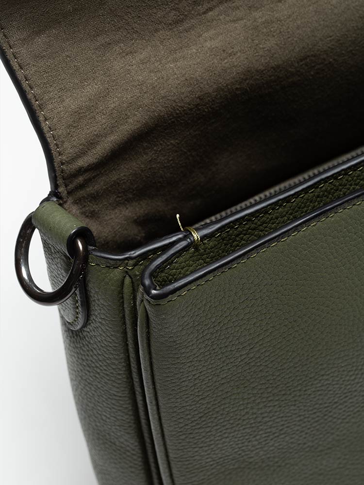 Made of polished pebble leather. The bag features a magnetic snap closure that opens to fabric lining with interior one zip pocket, one slip pocket at front and exterior one zip pocket at back.