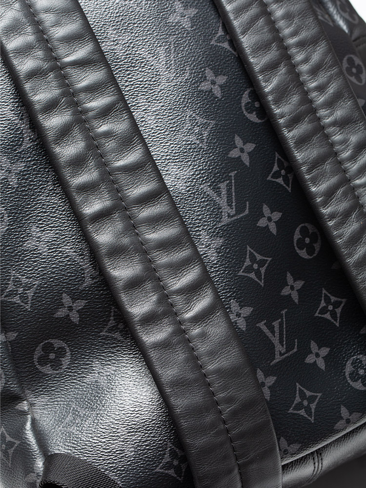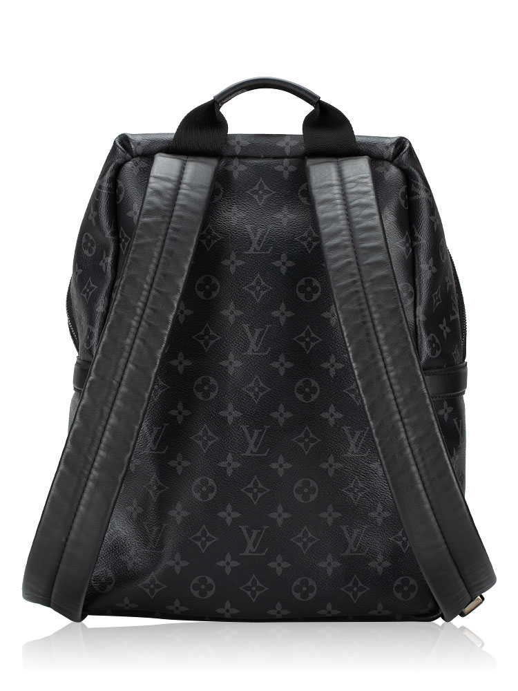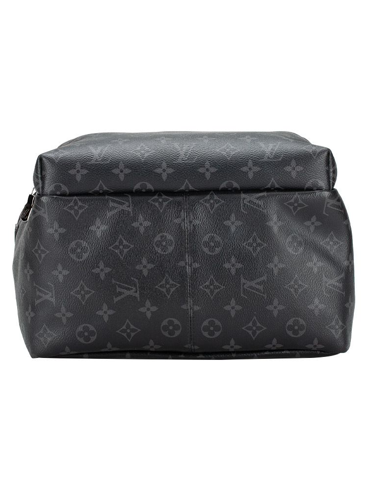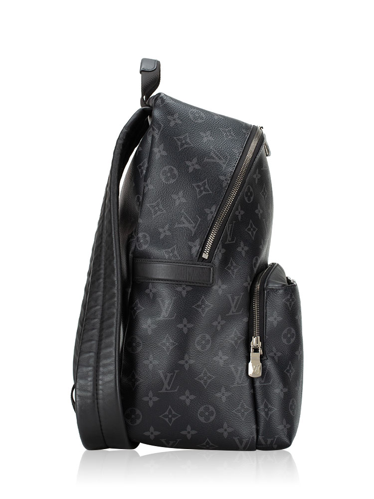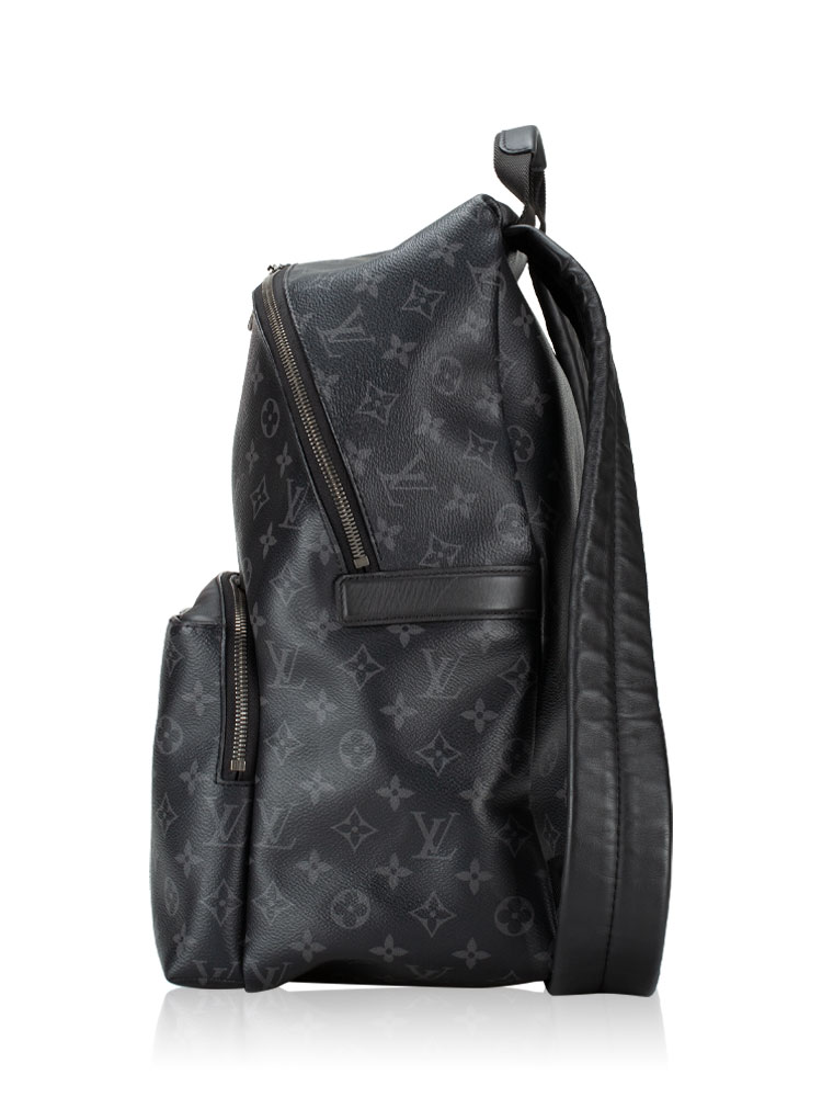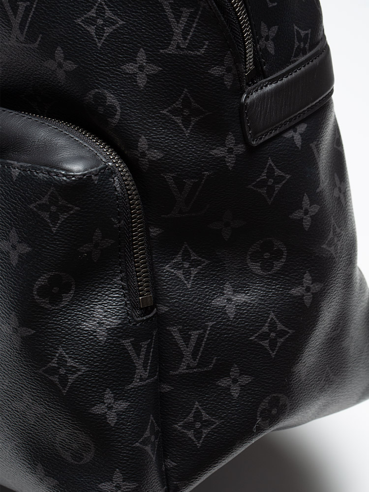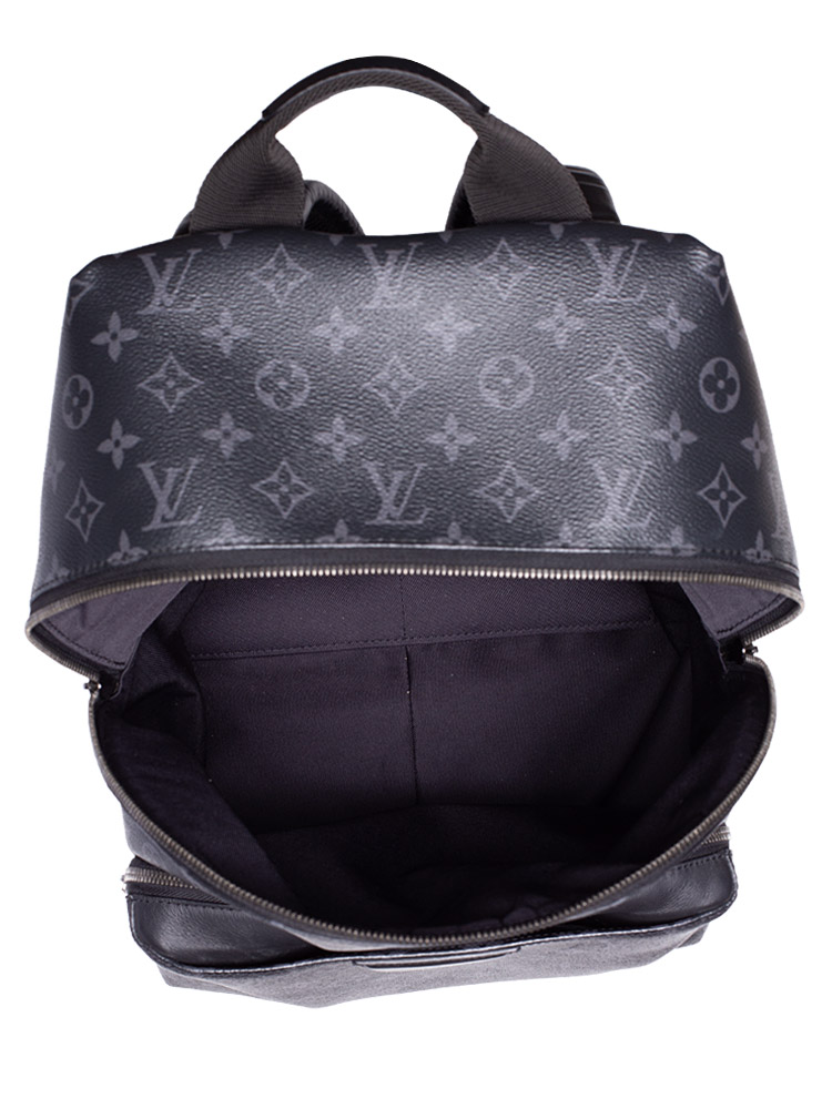 This backpack is crafted of monogram coated canvas in grey and black. Features adjustable shoulder straps, a reinforced top handle, a front zipper pocket, and dark silver hardware. The main zipper opens to a black fabric interior with patch pockets.