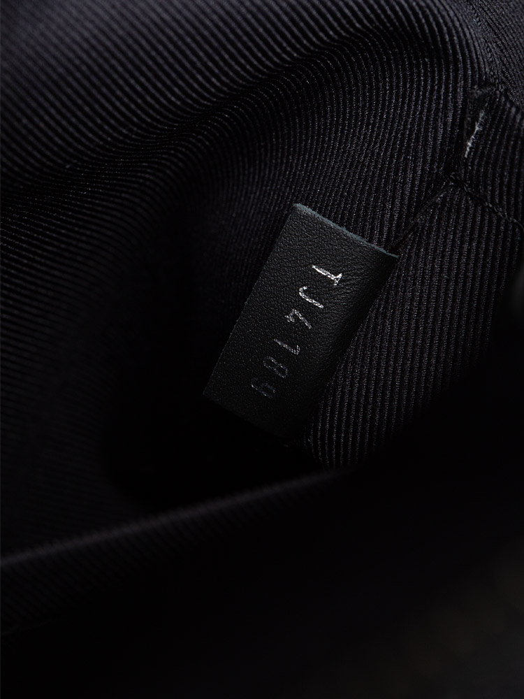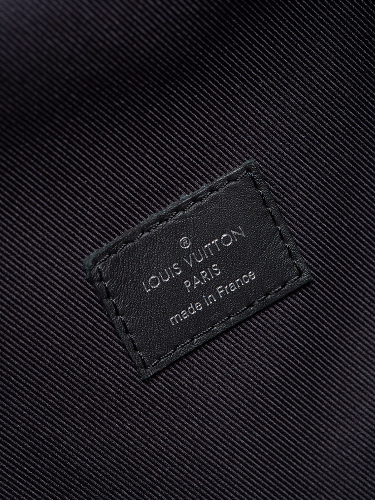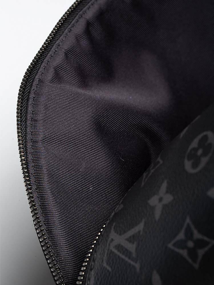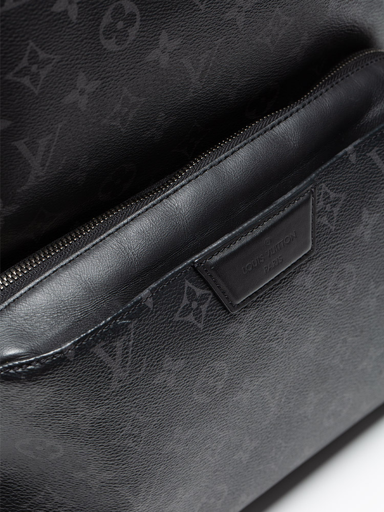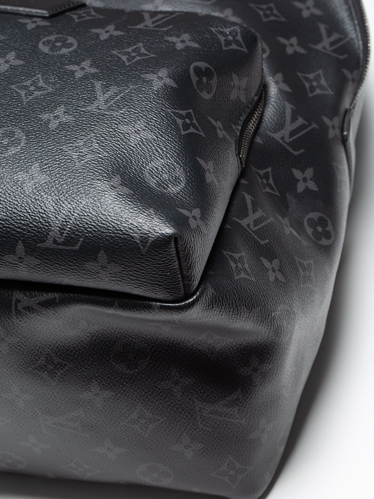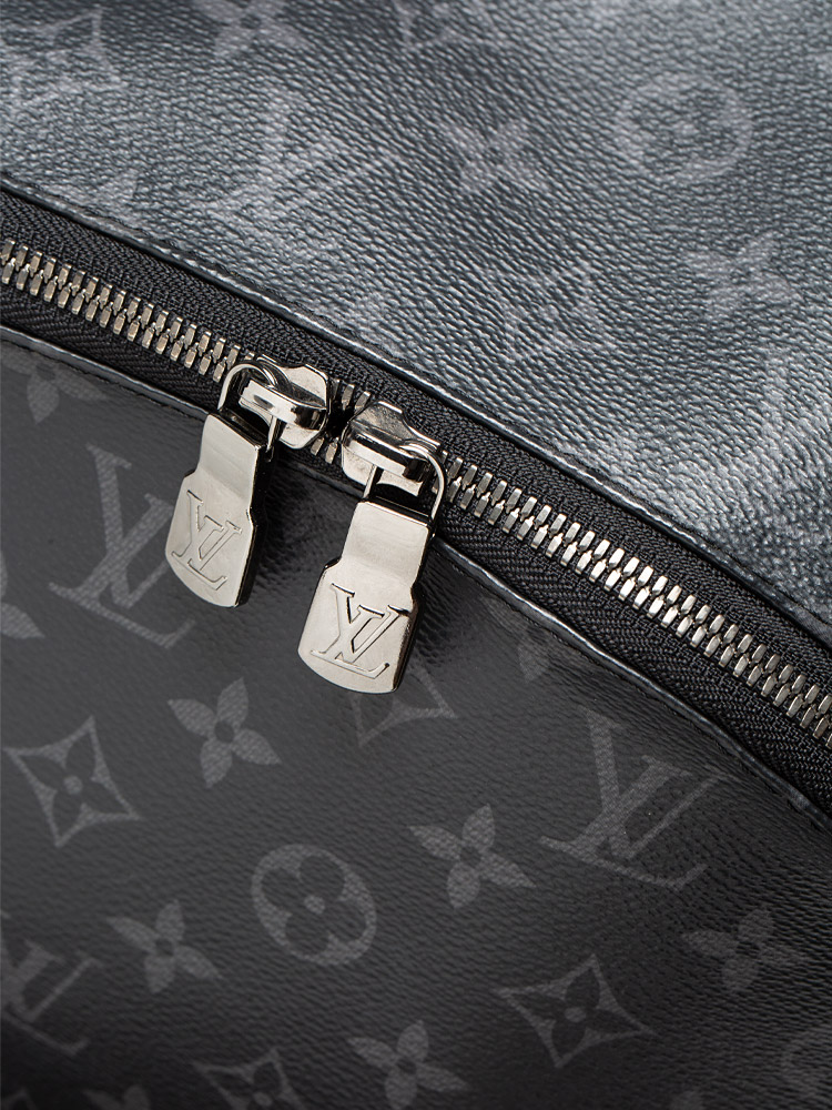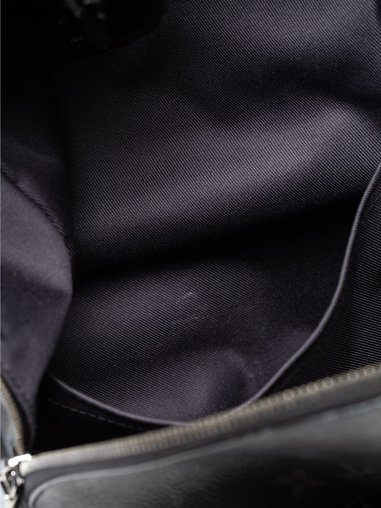 This backpack is crafted of monogram coated canvas in grey and black. Features adjustable shoulder straps, a reinforced top handle, a front zipper pocket, and dark silver hardware. The main zipper opens to a black fabric interior with patch pockets.