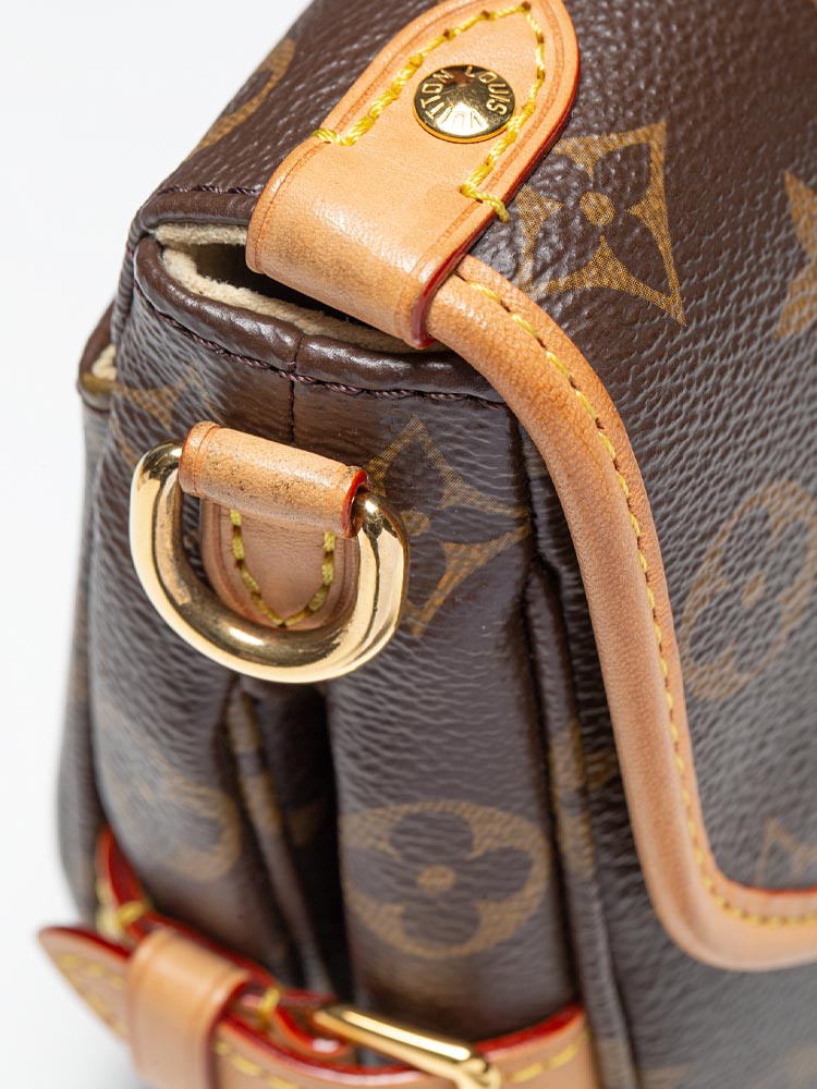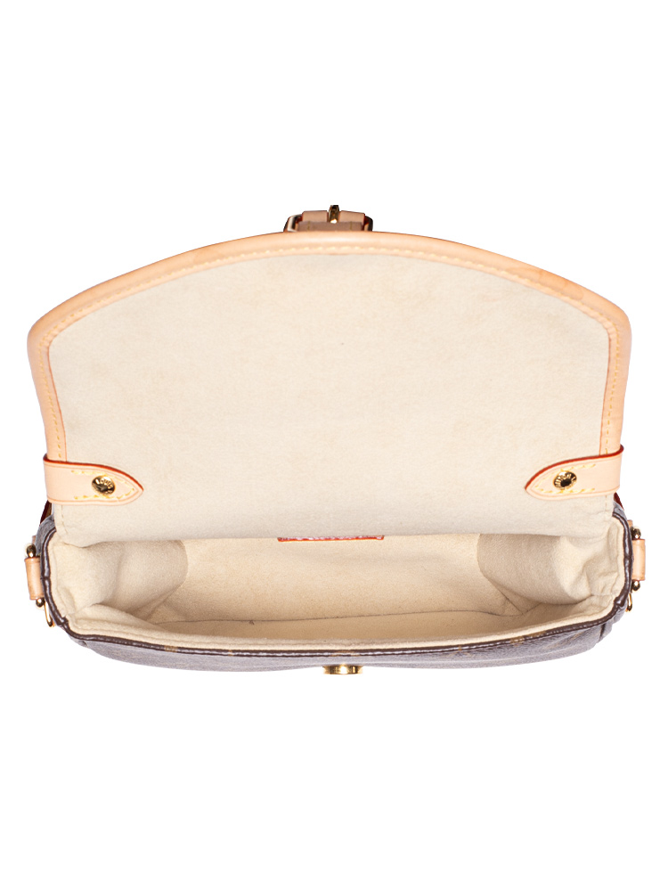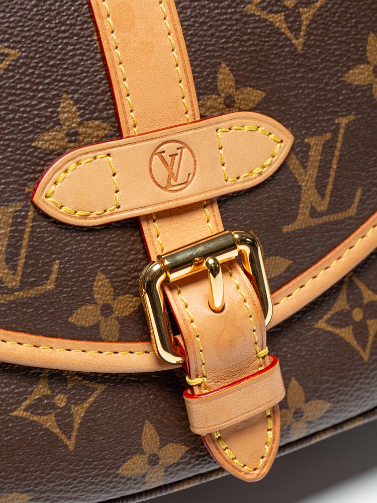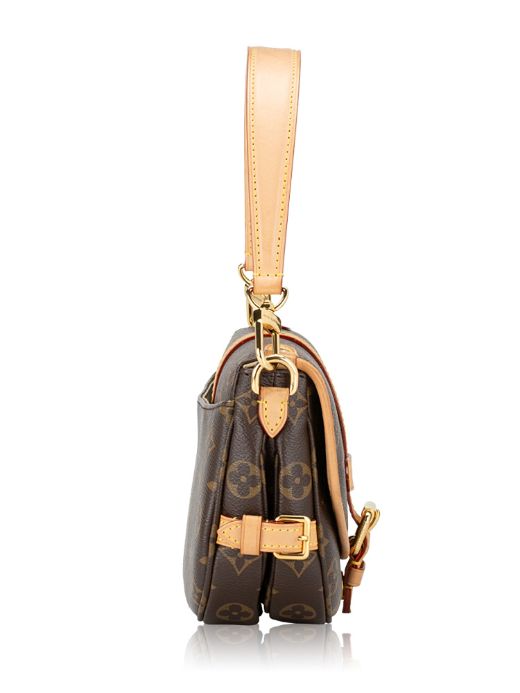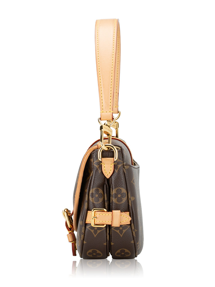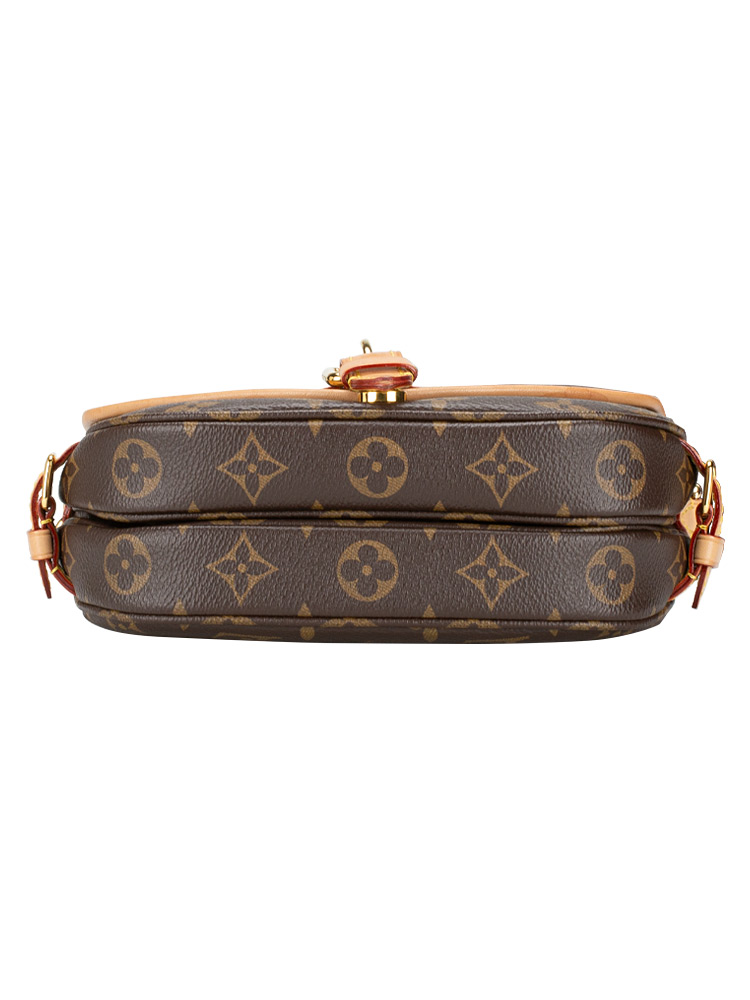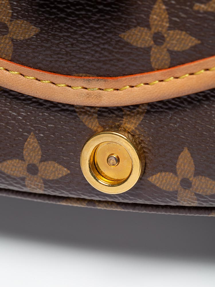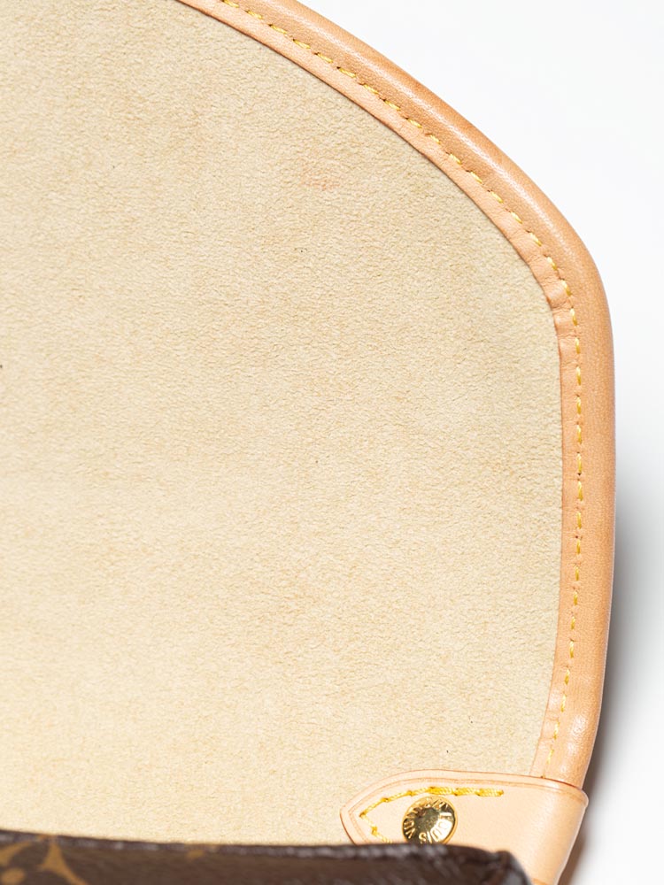 Crafted of Louis Vuitton monogram coated canvas. It features vachetta leather buckles, trim, a vachetta top handle strap, a rear pocket, polished brass hardware, and a magnetic closure. This opens to a microfiber interior.