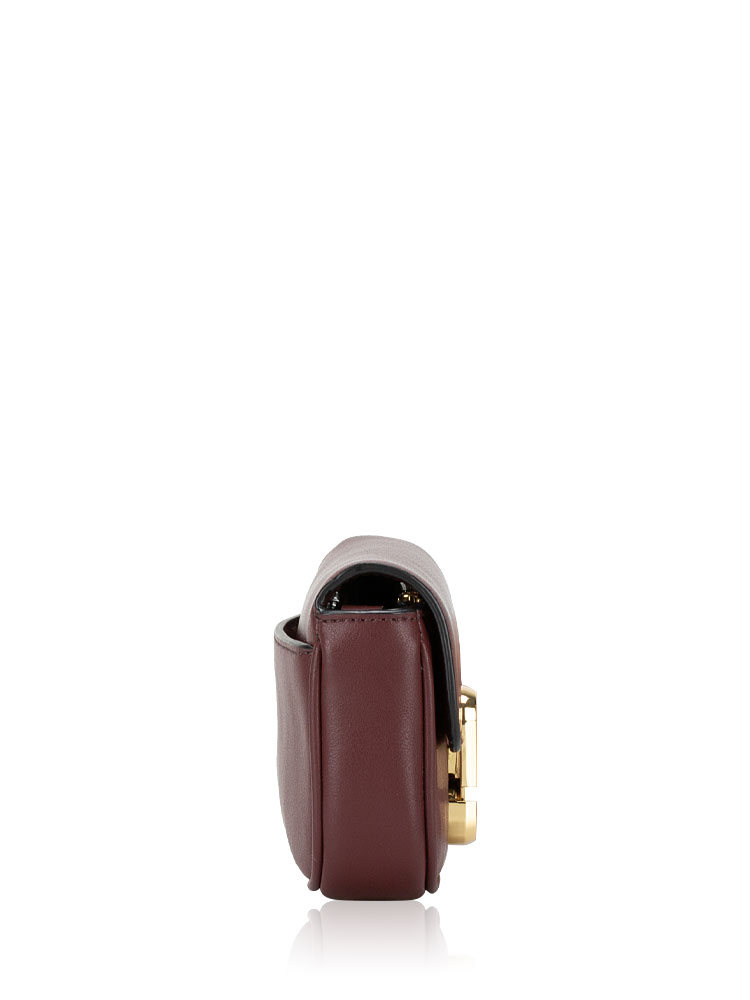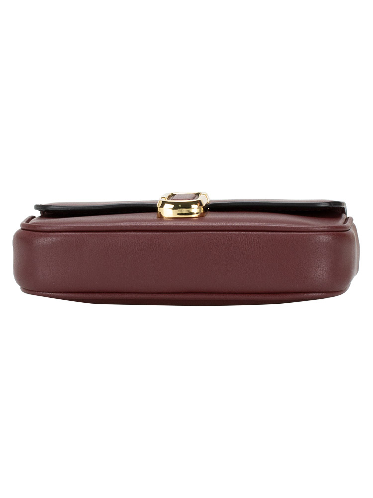 Made of smooth leather. The bag features a magnetic closure that opens to fabric lining with interior three card slots, one zip pocket at front and exterior one slip pocket at back.