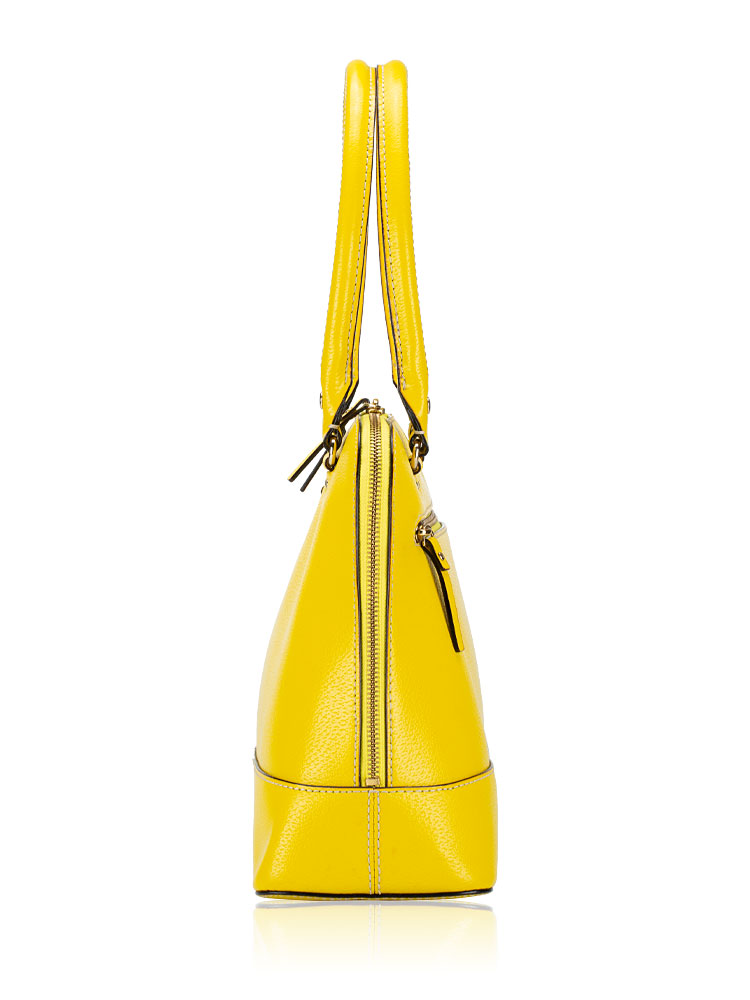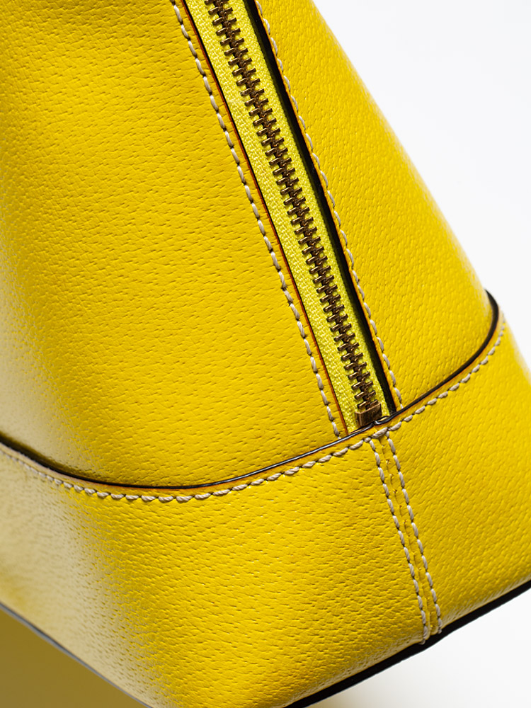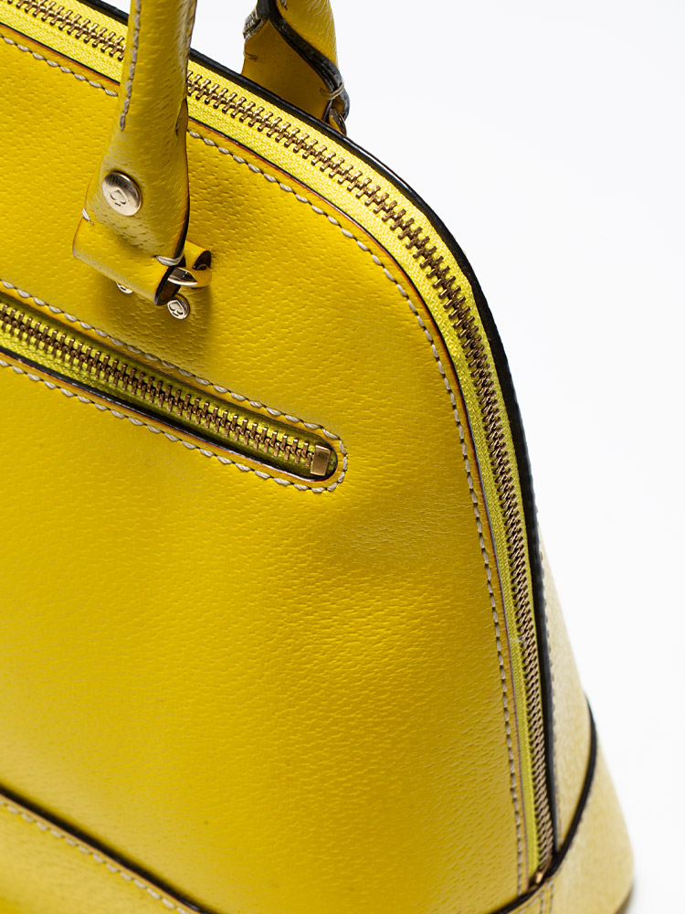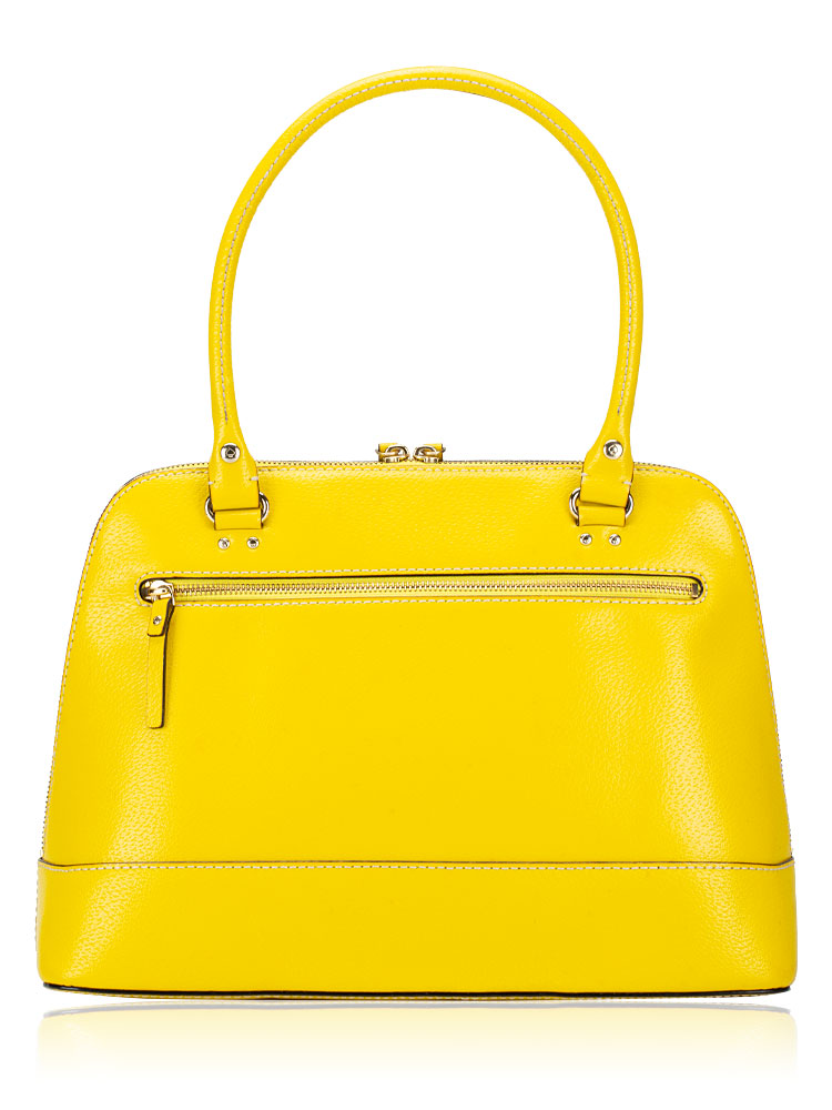 Made of Calfskin leather. The bag features a zip closure that opens to polyester lining with two slip pockets, one zip pocket, exterior one zip pocket at back, double handles drop 23 cm.