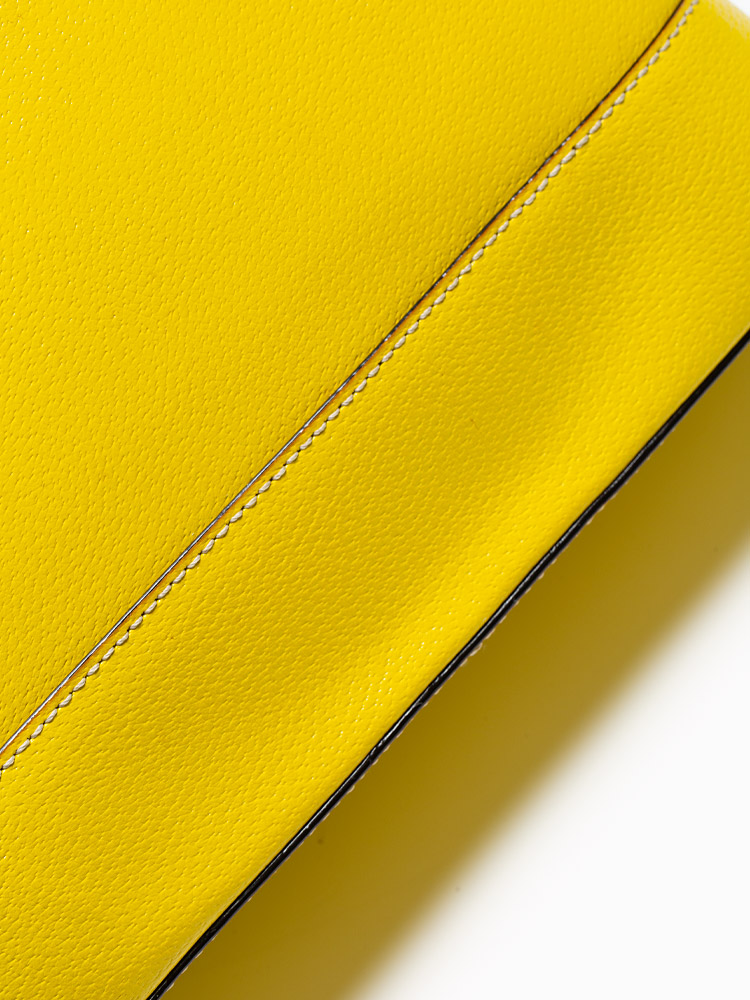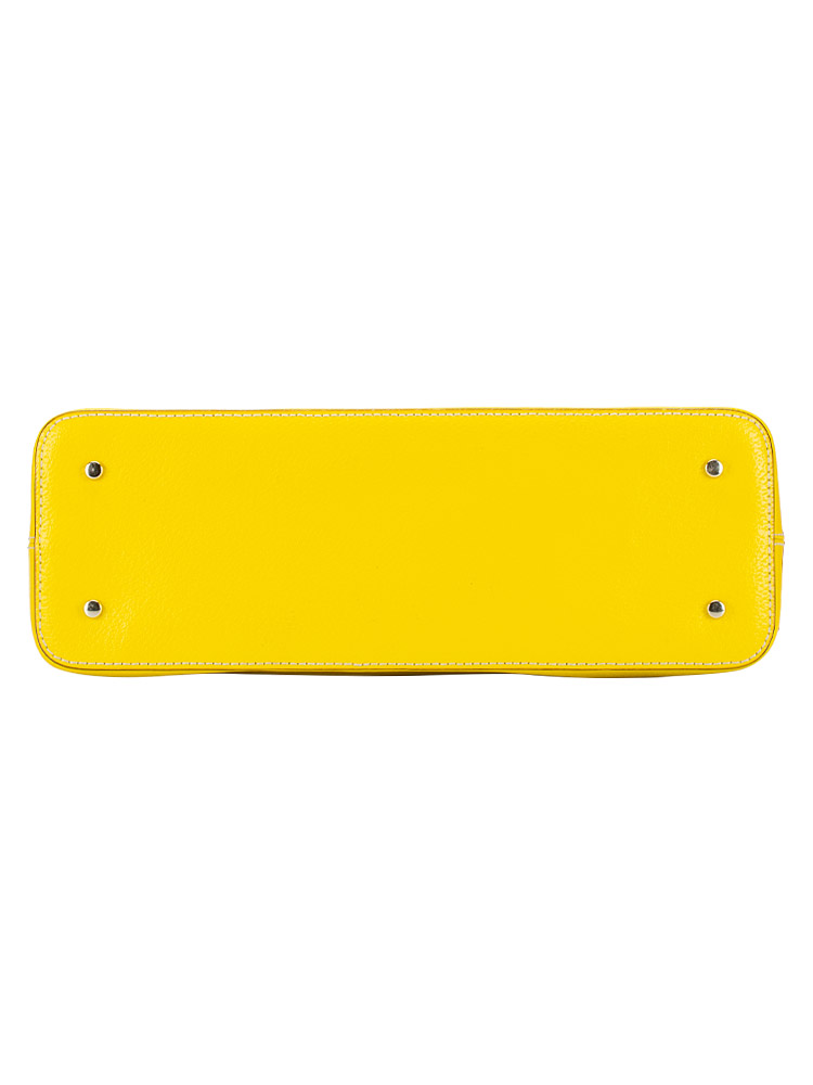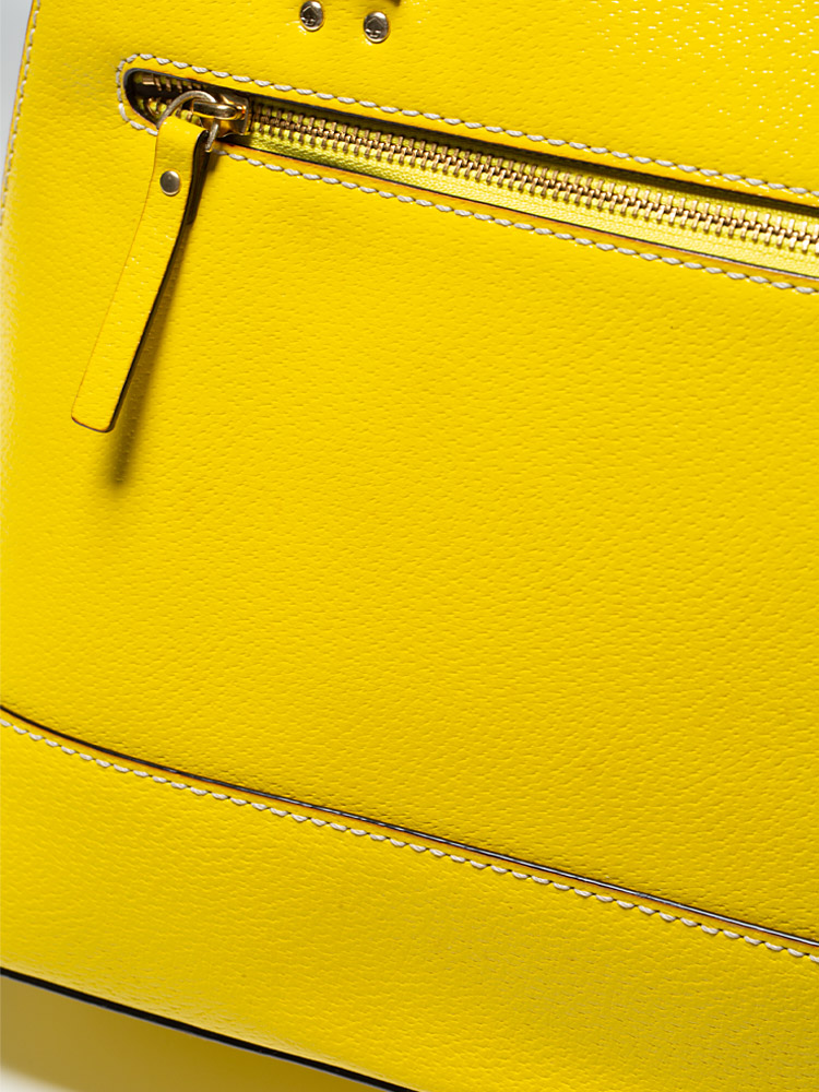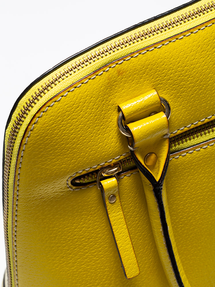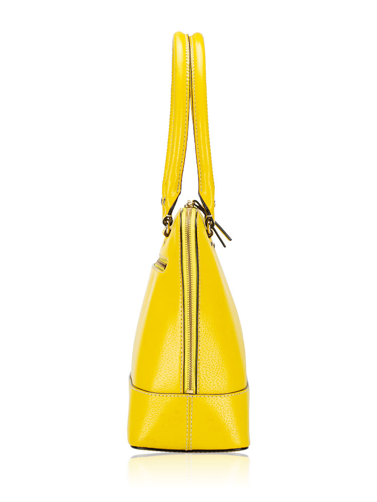 Made of Calfskin leather. The bag features a zip closure that opens to polyester lining with two slip pockets, one zip pocket, exterior one zip pocket at back, double handles drop 23 cm.