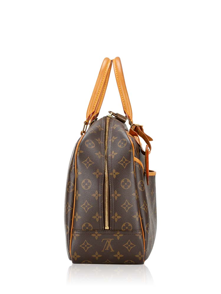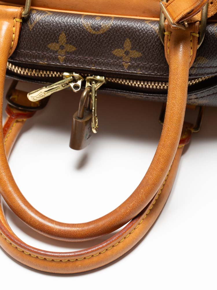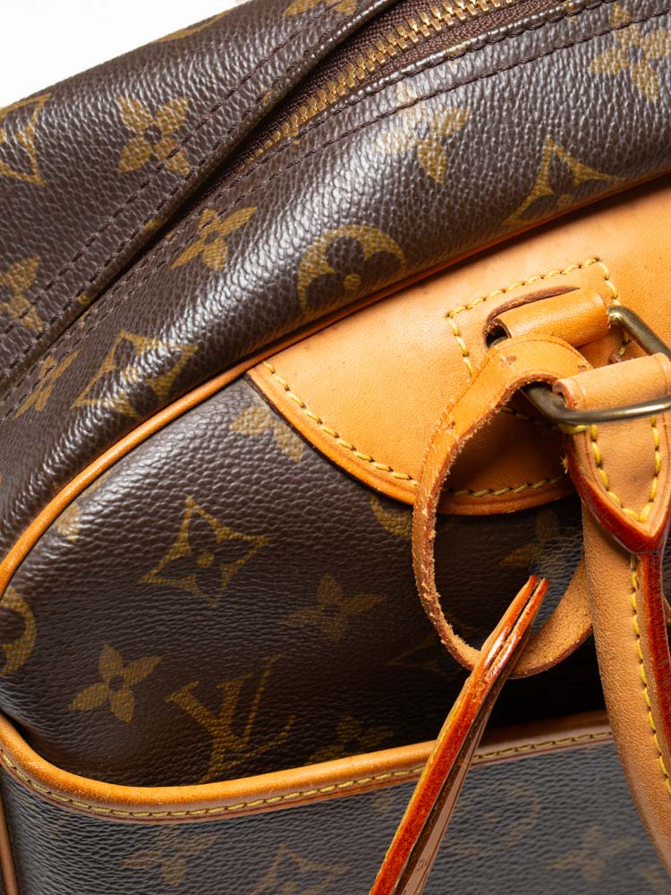 Crafted of monogram on toile canvas. It features a full exterior pocket, vachetta cowhide rolled leather top handles, and trim with polished brass hardware. The wrap-around zipper opens to a coated canvas interior with patch pockets.