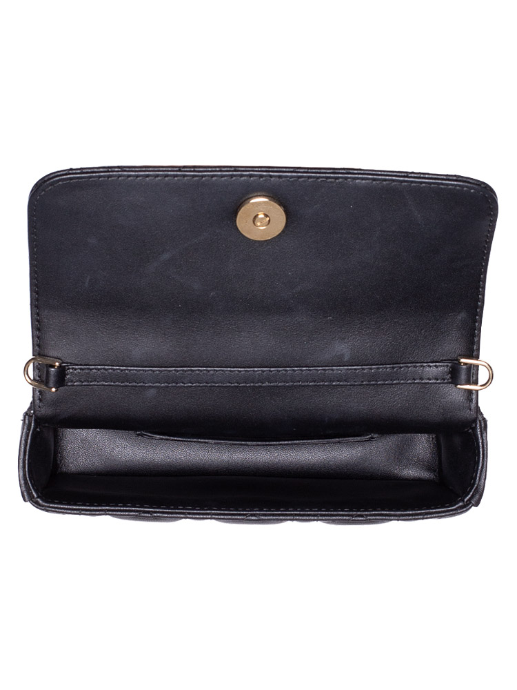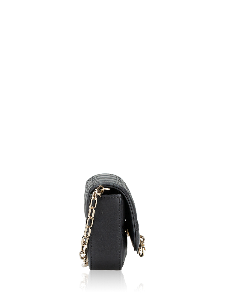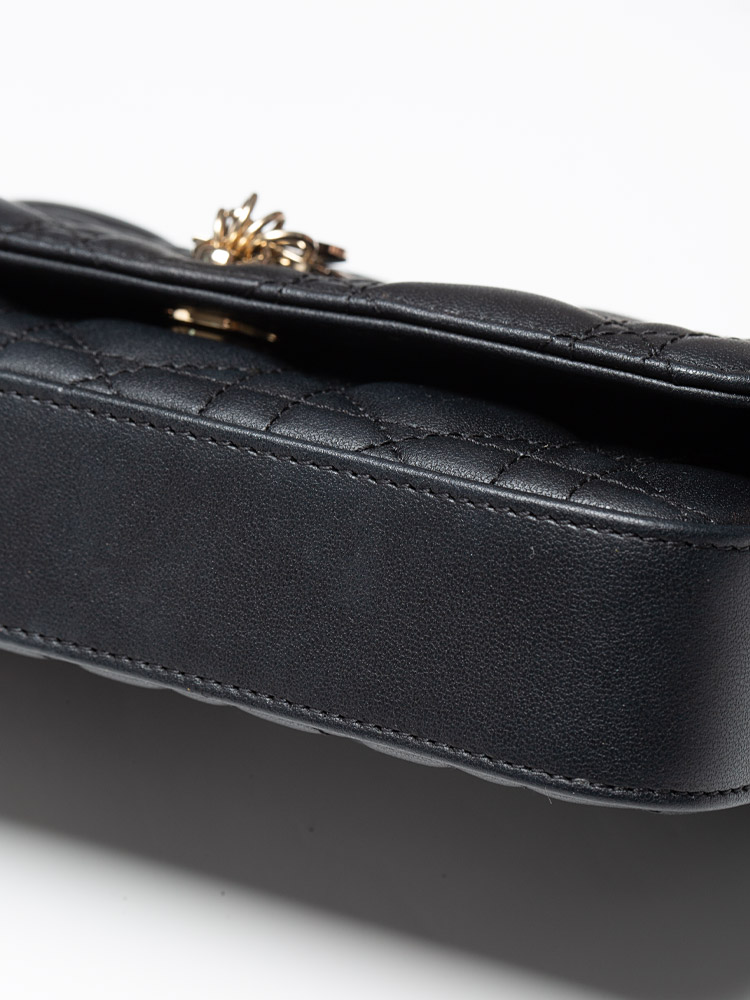 This phone pouch is crafted of geometric quilted lambskin leather in black. Features a removable chain strap, and a front flap that opens to a leather interior with card slots.