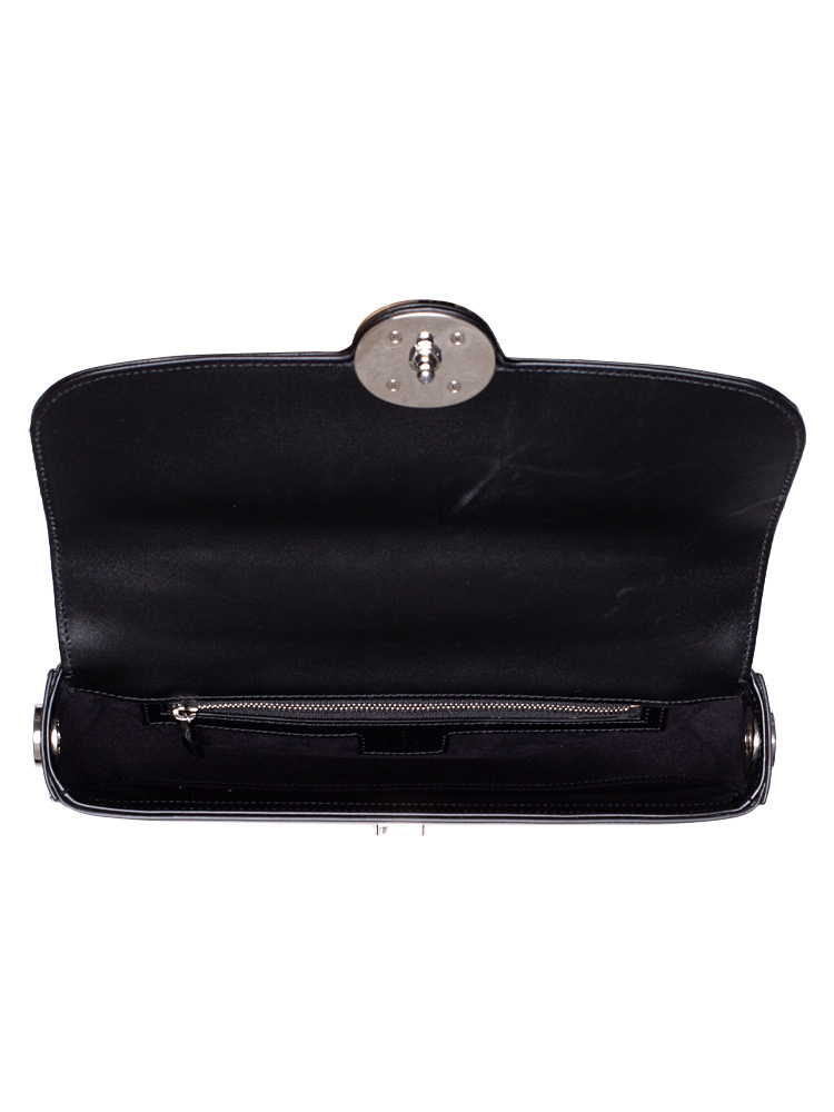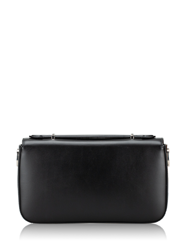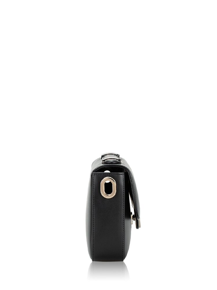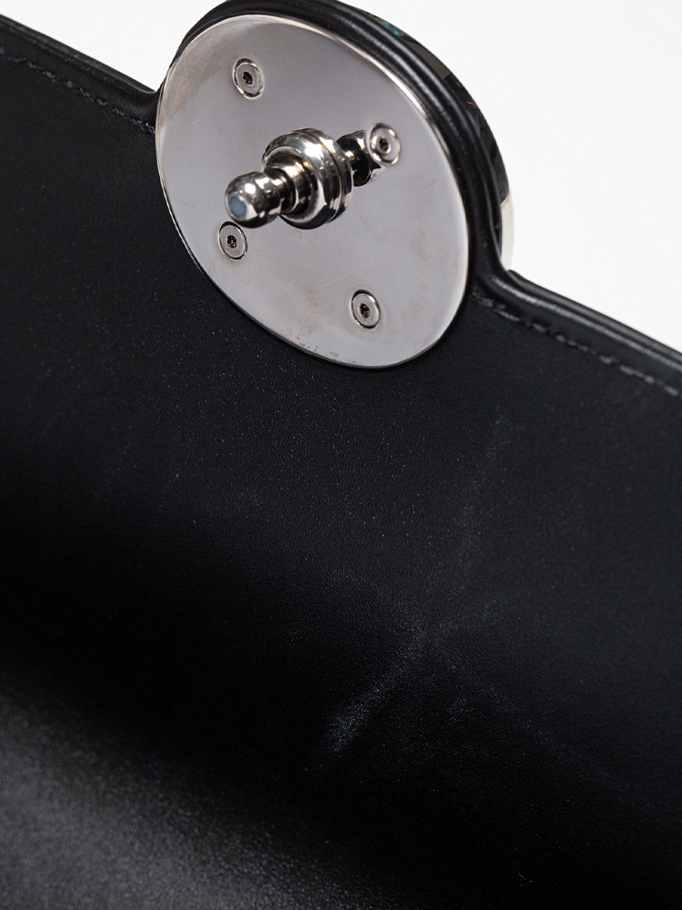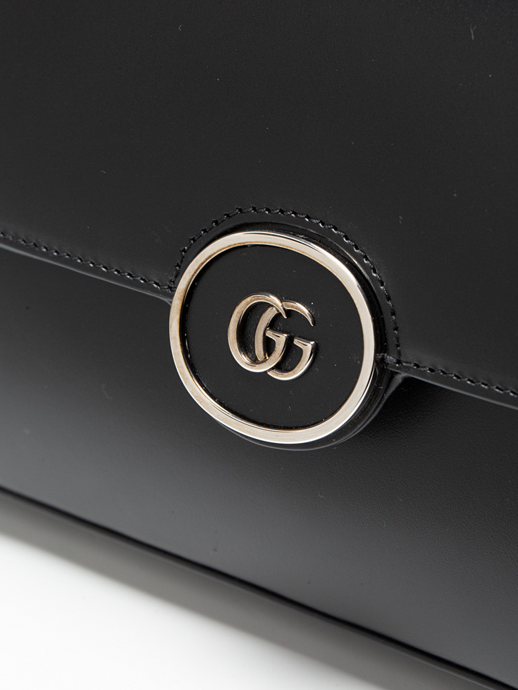 Crafted of calfskin leather. The bag features a leather shoulder strap with palladium-toned hardware and a mini Double G hardware on the crossover flap.