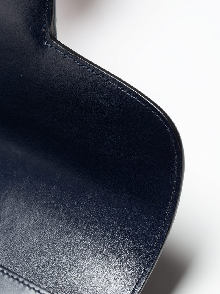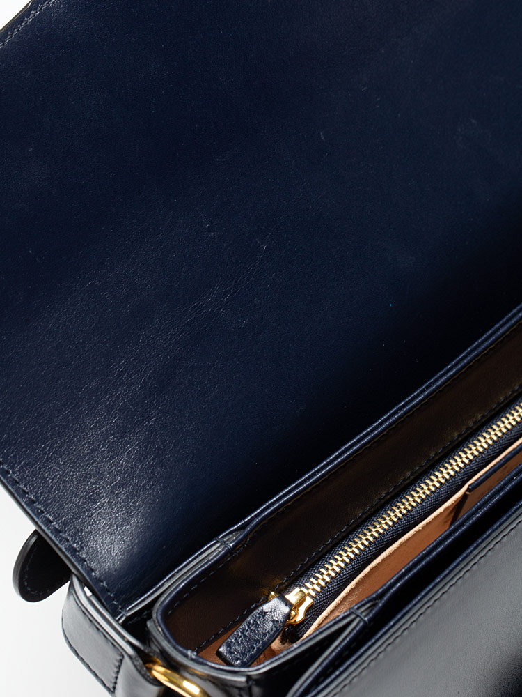 This shoulder bag is crafted of calfskin leather in navy blue. The bag features an adjustable looping leather shoulder strap and a gold horse-bit detail on the front.