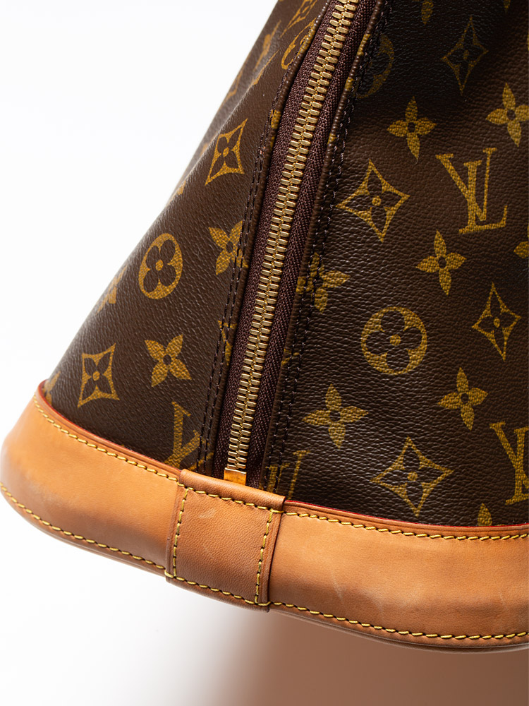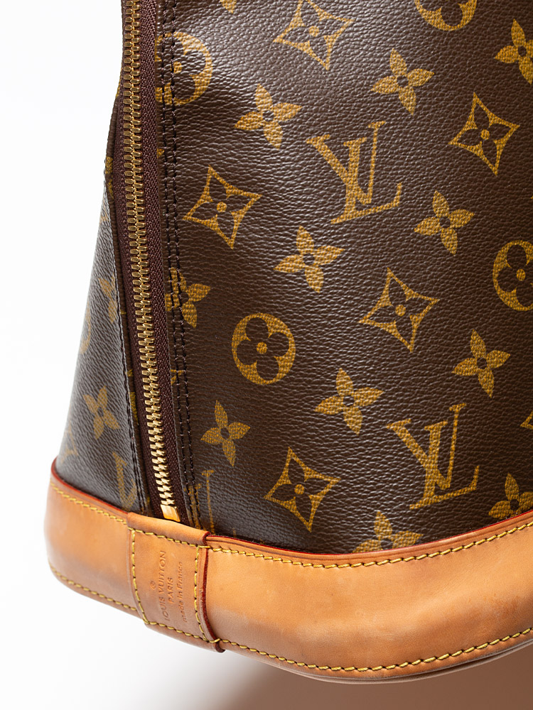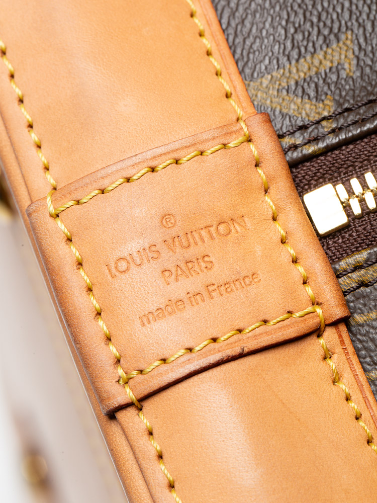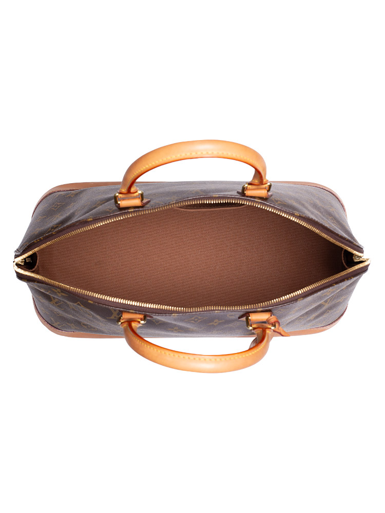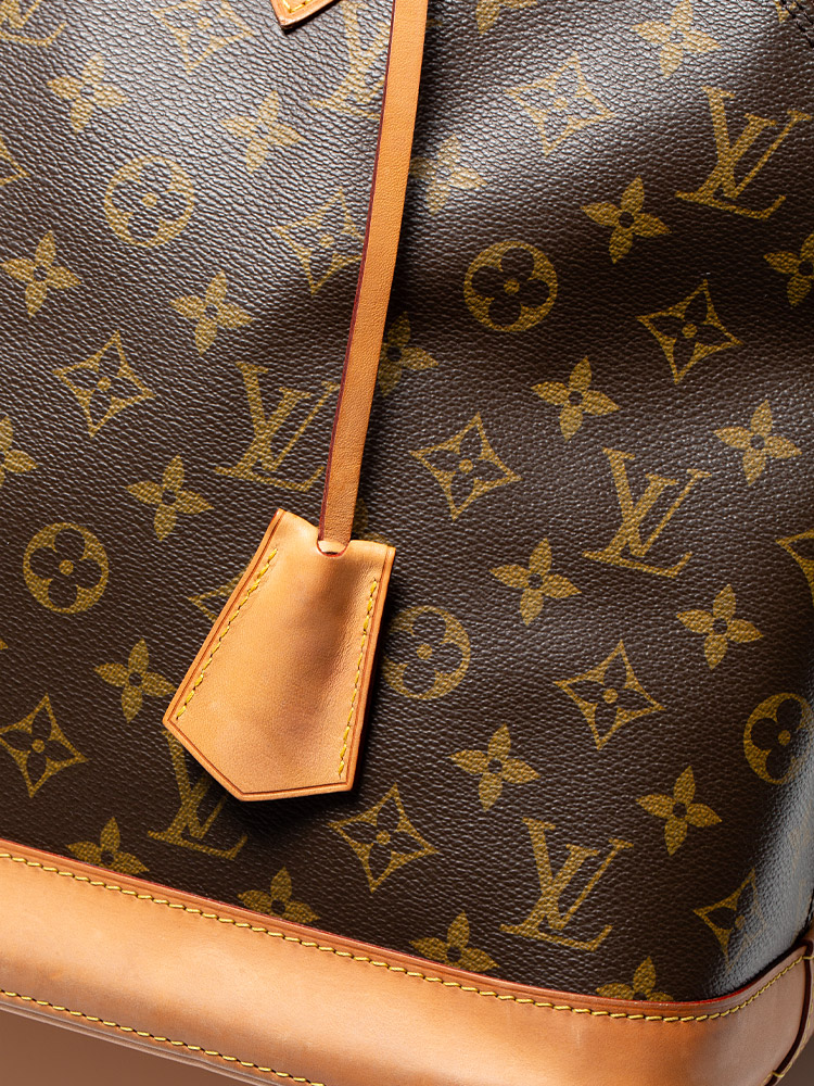 Crafted of signature Louis Vuitton Monogram coated canvas. Features a leather solid base, rolled leather top handles, trim, brass hardware, and top zipper. The top opens to a fabric interior with patch pockets.