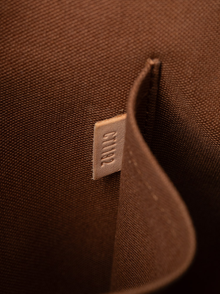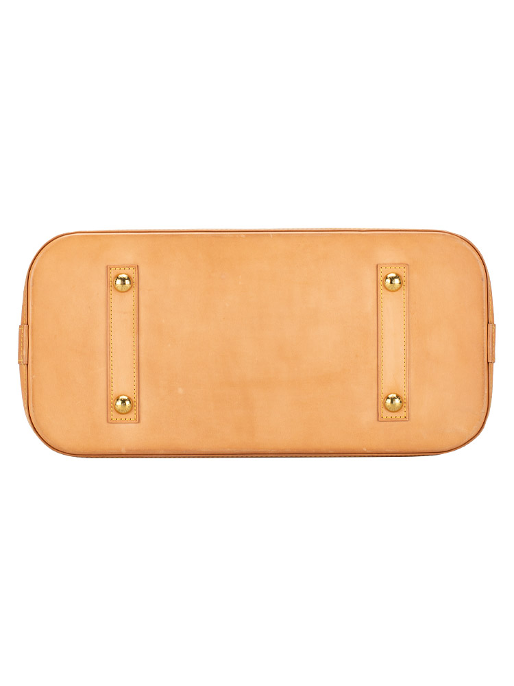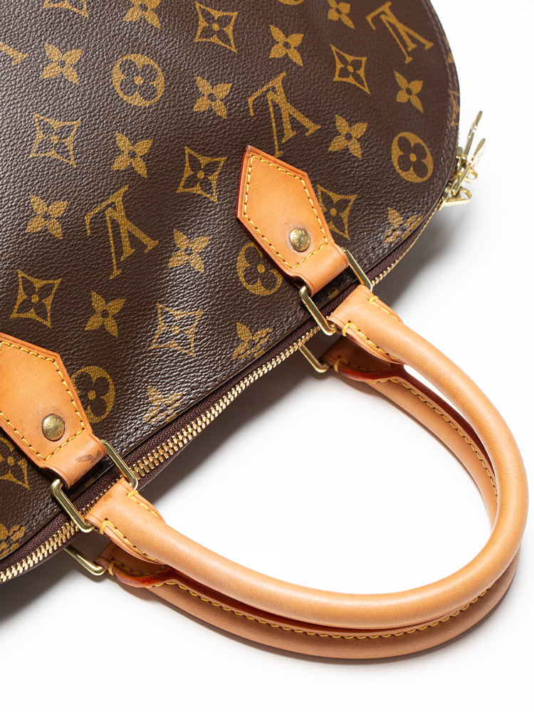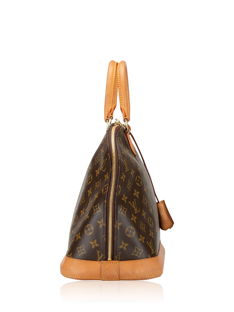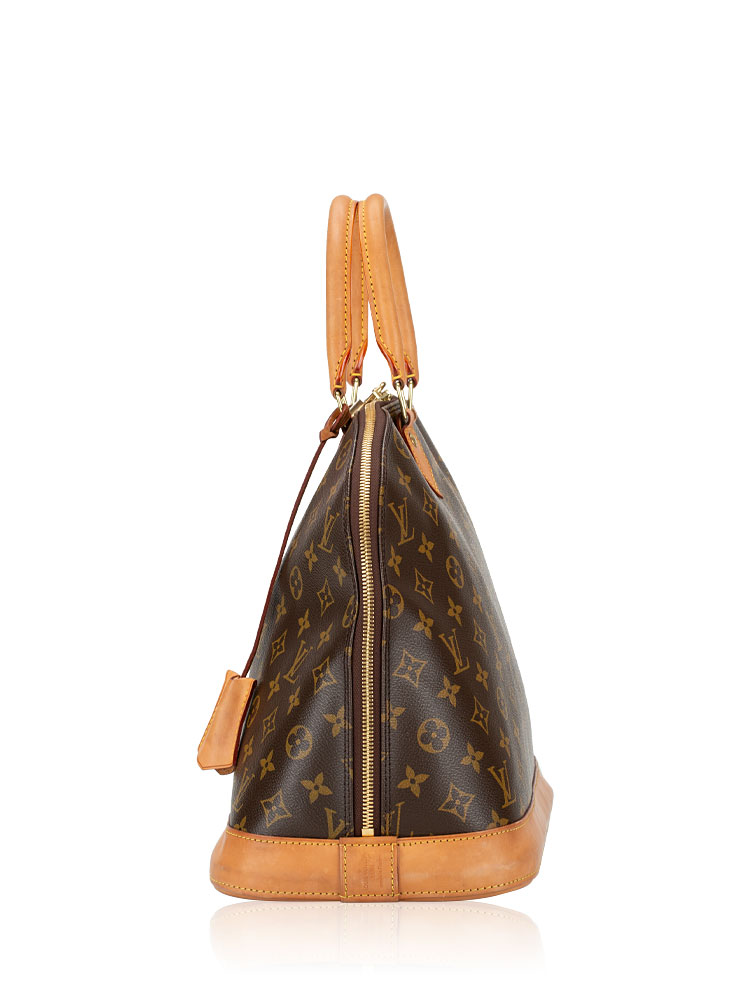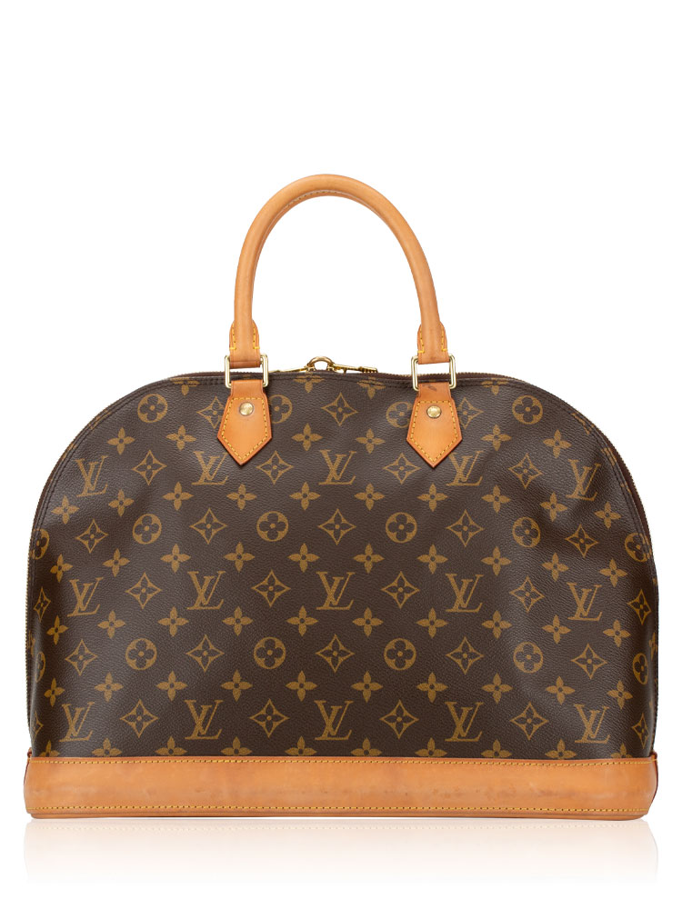 Crafted of signature Louis Vuitton Monogram coated canvas. Features a leather solid base, rolled leather top handles, trim, brass hardware, and top zipper. The top opens to a fabric interior with patch pockets.