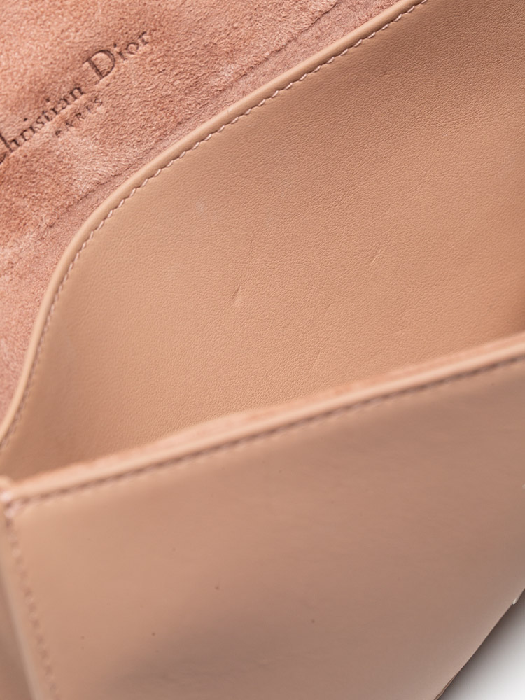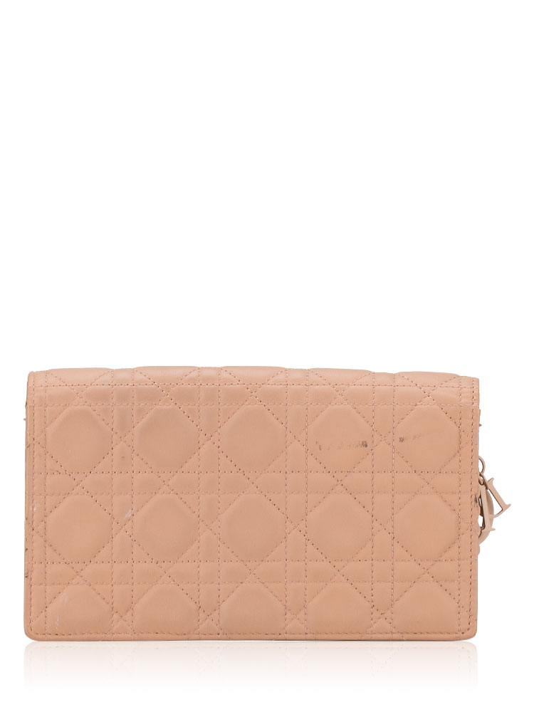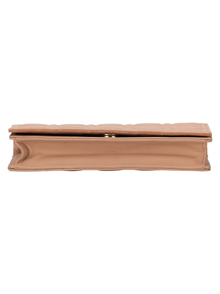 This clutch is crafted of geometric quilted soft leather in nude pink. Features an optional chain shoulder strap and a Dior charm. The facing flap opens to a matching leather and suede interior with two insert card slot panel and a zipper pouch.