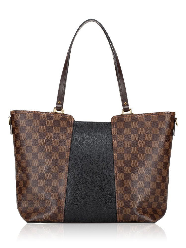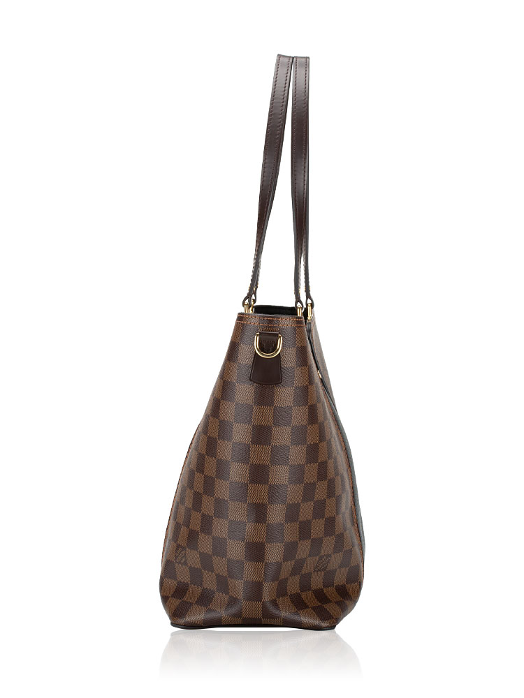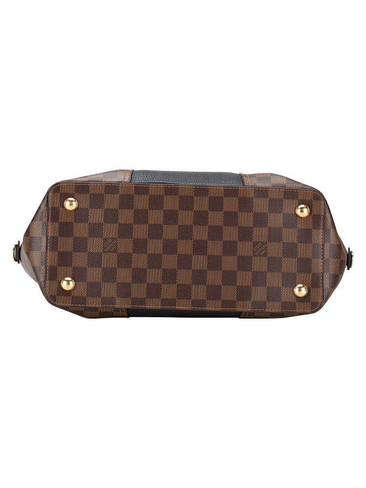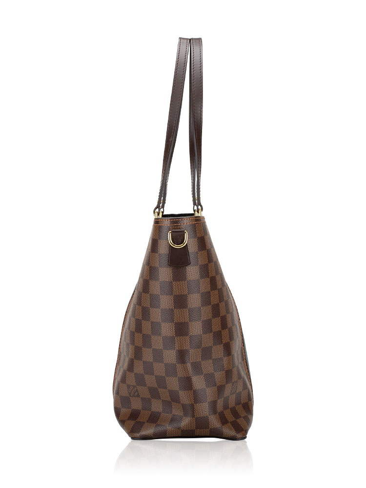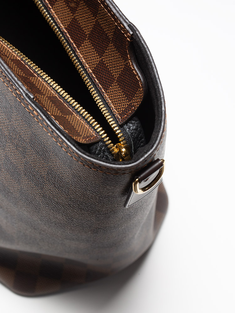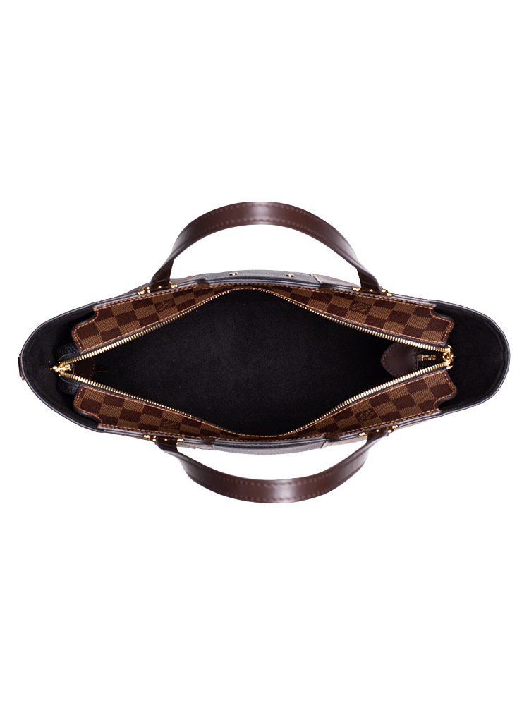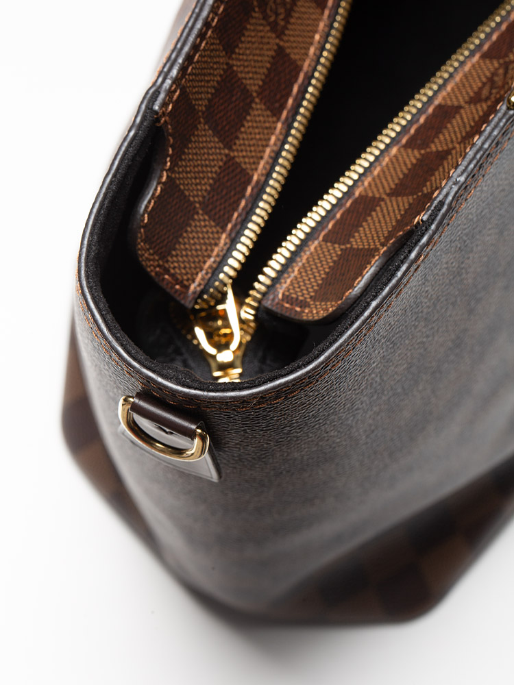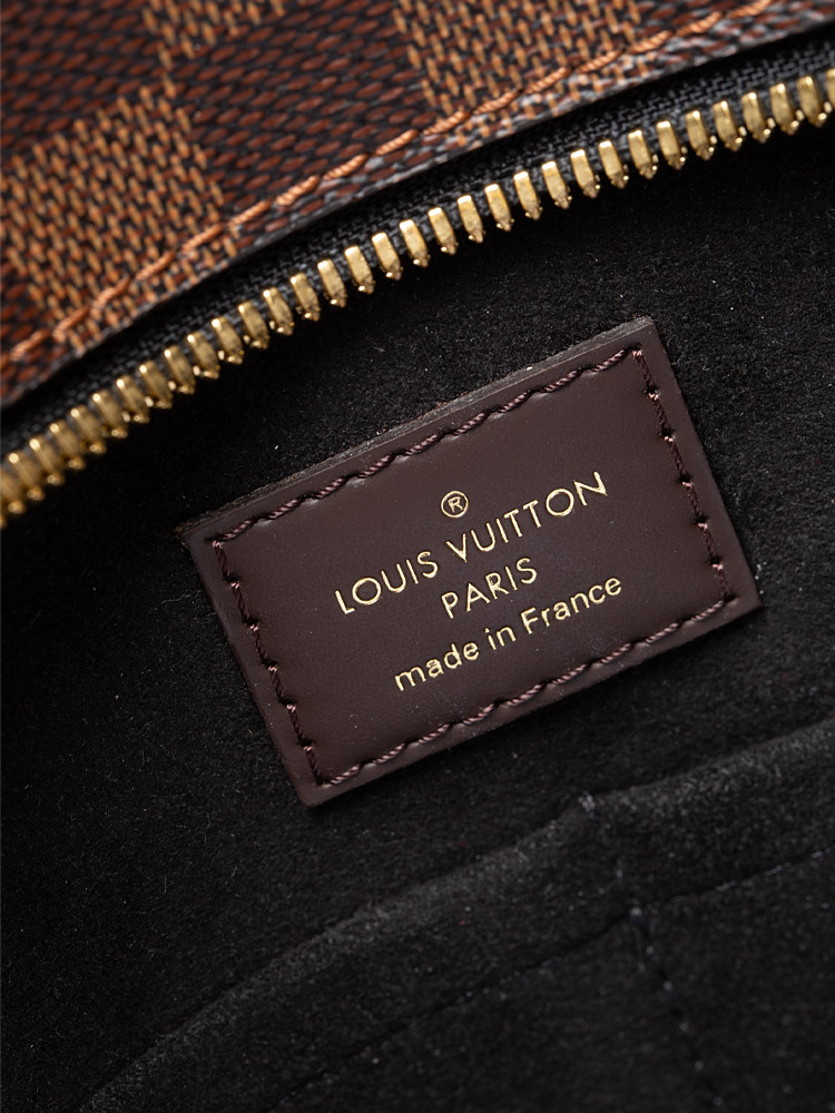 Crafted of signature Louis Vuitton damier coated canvas. The bag features leather trim with polished brass links and an optional shoulder strap. The top zippers opens to a suede lining with patch pockets.