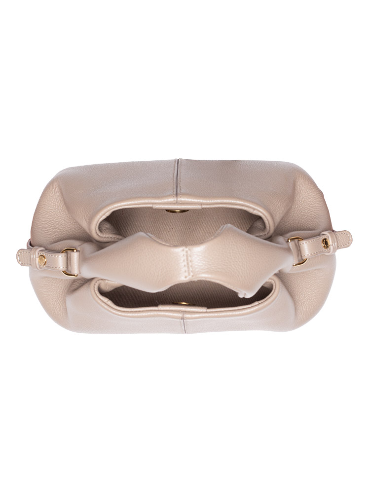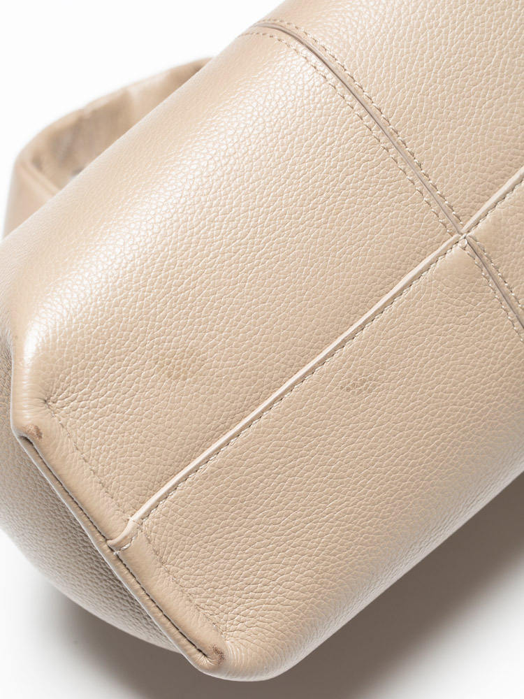 This bag is crafted of textured calfskin material. It features leather top handle, an adjustable shoulder strap, and gold tone magnetic flap closure, that opens to a fabric interior.