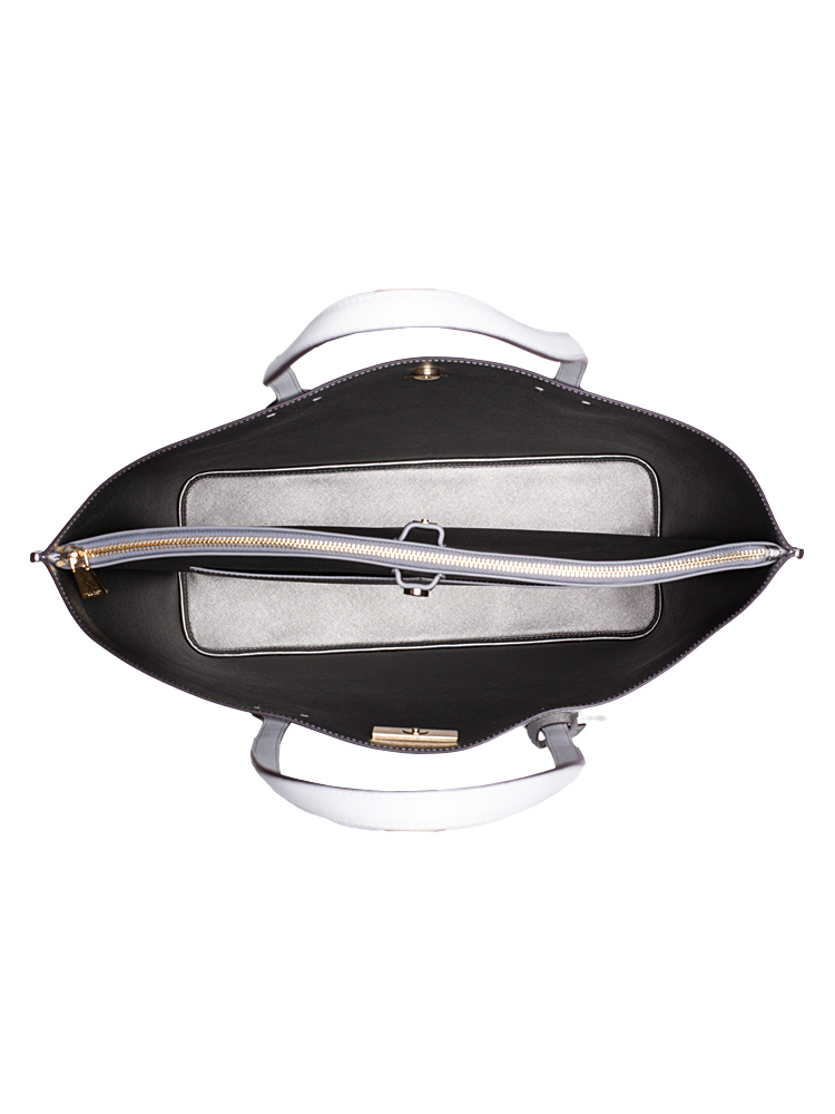 Made of crossgrain leather. The bag features a magnetic closure that opens to crossgrain leather and two way script logo lining with middle zip pocket compartments and interior two slip pockets.
