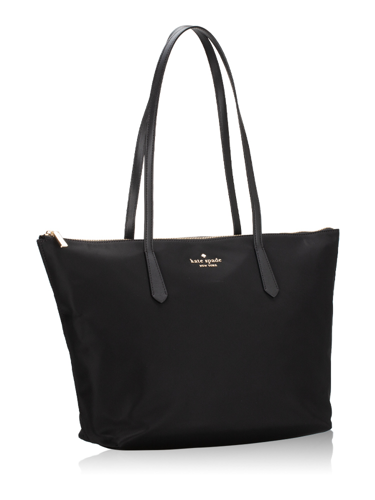 Made of nylon with leather trim. The bag features a zip closure that opens to polyester lining with two slip pockets, one zip pocket, double handles strap drop 30 cm.
