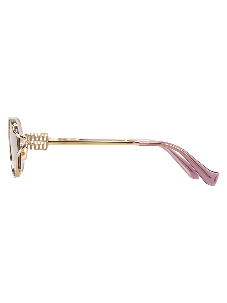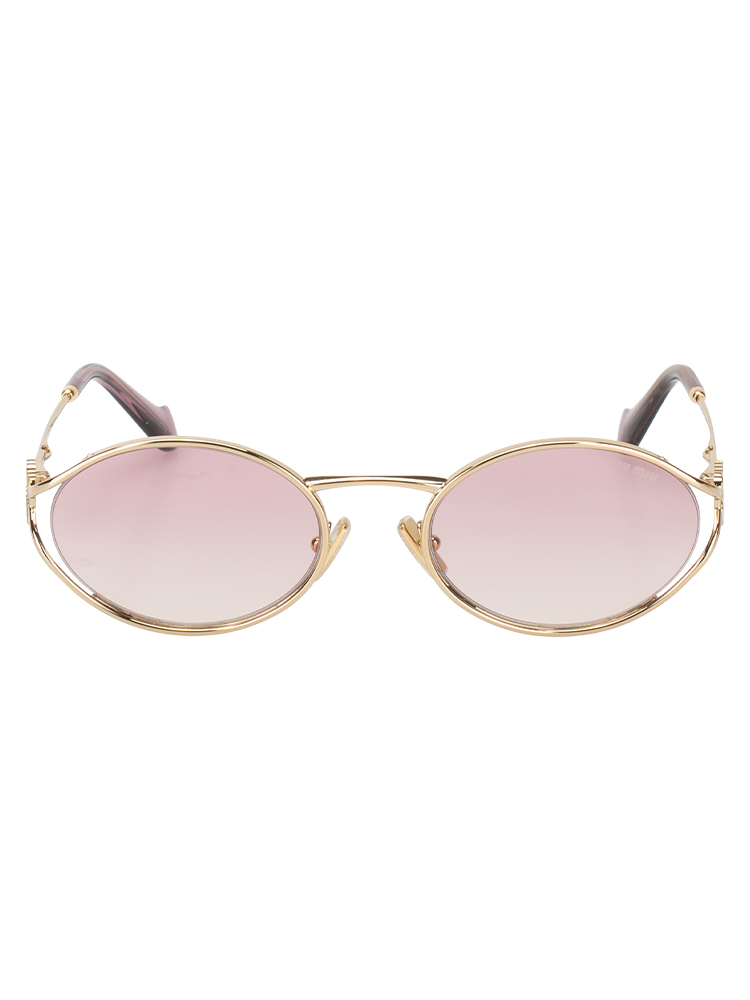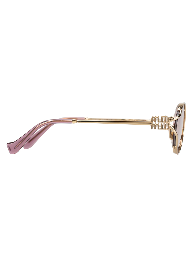 Crafted of metal. The sunglasses feature a oval frame with violet lenses with the Miumiu logo on the temples.