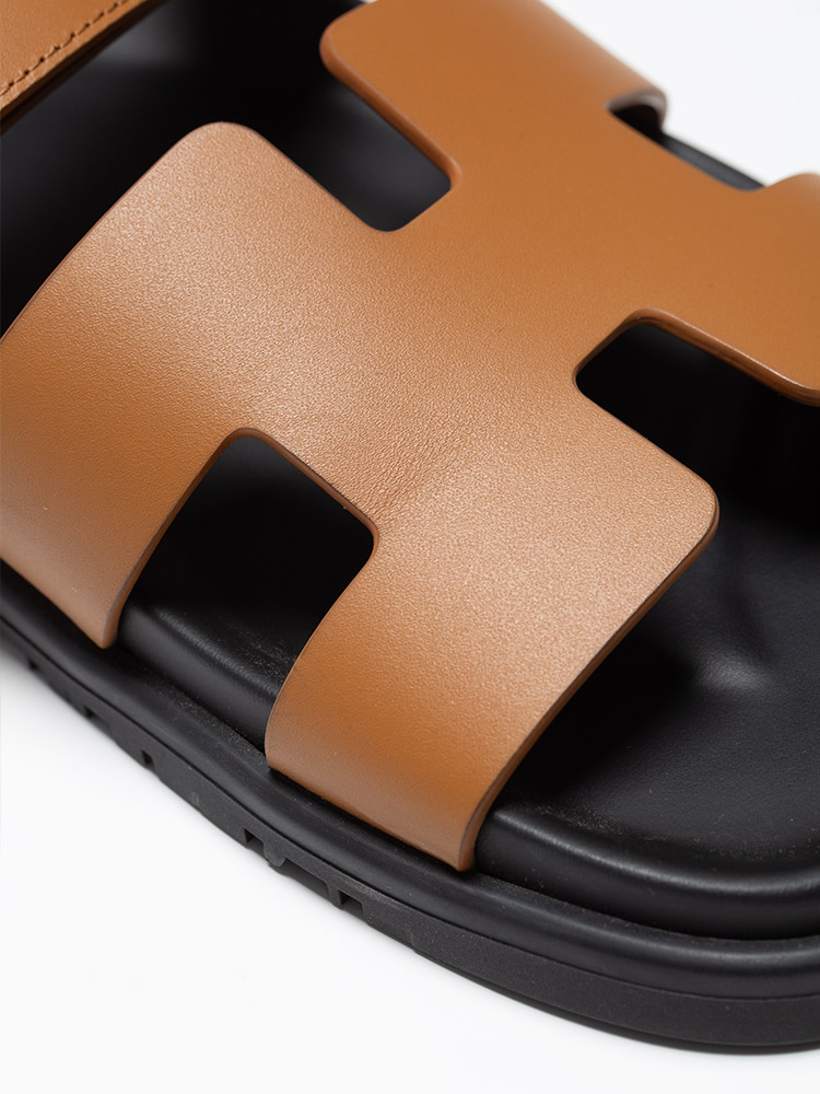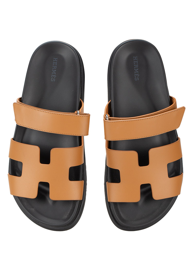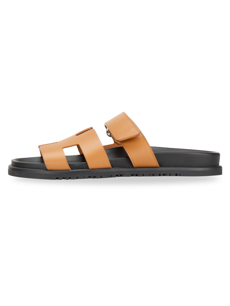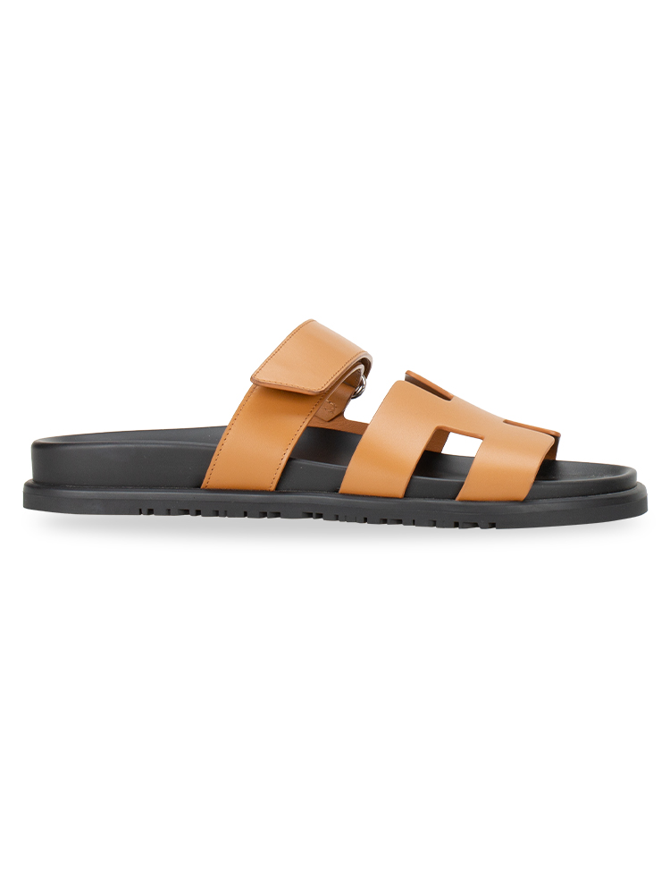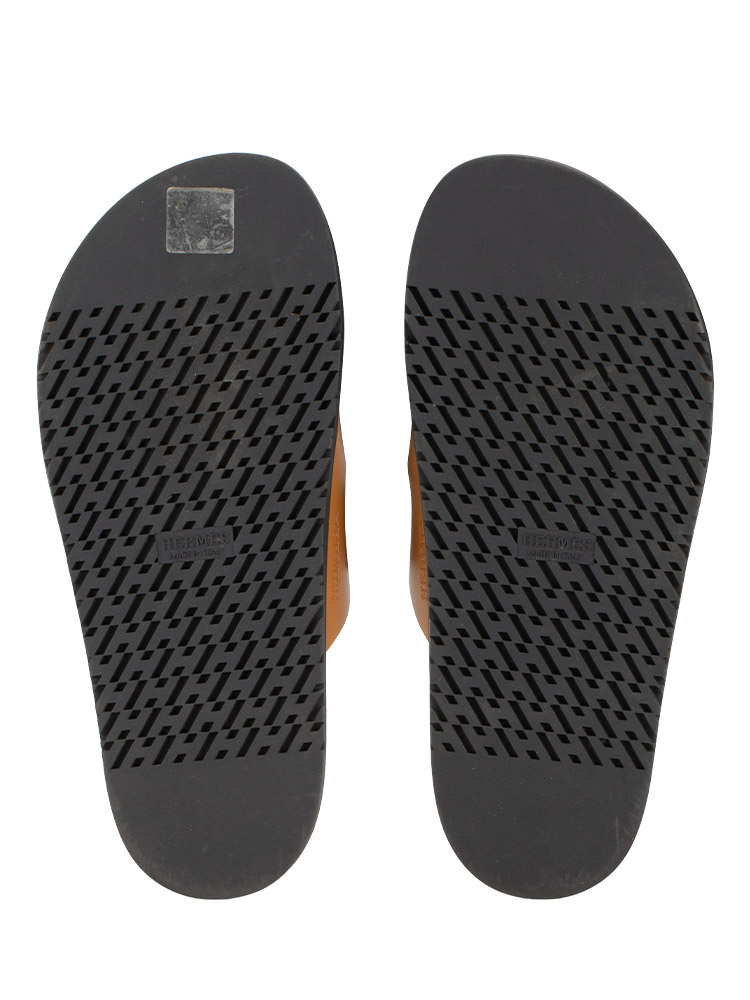 These sandals are crafted of Swift calfskin leather. They feature a toe strap across-over large Hermes H and an adjustable strap.