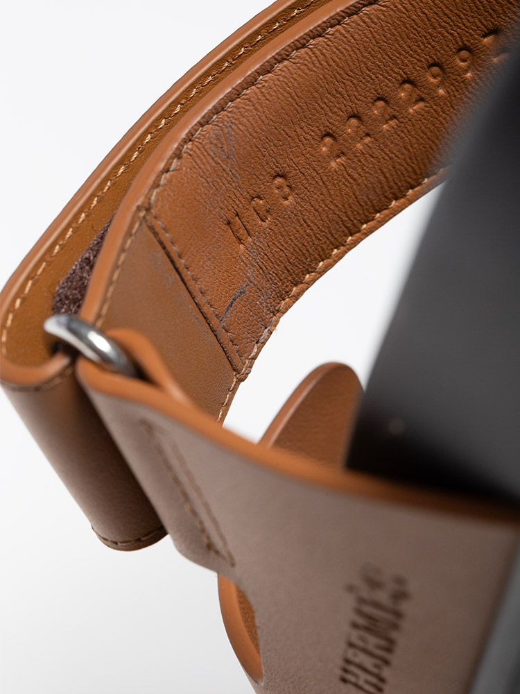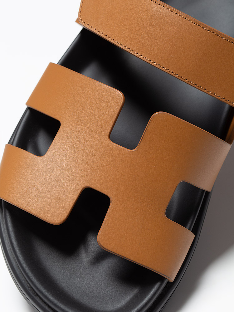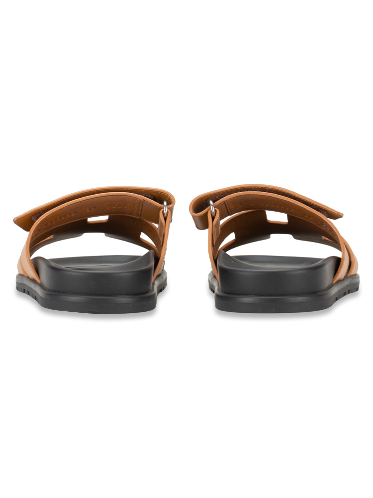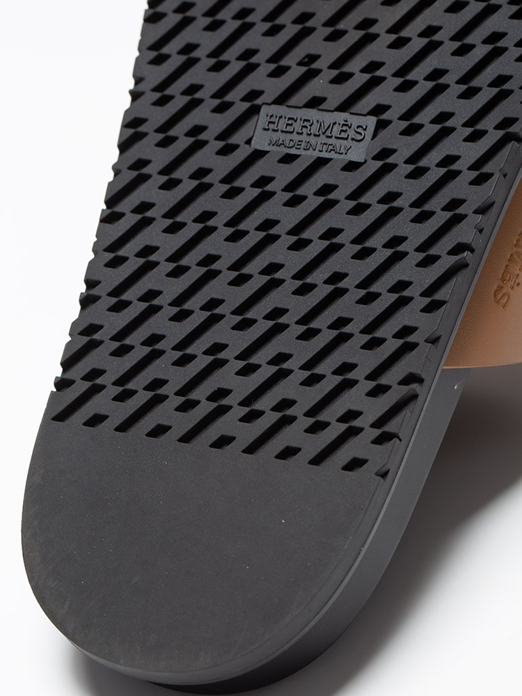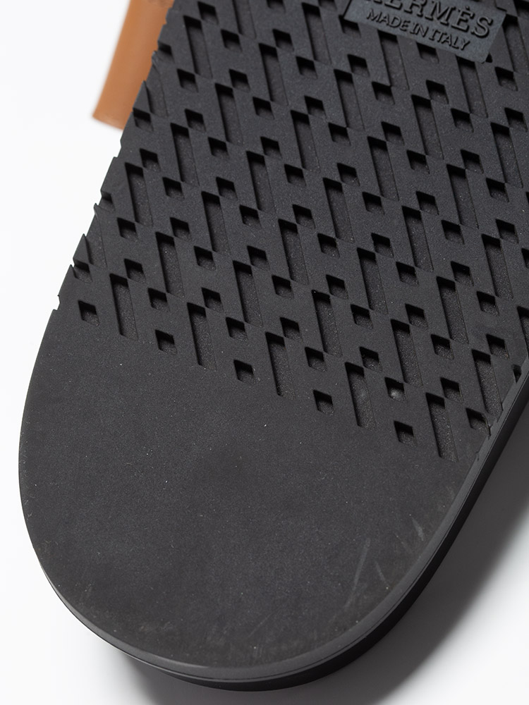 These sandals are crafted of Swift calfskin leather. They feature a toe strap across-over large Hermes H and an adjustable strap.
