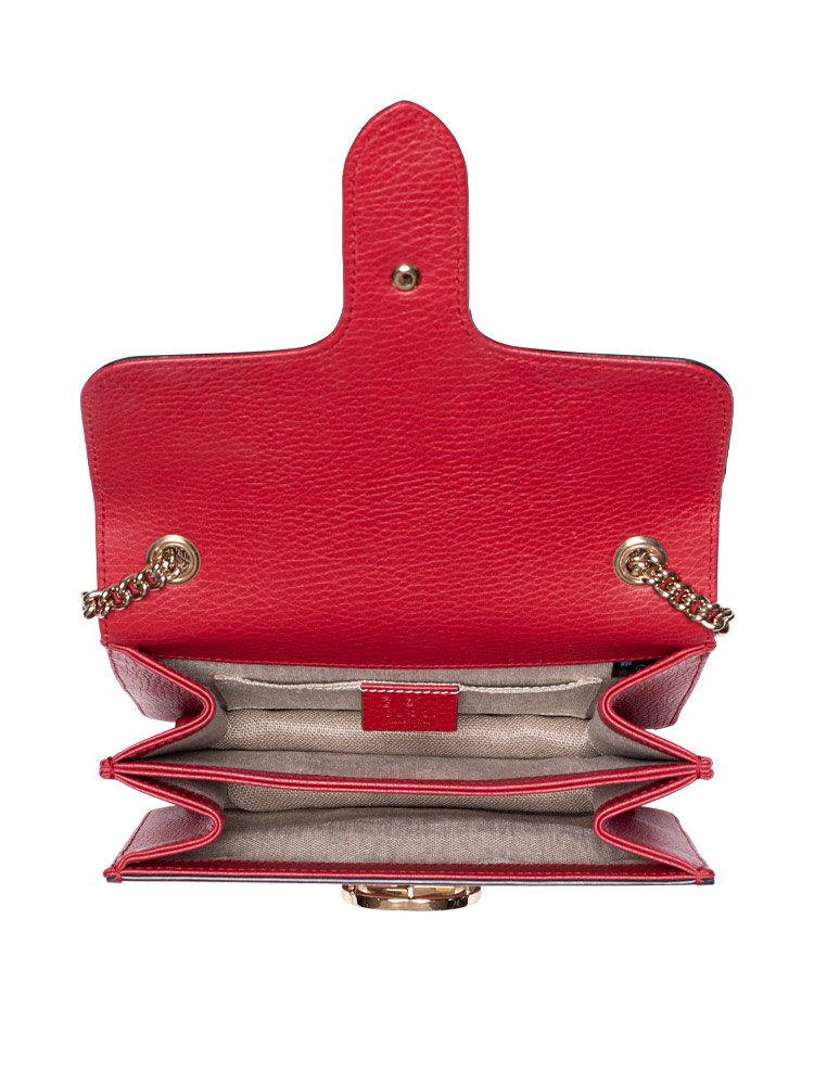 Crafted of calfskin material. It features chain strap with leather pad, and a matching gold interlocking GG flip-lock on the crossover flap. This opens to a partitioned fabric interior with a patch pocket.